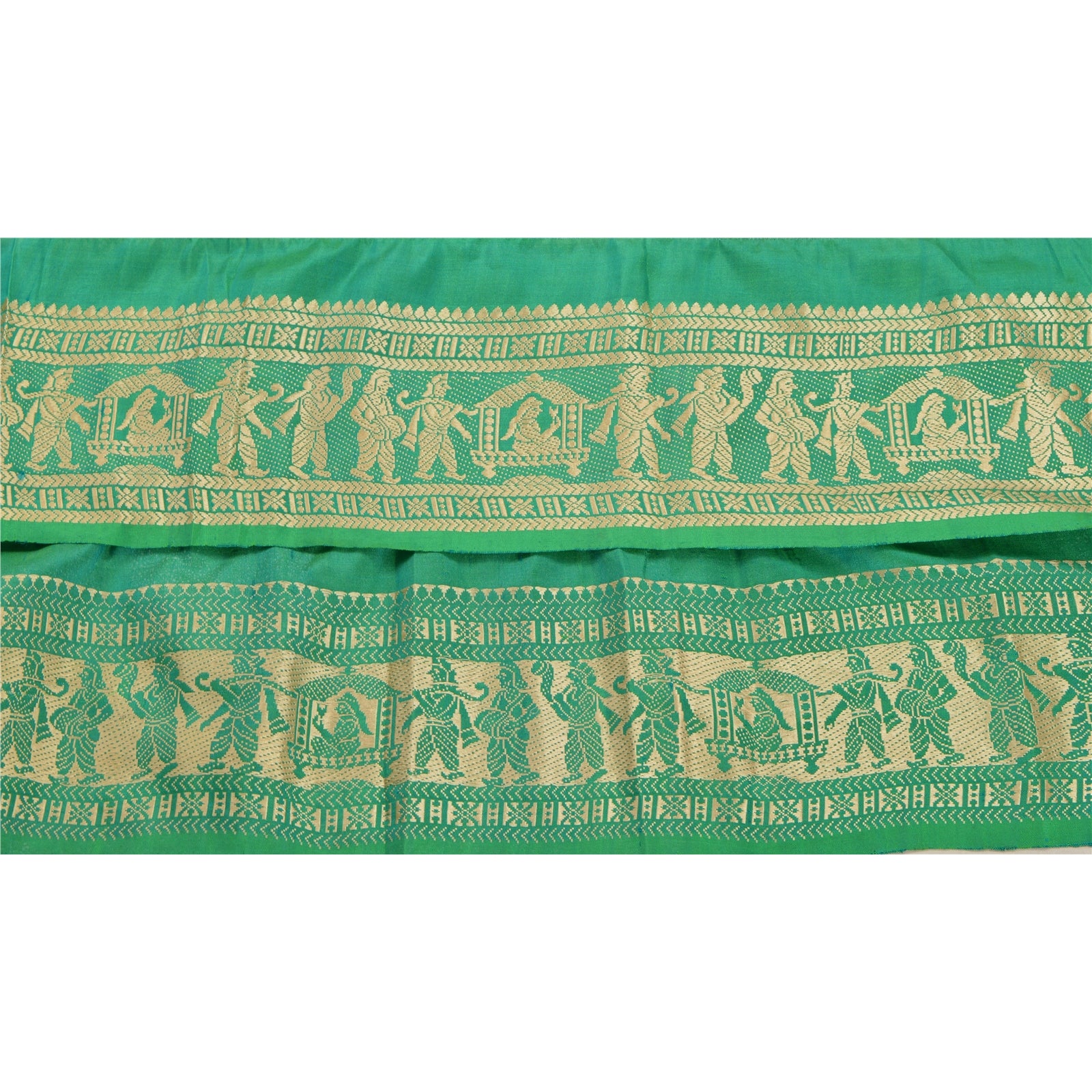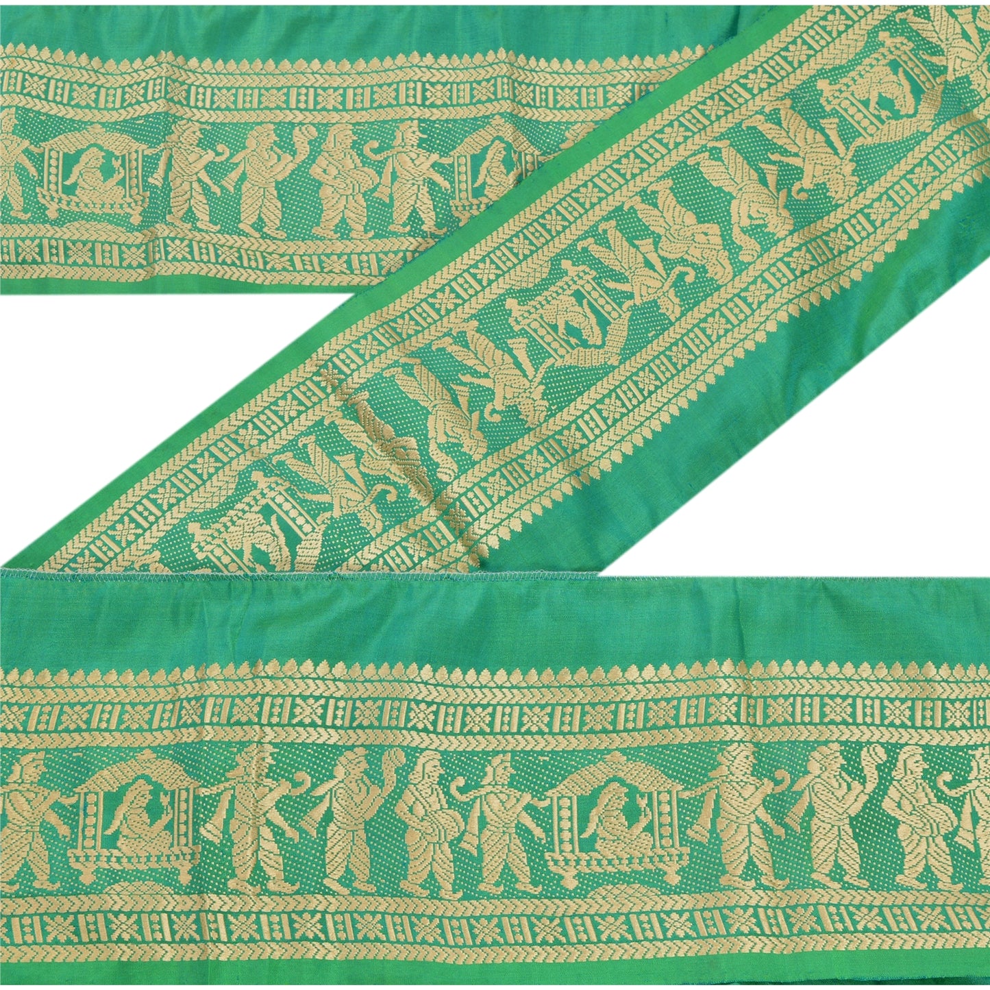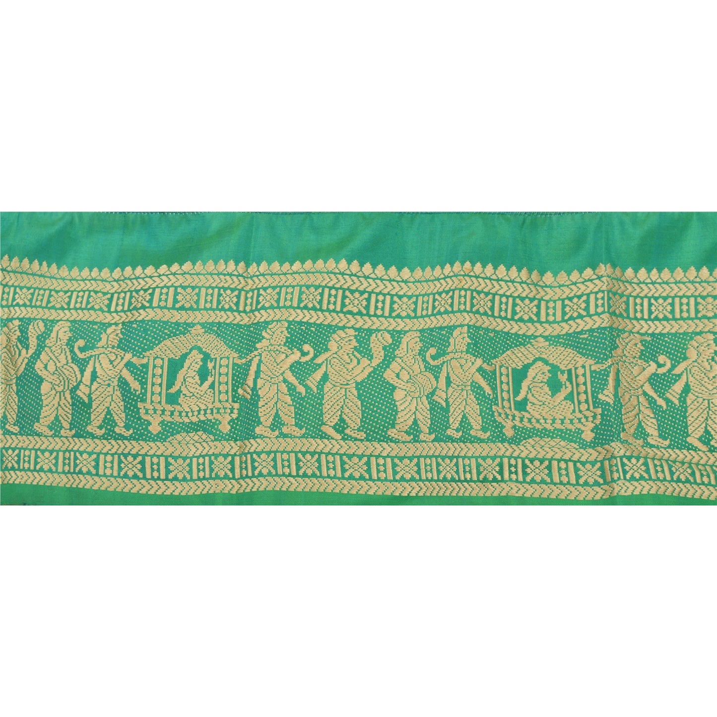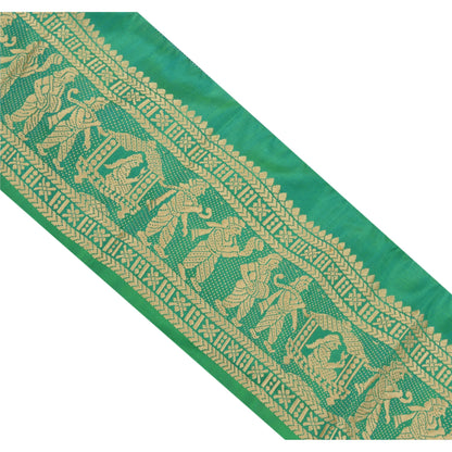 Wonderful pure silk woven sari border in green color highlighting traditional Baluchari work from Odisha (Eastern India). Border has beautiful woven pattern in cream color showcasing Indian marriage procession where the palanquin is being taken for the bride. Floral motifs further add to the beauty of the trim. WOW!! and awesome one of a kind versatile border. 1 Quantity = 1 Yard