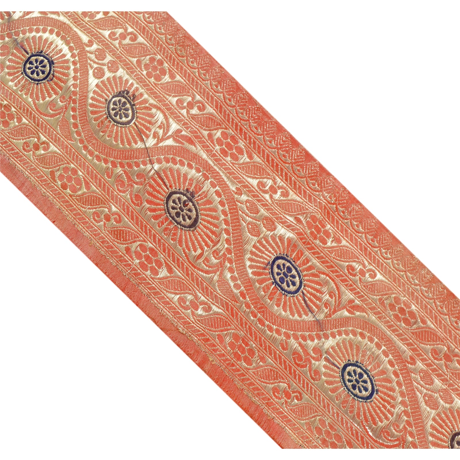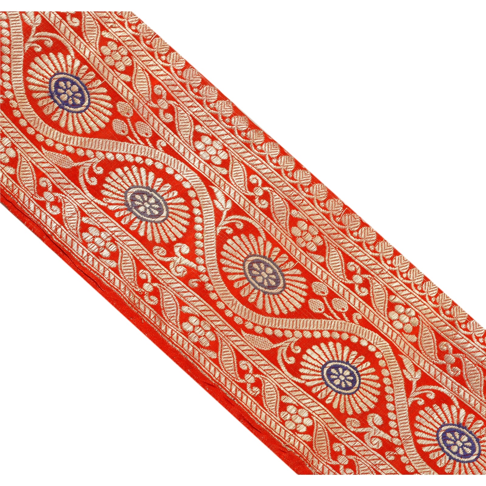 Outstanding satin silk woven brocade sari border in red color highlighting zari work. Border has beautiful floral & paisley patterns painstakingly gold zari work (electroplated copper metallic thread) work, black thread work. WOW!! an awesome one of a kind versatile border. 1 Quantity = 1 Yard