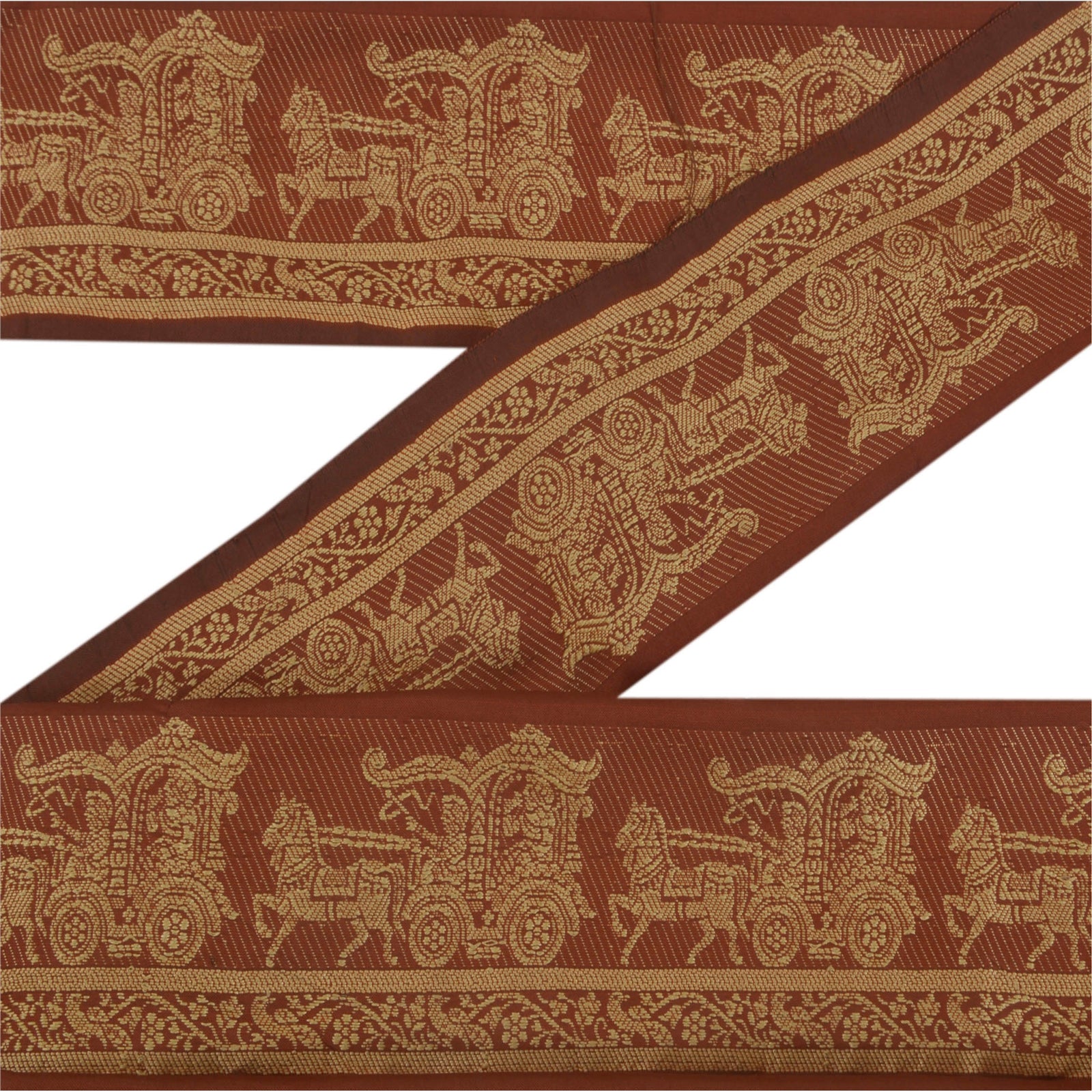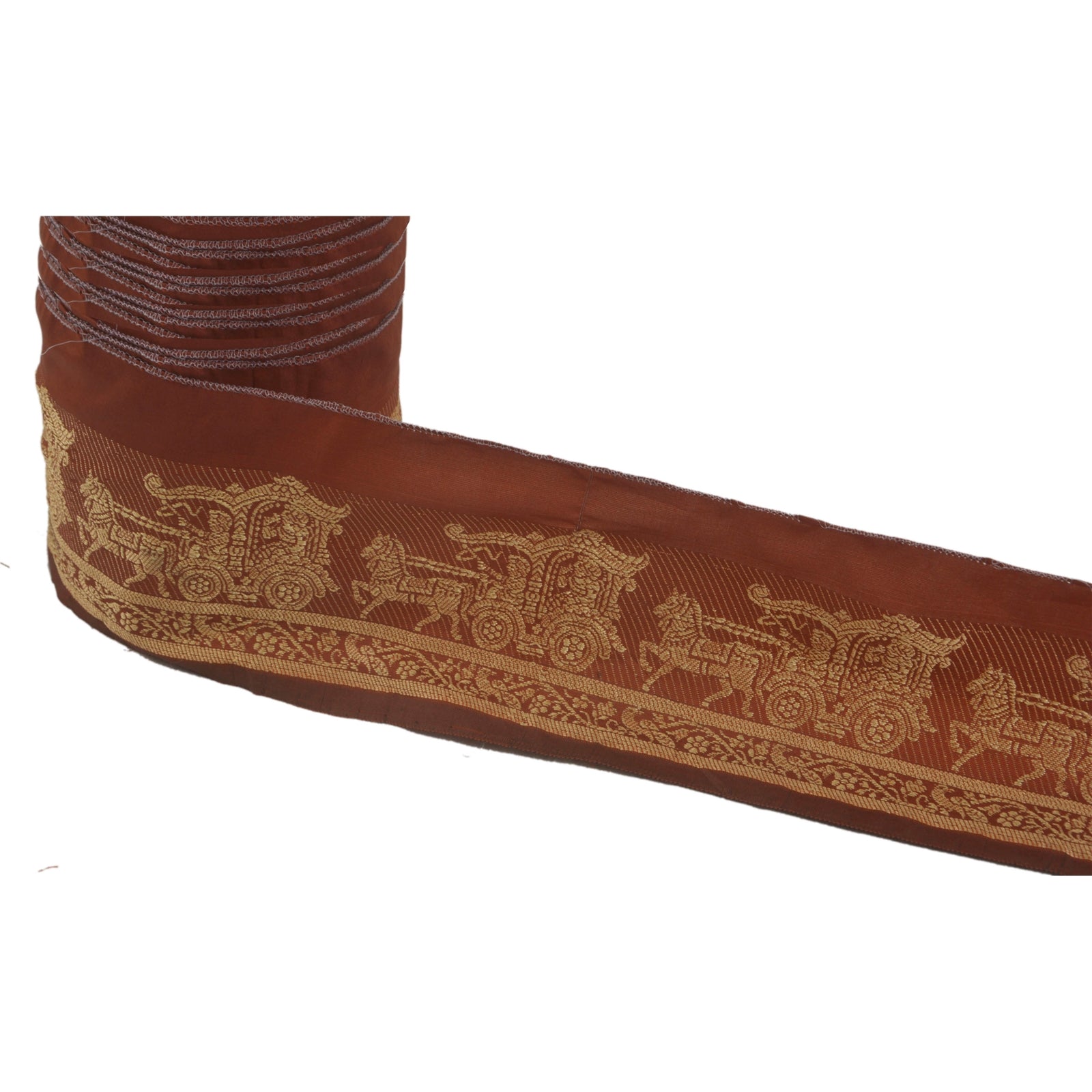 Fabulous 100% pure silk woven sari border in brown color highlighting baluchari work. Border has beautiful floral, human & chariot figures design painstakingly woven with cream color thread. WOW!! an awesome one of a kind versatile border. 1 Quantity = 1 Yard