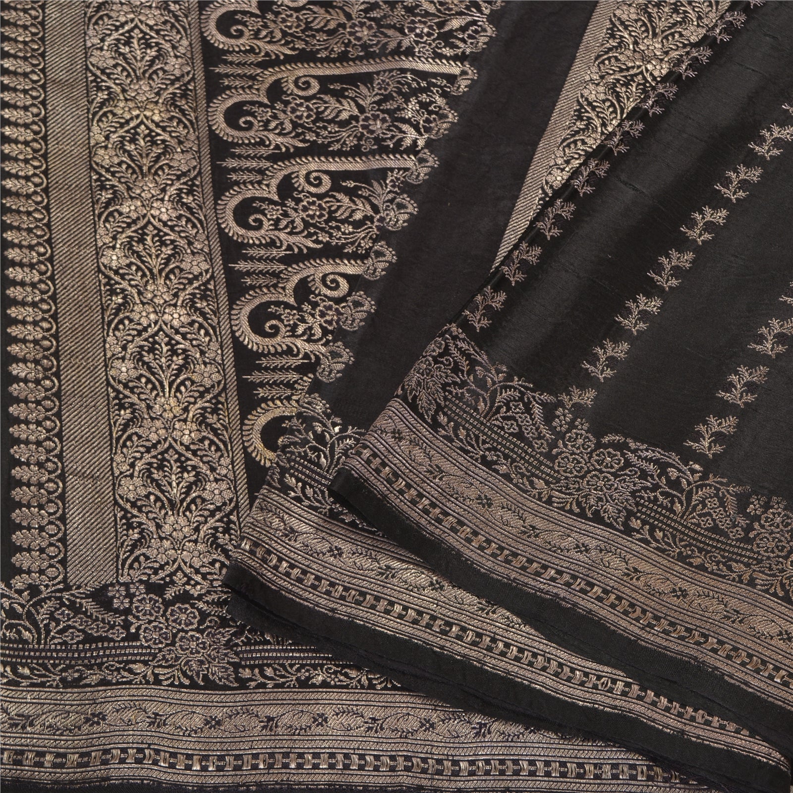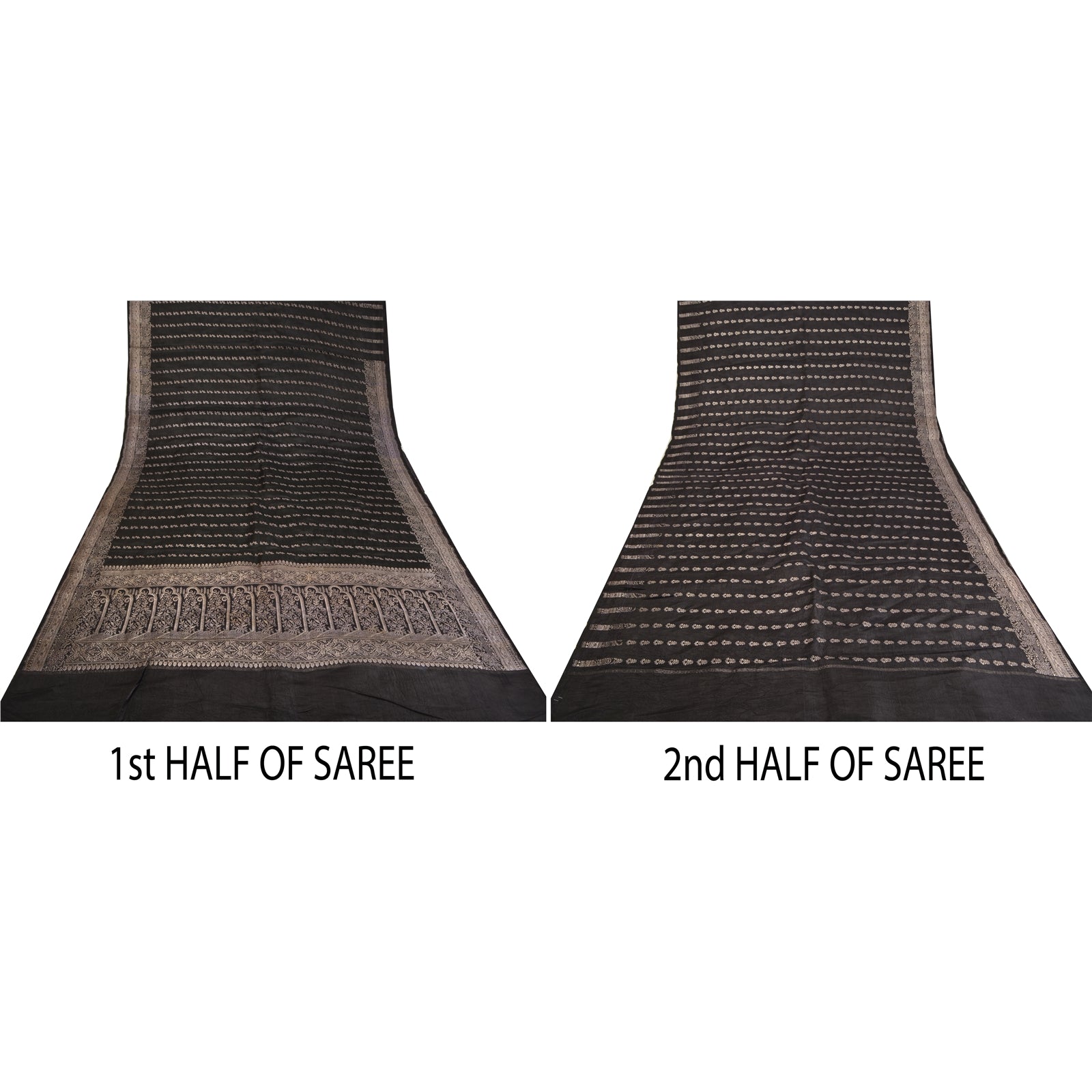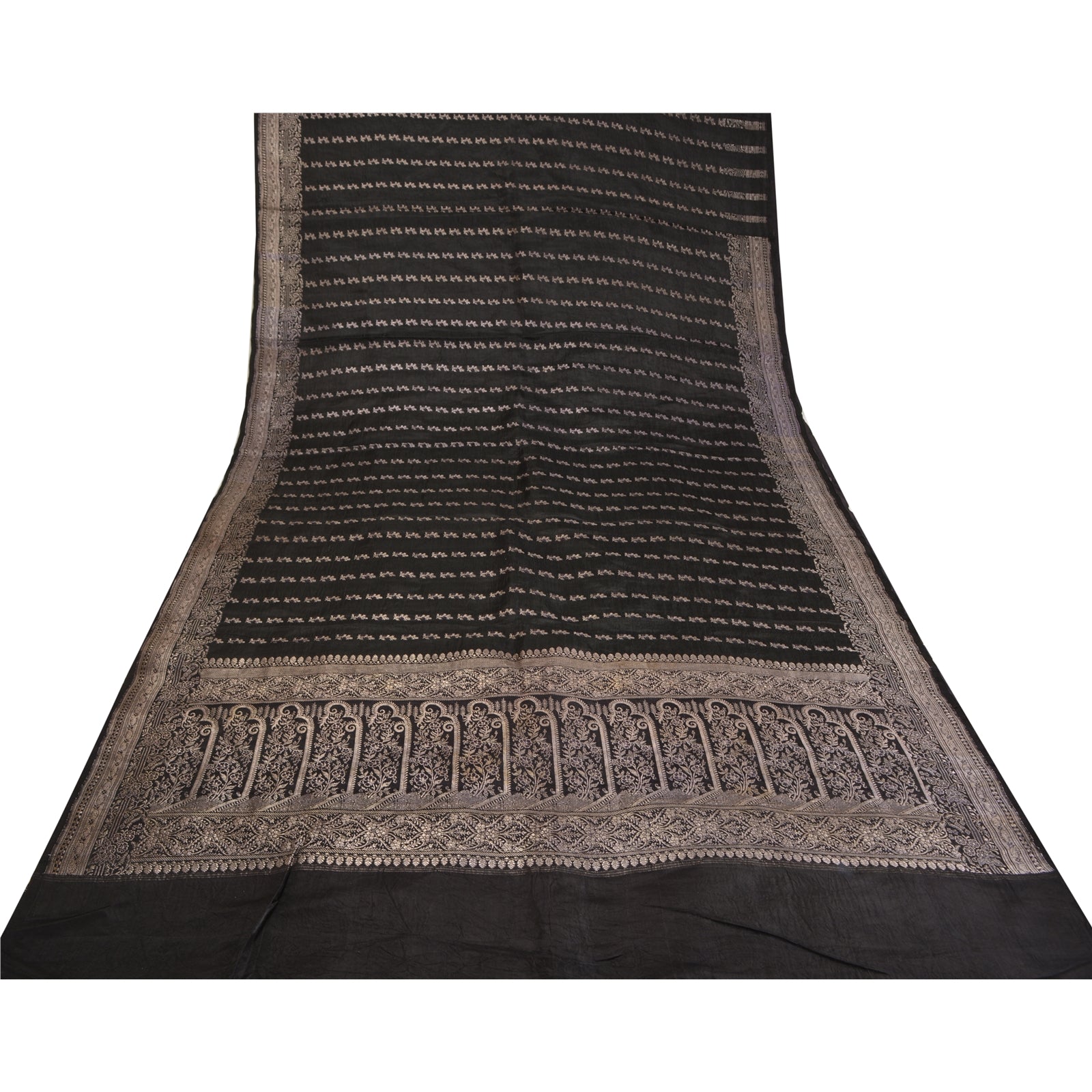 'THE ITEM COLOR OR SHADE MAY BE DARKER OR LIGHTER THAN THE PICTURE.' What a stunning saree highlighting zari work. Base fabric is pure satin woven brocade/banarasi in black color looks amazing. You can see pallu & border has floral & paisley design and adorned with metallic golden zari work makes the saree look fabulous. The center part of the sari has similar zari with floral design. This unique vintage saree can be used for various crafting ideas even if you don't want to use it as a sari. Design a dress, use it as a throw, as window dressing, upholstery, table linen and much more. Let your creative juices flow and use this decorated fabric in multiple fashion. WOW !! an amazing piece of art. This unique vintage saree can be used for various crafting ideas even if you don't want to use it as a sari. Design a dress, use it as a throw, as window dressing, upholstery, table linen and much more. Let your creative juices flow and use this decorated fabric in multiple fashion. 'International buyers please note: Import duties, taxes, and charges are not included in the item price or postage cost. These charges are the buyer's responsibility. Please check with your country's customs office to determine what these additional costs will be prior to bidding or buying. Buyer will pay custom duty/tax. It is calculated and charged differently by every country. As a seller I do not have any control over it. VAT or sales tax is calculated by the platform at the time of checkout. Customs charge is payable at the time of delivery.