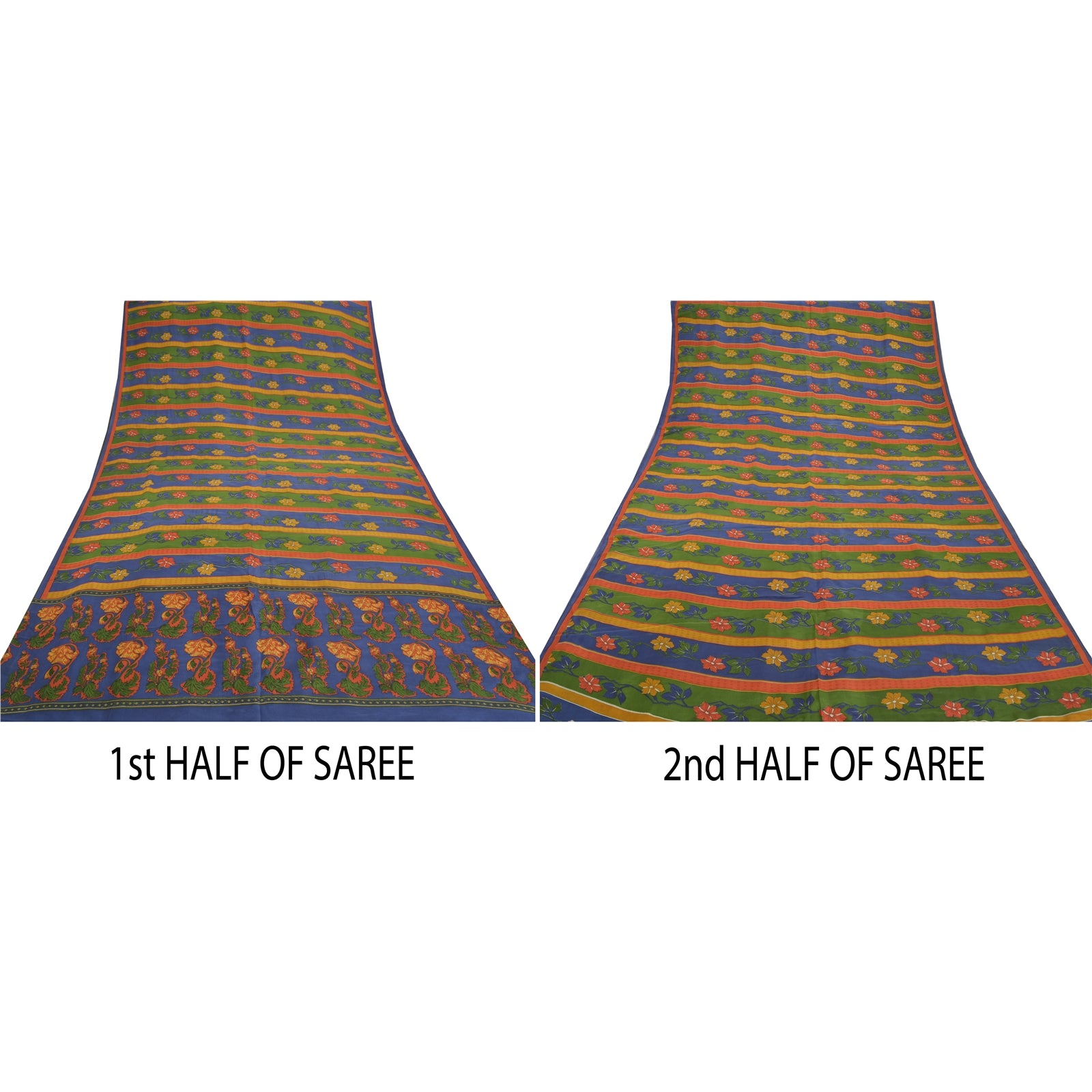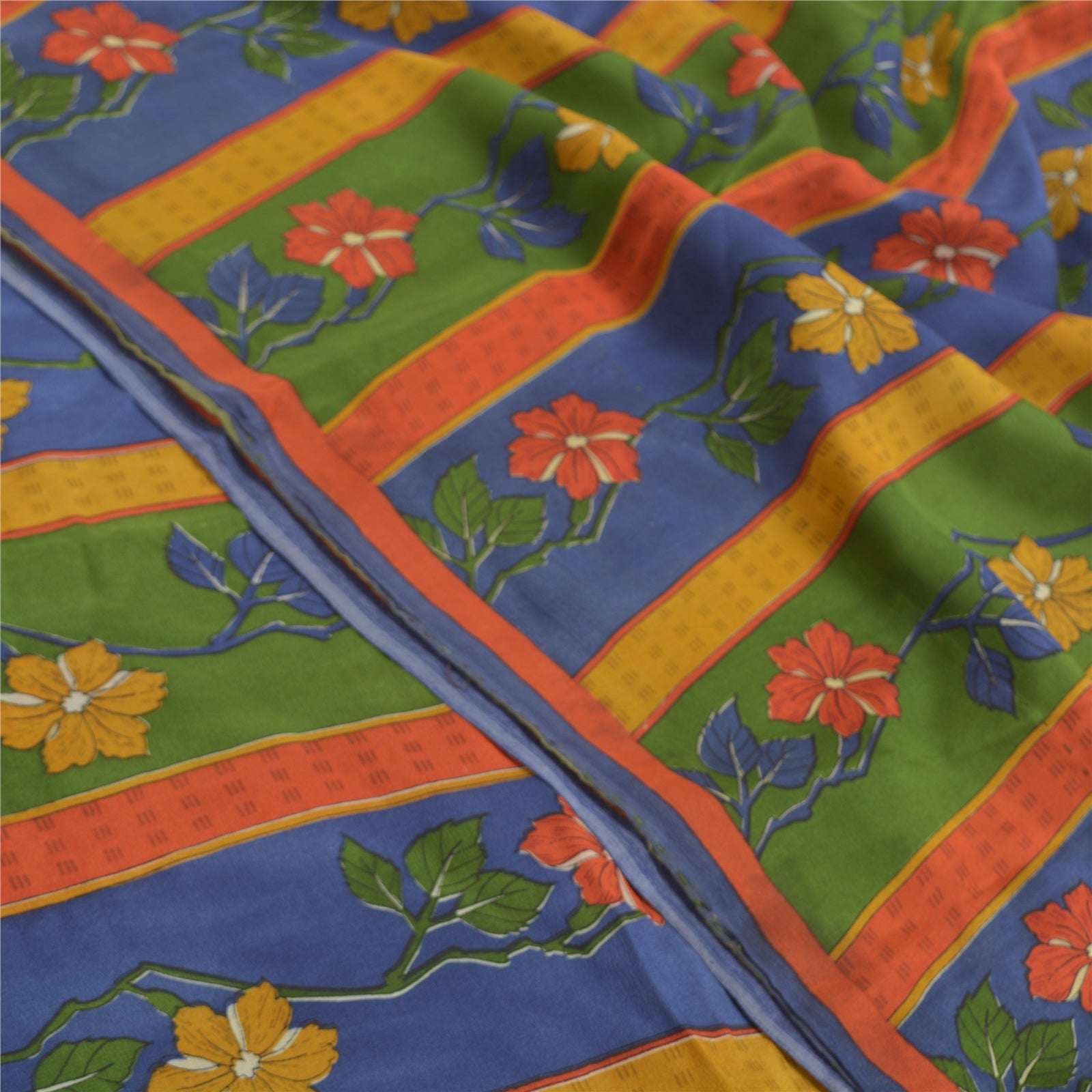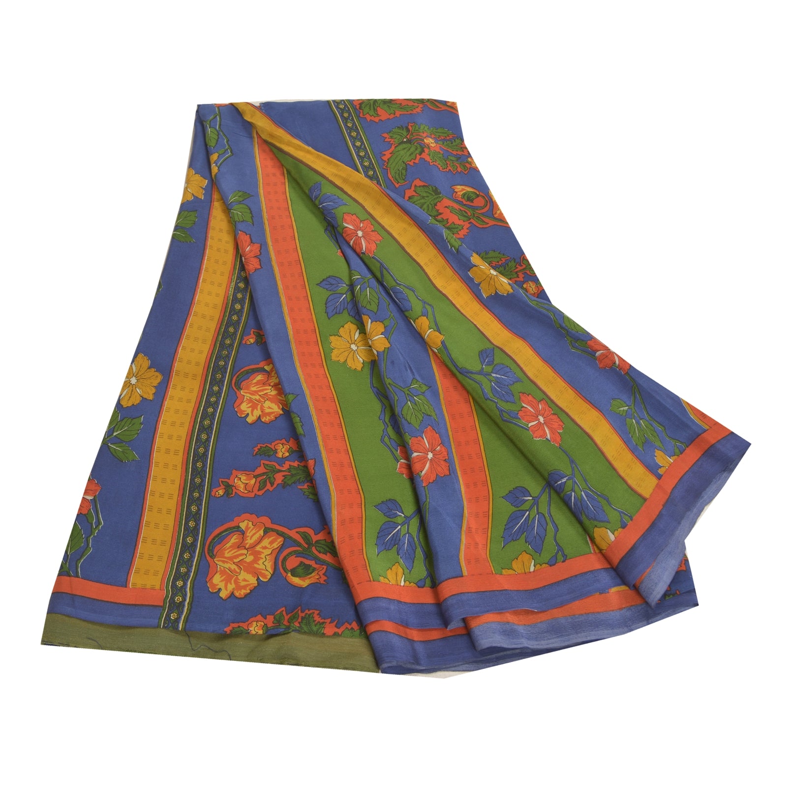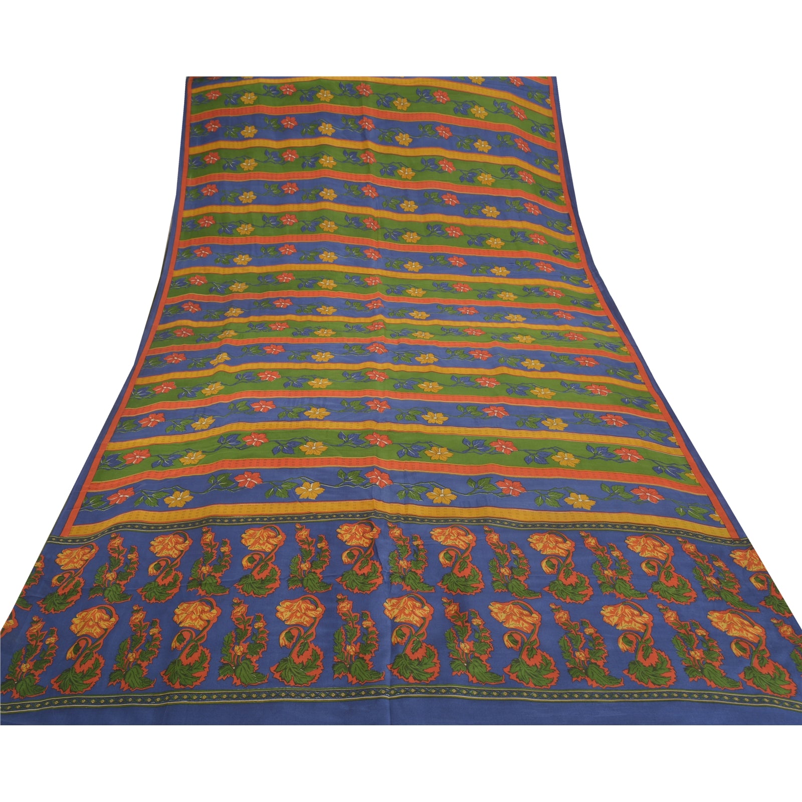 Sanskriti Vintage Blue Sarees Pure Cerpe Silk Printed Sari Craft Sewing Sustainable Fabric