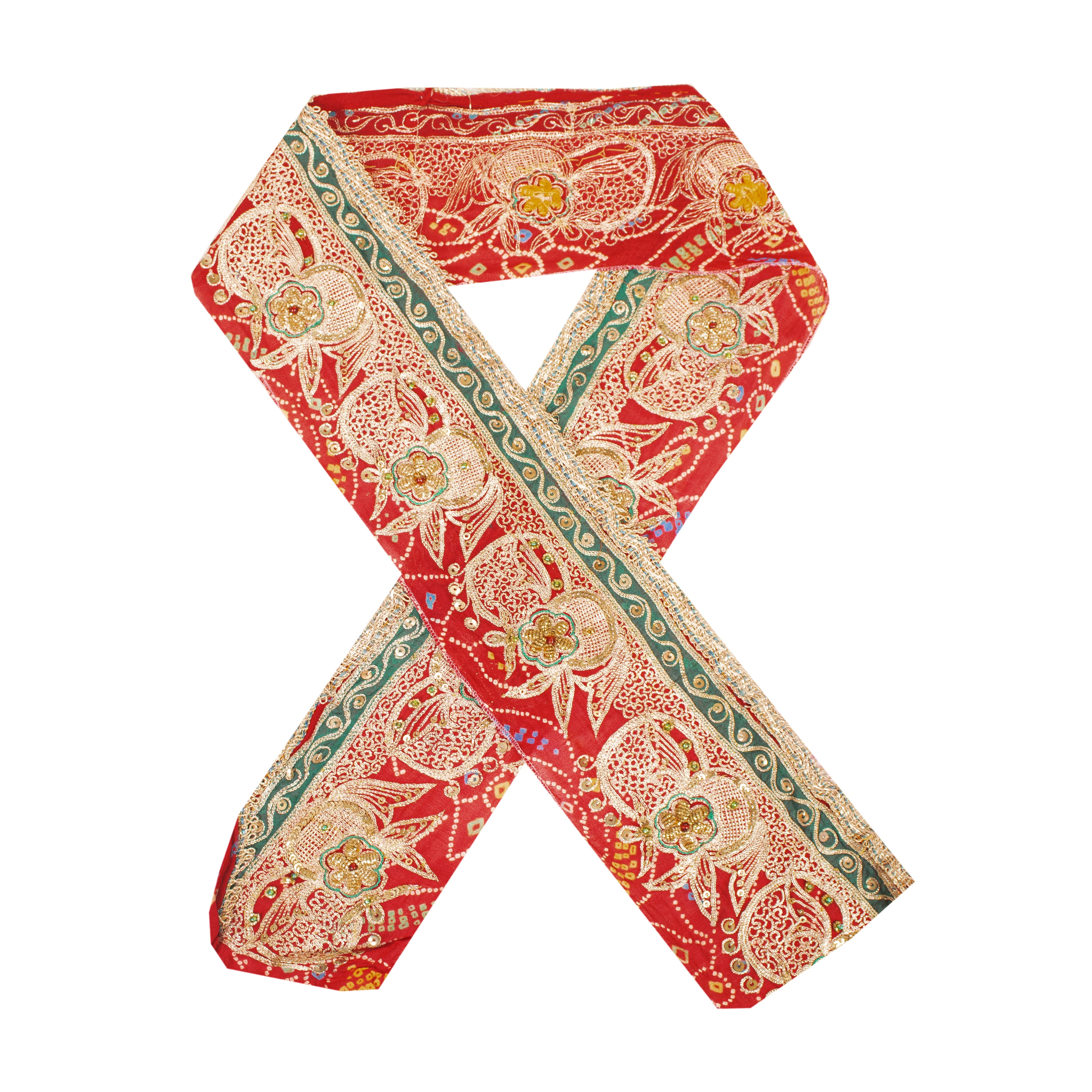 Beautiful pure silk hand embroidered bandhani sari border. Further embellished by gold zari/dabka work, blue/green thread work. You can also see gold sequins, red/green glass beads, gold lace work, green patch work along with floral design on red fabric. 1 Quantity = 1 Yard Versatile Uses-Dress Designing, Crafting Projects & Decor. THE ITEM COLOR OR SHADE MAY BE DARKER OR LIGHTER THAN THE PICTURE.' International buyers please note: Import duties, taxes, and charges are not included in the item price or postage cost. Buyer will pay custom duty/tax,VAT, and any applicable charges at the time of delivery. B-8532