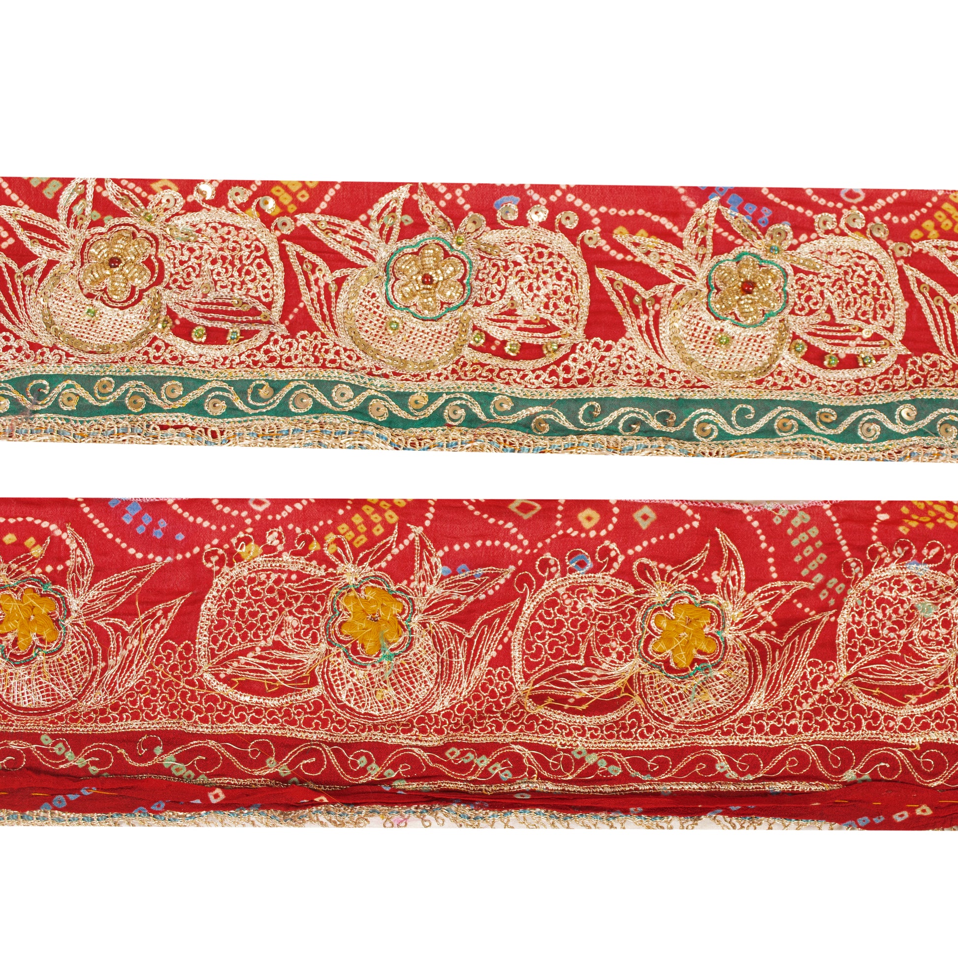 Sanskriti Vintage Craft Trims Lace Sari 1YD Border Red Bandhani Hand Bead Dabka