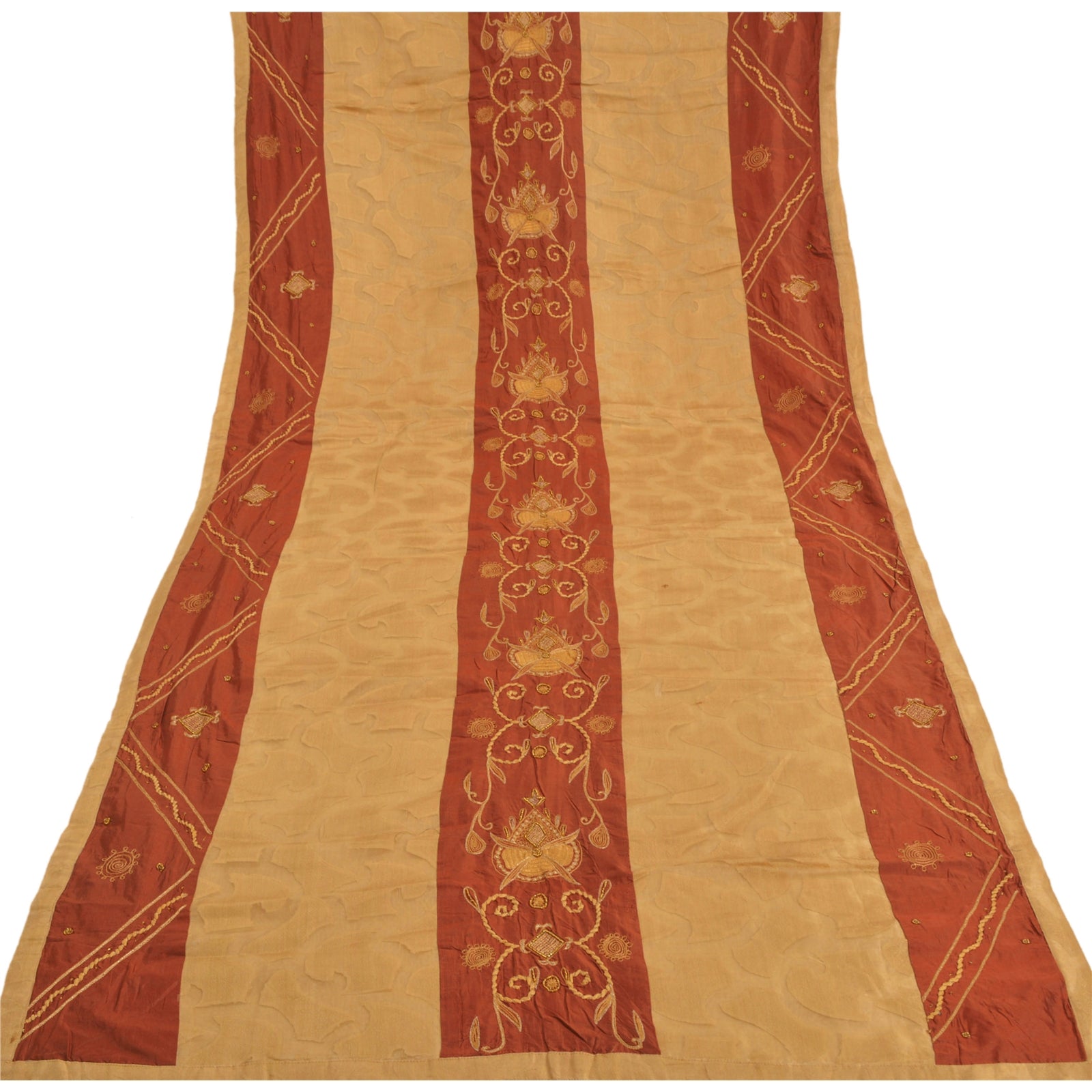 Beautiful shade of beige colored cotton hand embroidered woven long scarf/dupatta. Center portion of the dupatta floral design with zari work. Border has woven floral design with copper color Sustainable Fabric patch work, cream dori & yellow glass beads work is really enhancing beauty of the dupatta/stole. This dupatta/stole can be used for various crafting ideas too. Use it for dress designing, as a throw, as window dressing, upholstery, table linen and much more. Let your creative juices flow.