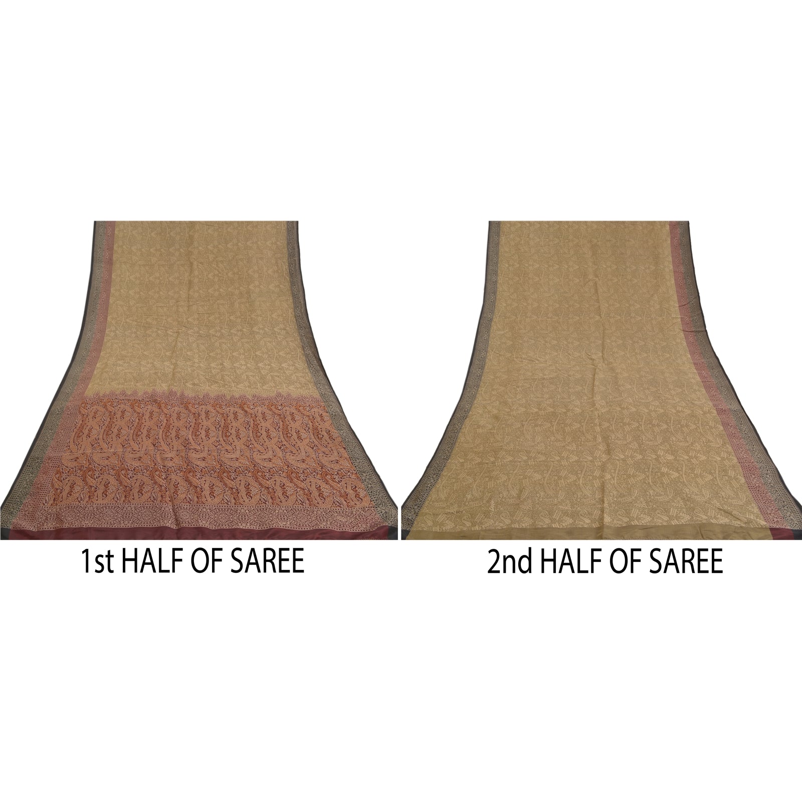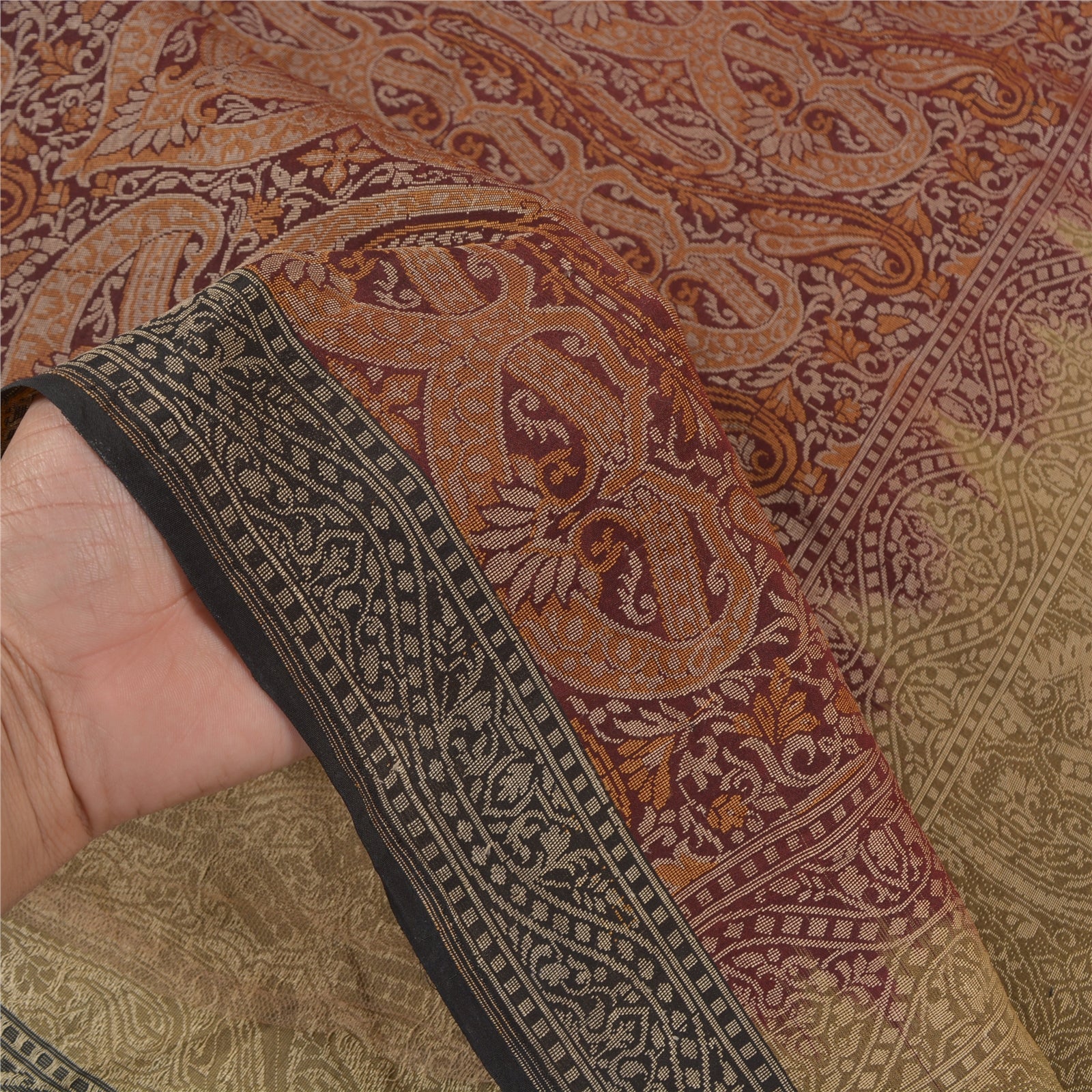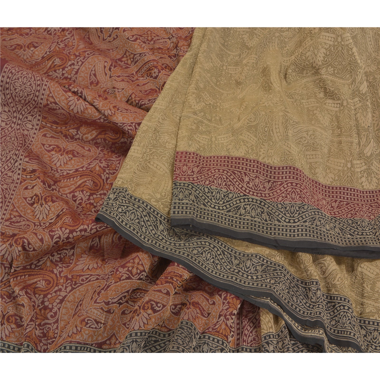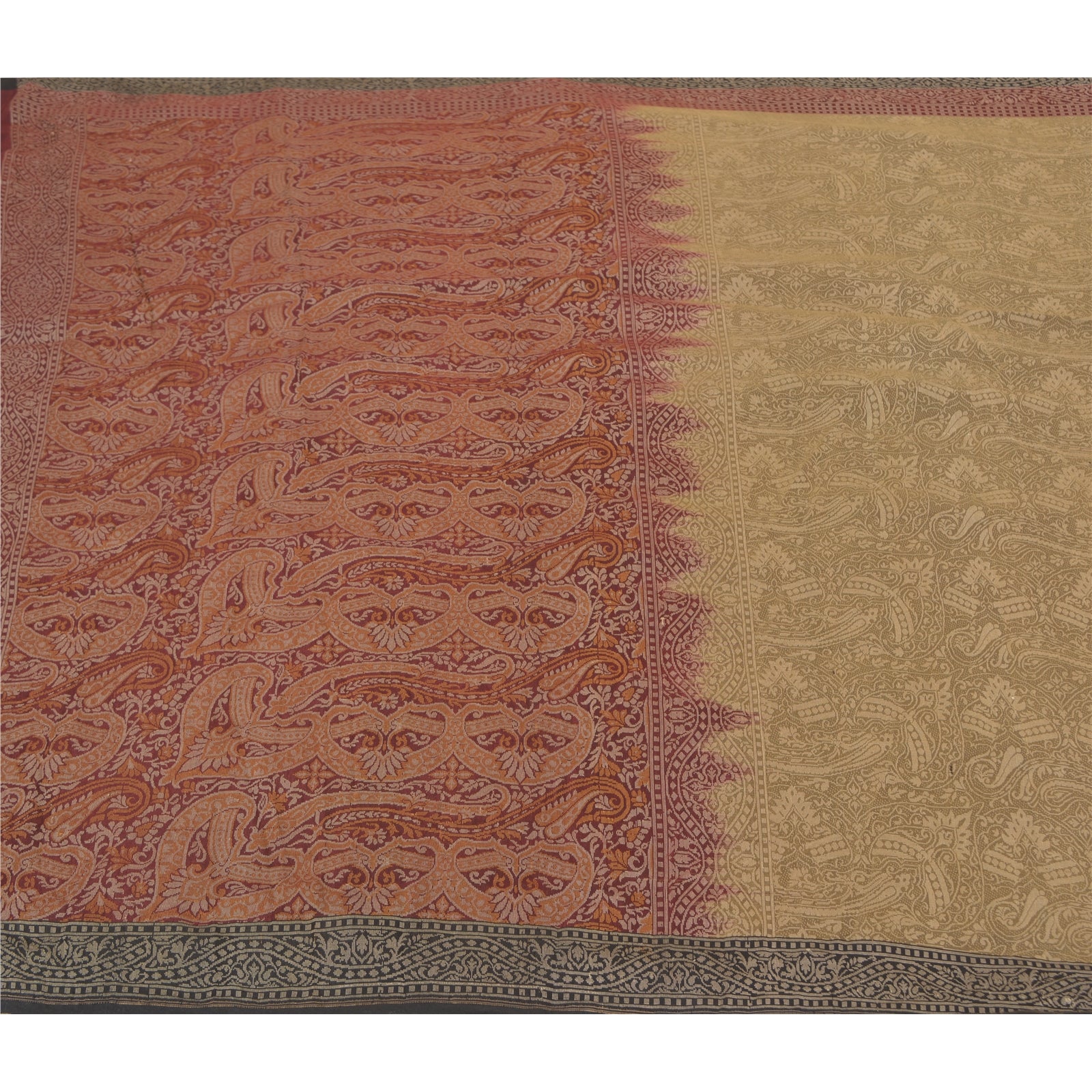 Sanskriti Offers This Vintage Shade Of Green & Maroon Color Woven Tanchoi (Jamawar) Heavy Saree Which Is Crafted With 100% Pure Silk Base Sustainable Fabric The pallu & border sari features floral & paisley design embellished with cream color thread woven work. The center part of sari boasts similar woven work with floral motifs. Tanchoi is one of the weaving techniques involving a single or double warp and two to five colors on the weft which are often of the same shade, on Silk Sustainable Fabric. ... Another stand alone feature of the Tanchoi sarees is that the Sustainable Fabric texture background has a Satin finish. This heavy saree can be used for various crafting ideas too. Use it for dress designing, as a throw, as window dressing, upholstery, table linen and much more. Let your creative juices flow!