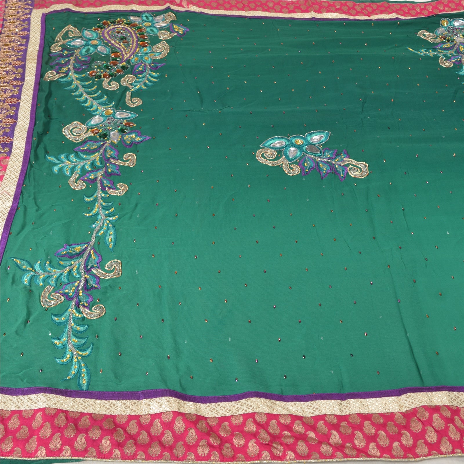 'THE ITEM COLOR OR SHADE MAY BE DARKER OR LIGHTER THAN THE PICTURE.' Stunning green colored hand embroidered blend georgette sari Pallu & Border features floral, paisley design embellished with green, purple, maroon thread work, copper, gold sequins, pink designing sequins, yellow, purple, white stone, white glass beads, green, white, yellow rhinestone work, purple ribbon work with woven purple & cream color Sustainable Fabric patch work. There are floral motifs with similar work in center part of sari. This item's Beauty Factor Alluring multi color rhinestone with awesome paisley & floral vines design on green color base Sustainable Fabric is really enhancing the beauty of the saree. 'International buyers please note: Import duties, taxes, and charges are not included in the item price or postage cost. These charges are the buyer's responsibility. Please check with your country's customs office to determine what these additional costs will be prior to bidding or buying. Buyer will pay custom duty/tax. It is calculated and charged differently by every country. As a seller I do not have any control over it. VAT or sales tax is calculated by the platform at the time of checkout. Customs charge is payable at the time of delivery.