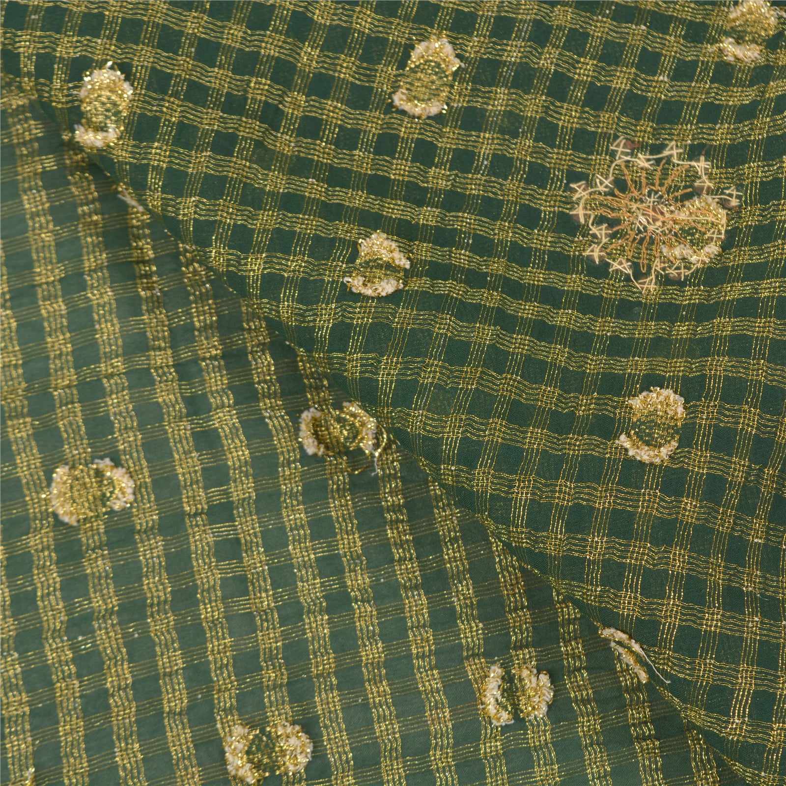 Beautiful Green Colored Cotton (Not Pure Cotton) Hand Embroidered Woven Sari. Pallu & Border has floral design embroidered metallic golden zardozi work, red/cream kundan stones, white glass beads, golden woven work. You You can see center part of saree has similar woven grid pattern with zardozi work. This saree can be used for various crafting ideas too. Use it for dress designing, as a throw, as window dressing, upholstery, table linen and much more. Let your creative juices flow. For USA buyers - Single item ships via registered air mail, buy 1 more to get FedEx.