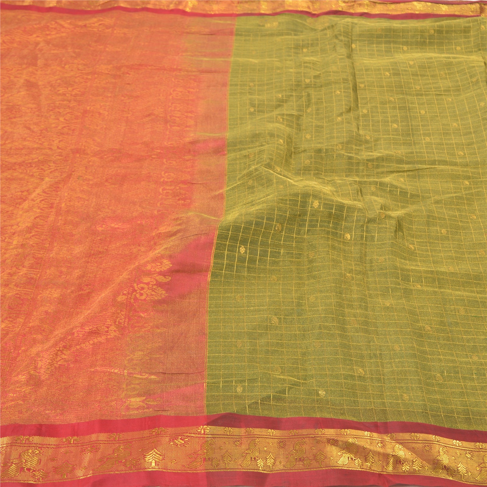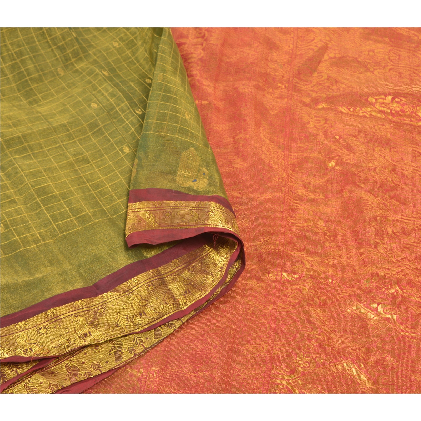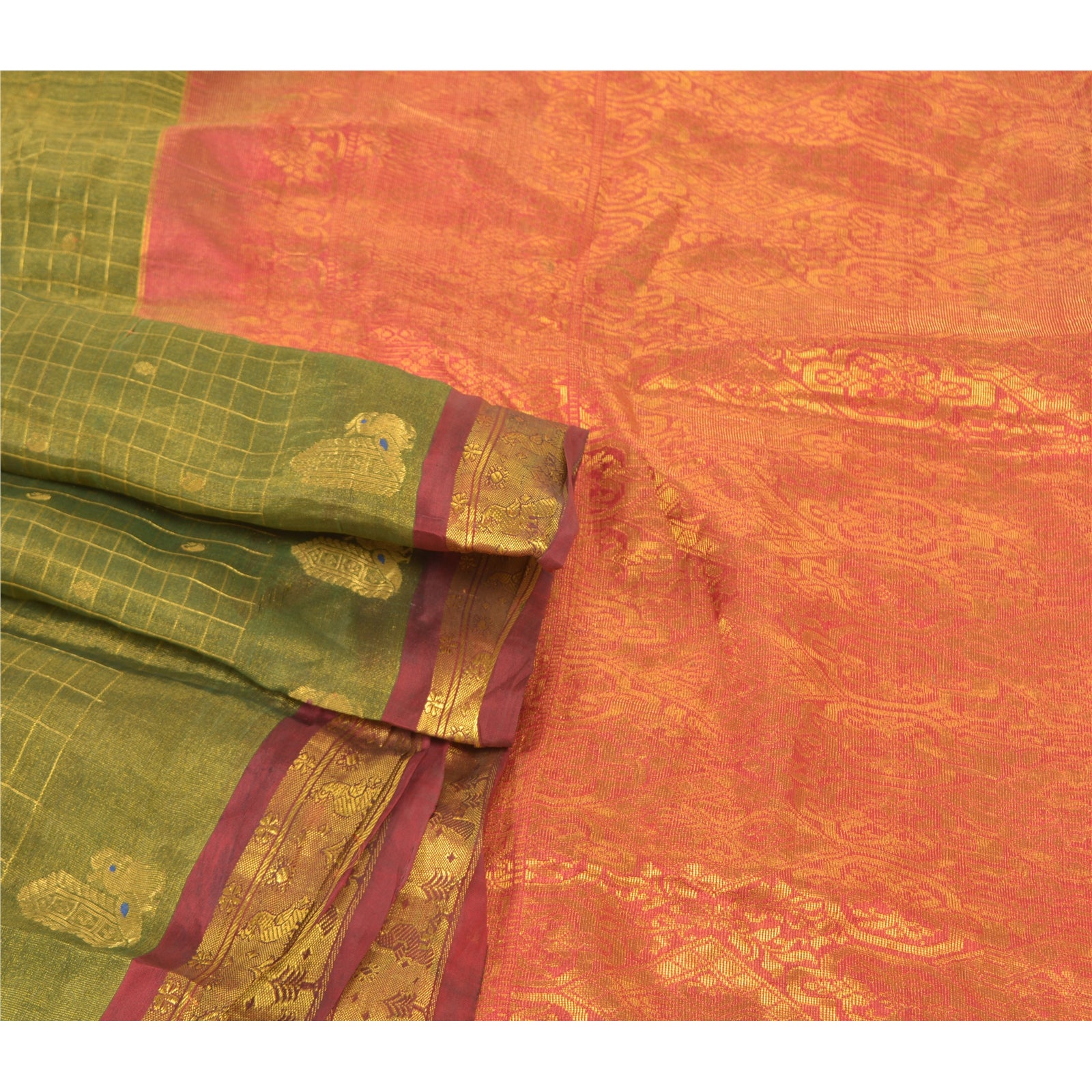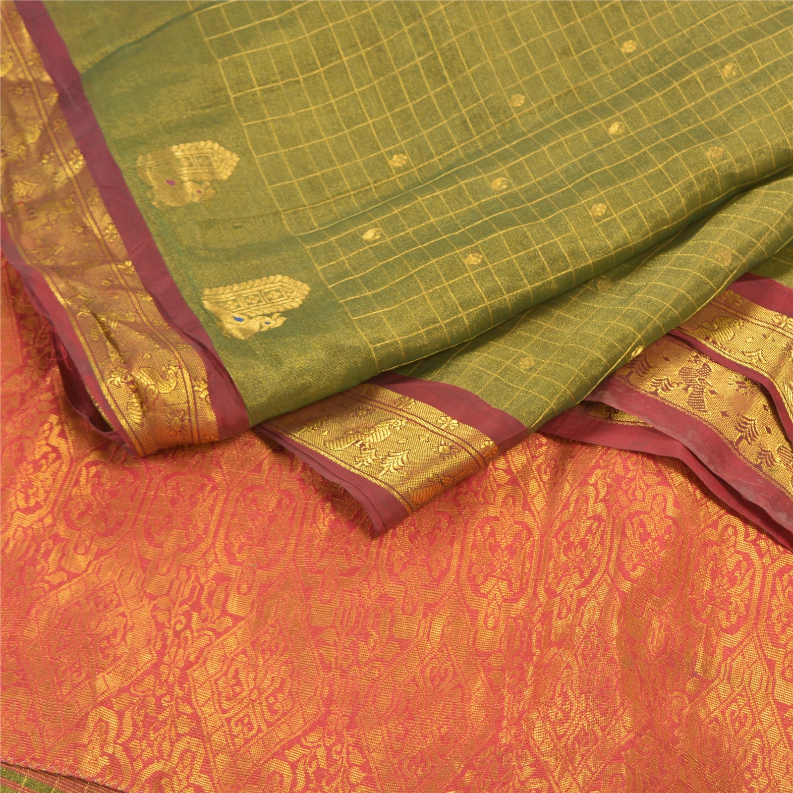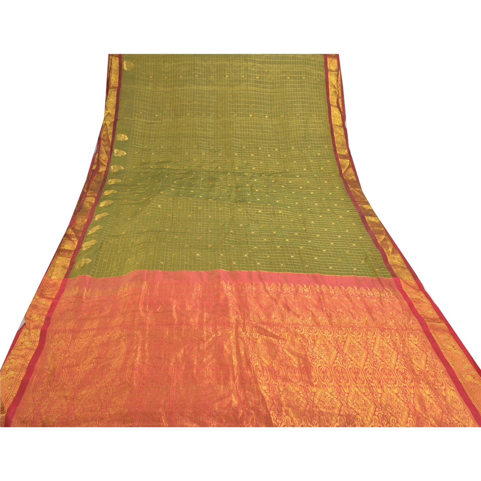 An Awesome Heavy Sari In 100% Pure Silk Red & Green Colored Hand-Woven Traditional Koorai (Koorai saree have been a part of Tamilnadu’s traditional culture. Many brides prefer wearing red koorai saree with heavy jewellery. This looks super royal, elegant and traditional. These types of sarees generally have bright golden borders.)Sari/Sustainable Fabric. Pallu & Border Features Hand-Woven Golden Zari Work With Floral Pattern. You can see similar golden zari work with floral & checkers pattern In Center Portion Of Sari. This heavy saree can be used for various crafting ideas too. Use it for dress designing, as a throw, as window dressing, upholstery, table linen and much more. Let your creative juices flow. A One Of A Kind Unique Saree Must In Your Collection. A One Of Kind Unique Saree Must In Your Collection. This unique vintage saree can be used for various crafting ideas for example design a dress, use it as a throw, as window dressing, upholstery, table linen and much more. Let your creative juices flow and use this decorated Sustainable Fabric in multiple fashion.