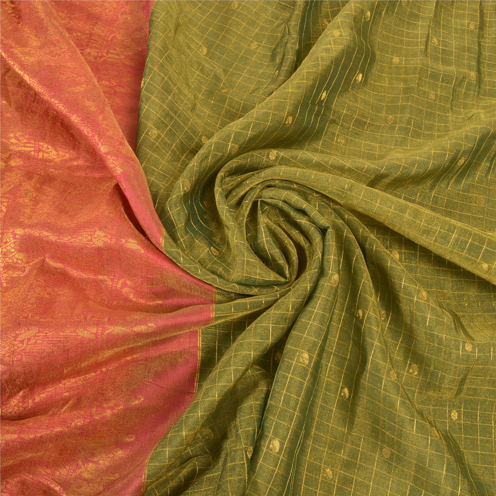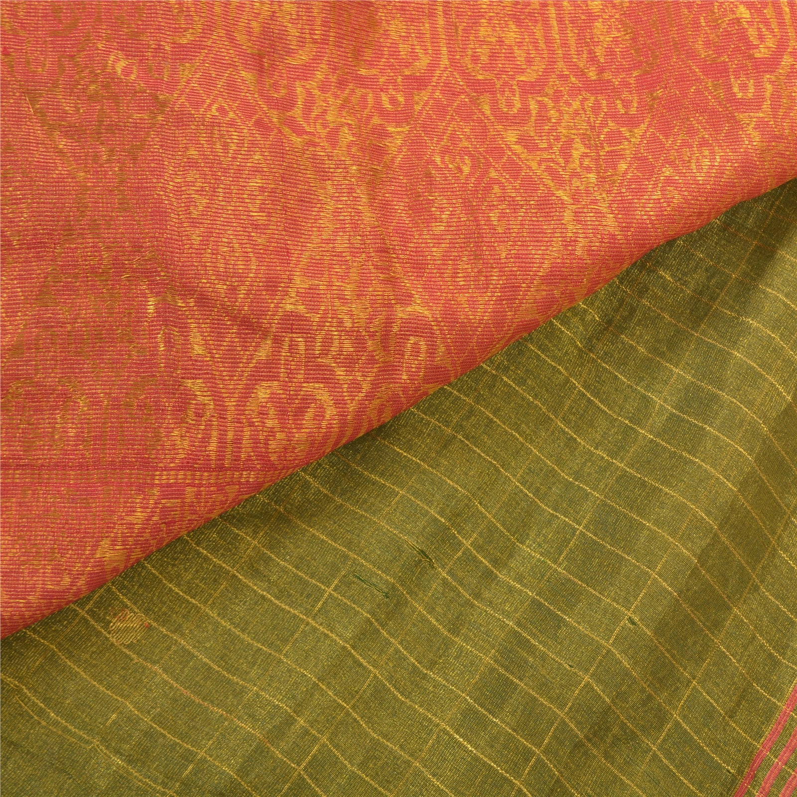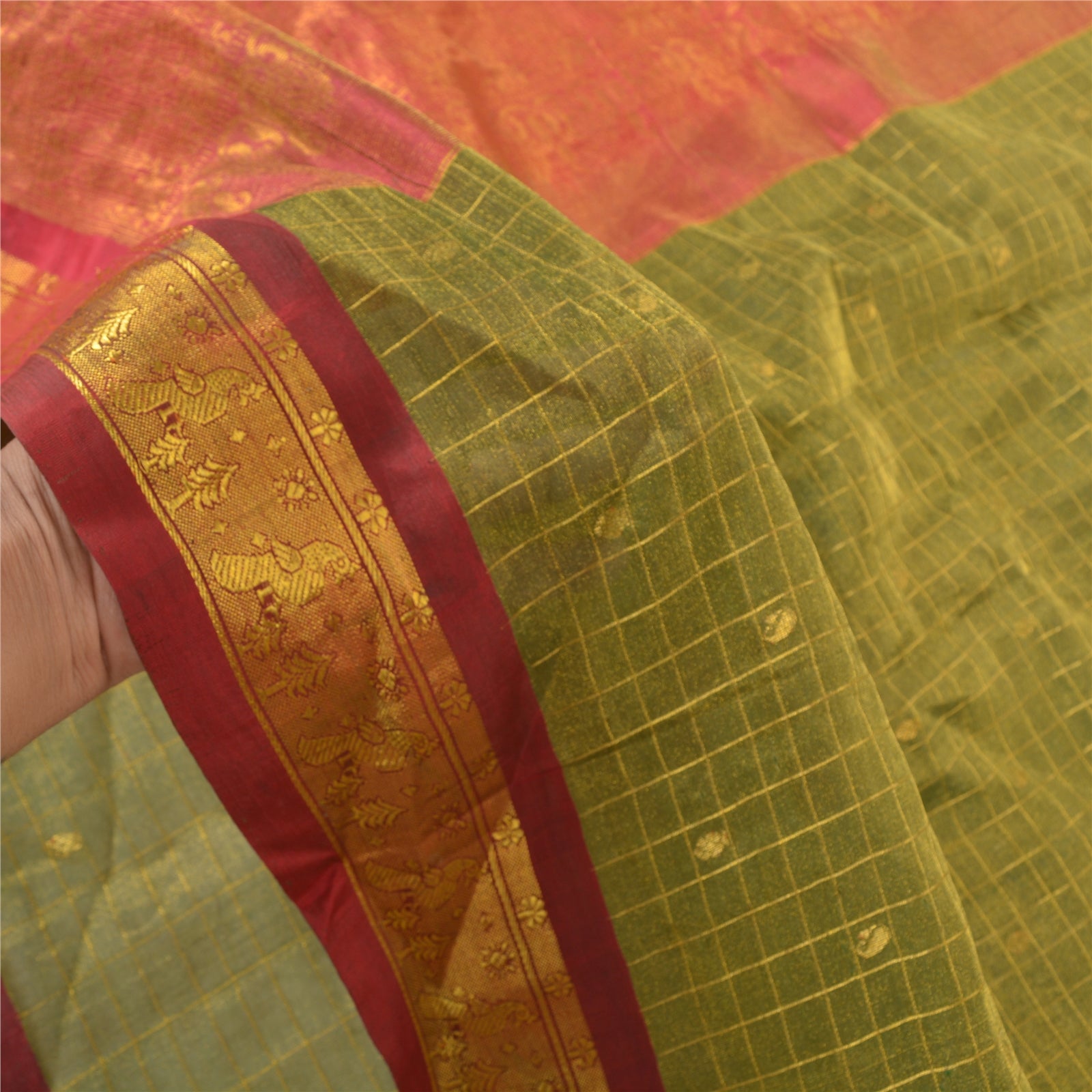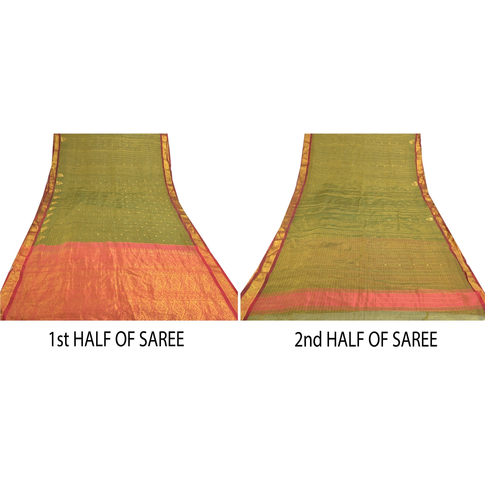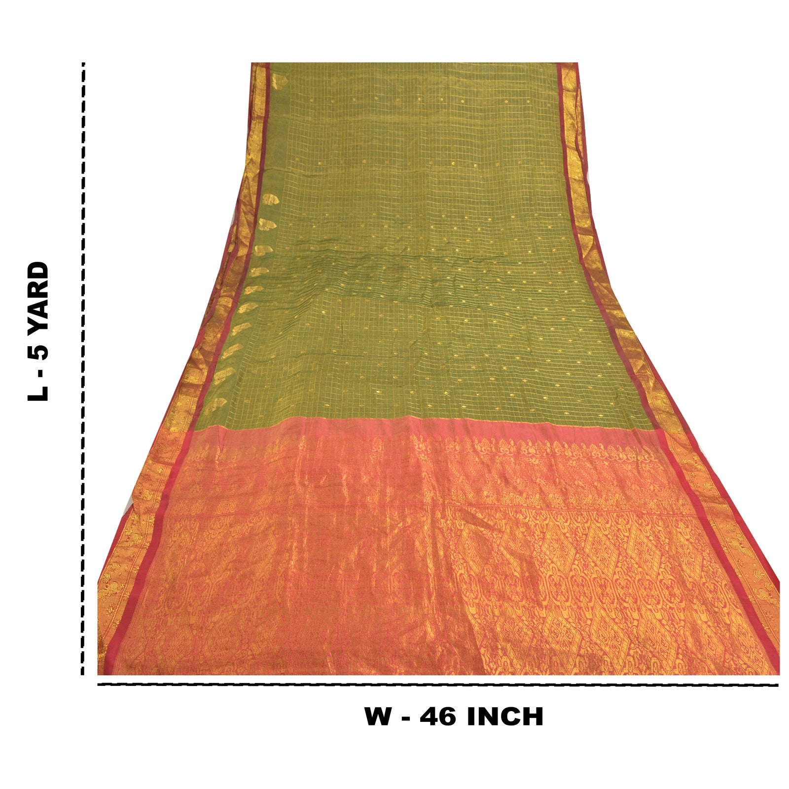 An Awesome Heavy Sari In 100% Pure Silk Red & Green Colored Hand-Woven Traditional Koorai (Koorai saree have been a part of Tamilnadu’s traditional culture. Many brides prefer wearing red koorai saree with heavy jewellery. This looks super royal, elegant and traditional. These types of sarees generally have bright golden borders.)Sari/Sustainable Fabric. Pallu & Border Features Hand-Woven Golden Zari Work With Floral Pattern. You can see similar golden zari work with floral & checkers pattern In Center Portion Of Sari. This heavy saree can be used for various crafting ideas too. Use it for dress designing, as a throw, as window dressing, upholstery, table linen and much more. Let your creative juices flow. A One Of A Kind Unique Saree Must In Your Collection. A One Of Kind Unique Saree Must In Your Collection. This unique vintage saree can be used for various crafting ideas for example design a dress, use it as a throw, as window dressing, upholstery, table linen and much more. Let your creative juices flow and use this decorated Sustainable Fabric in multiple fashion.