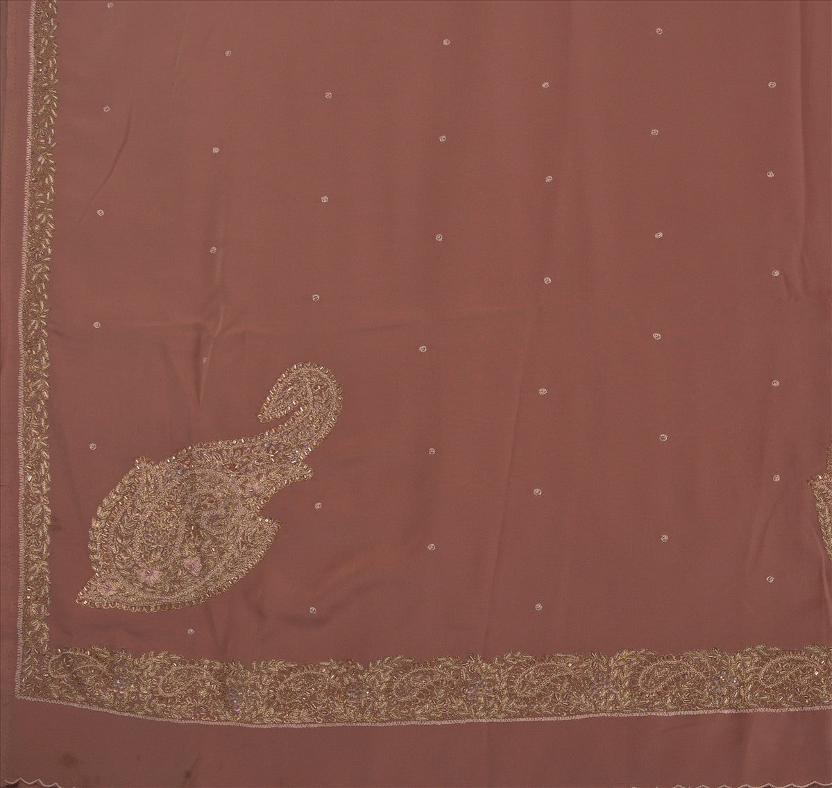Pallu & border also has gold zari work, gold sequins brown wooden/white pearl like beads work. Also you can see green & red Sustainable Fabric patch work gives a unique look to this saree.