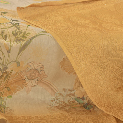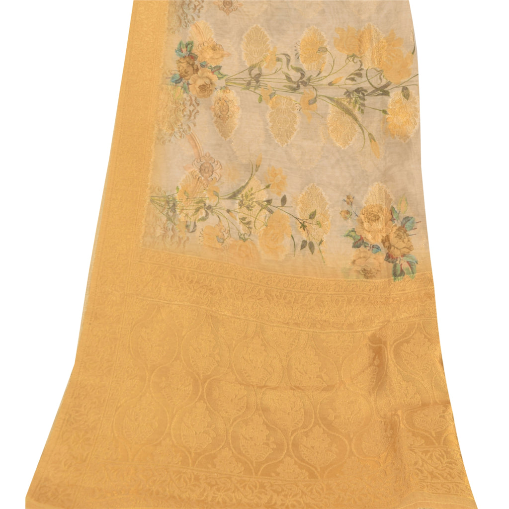 Sanskriti Vintage Ivory/Yellow Dupatta Long Stole Pure Silk Woven Printed Hijab