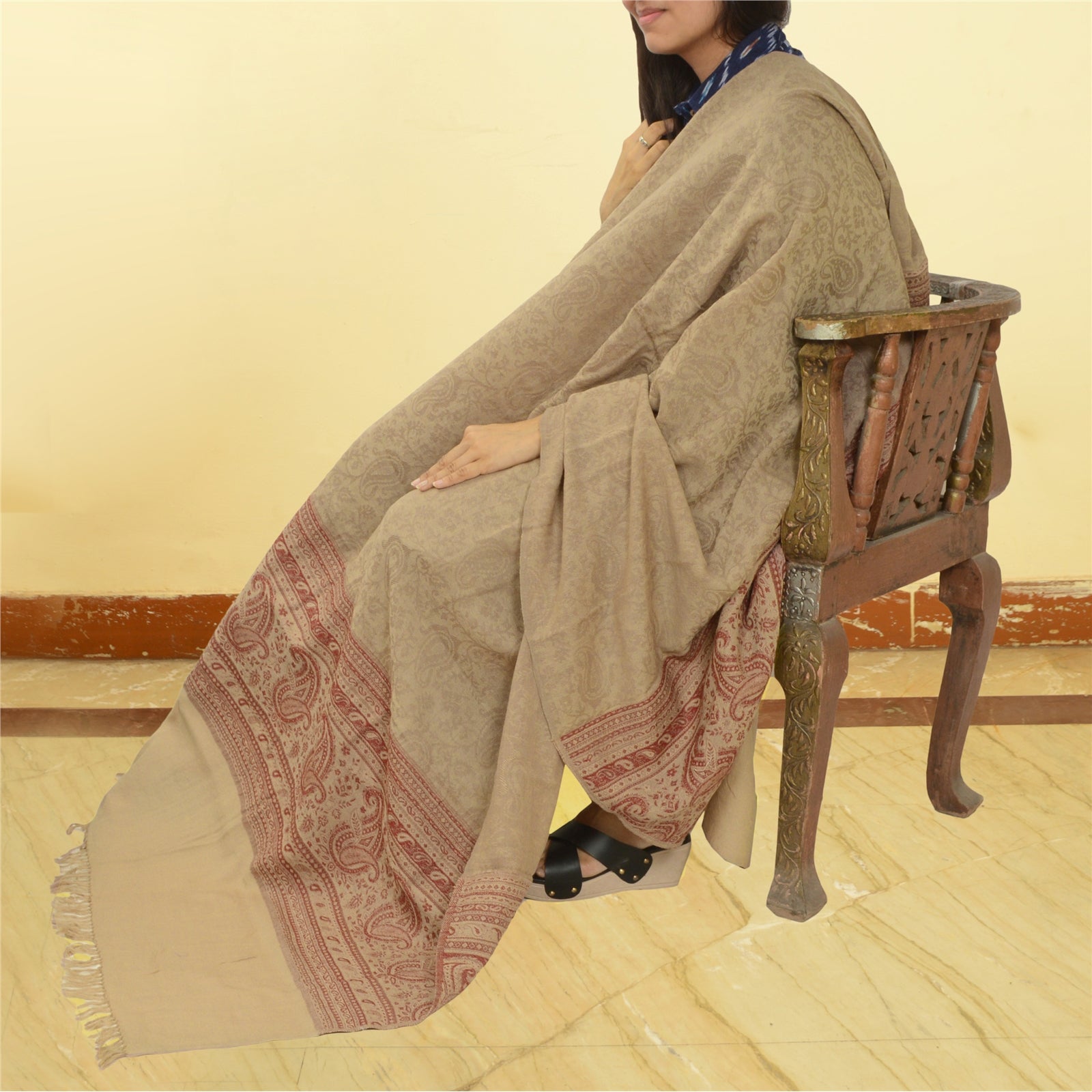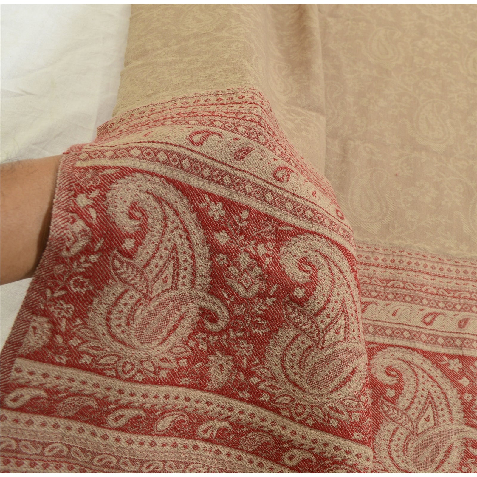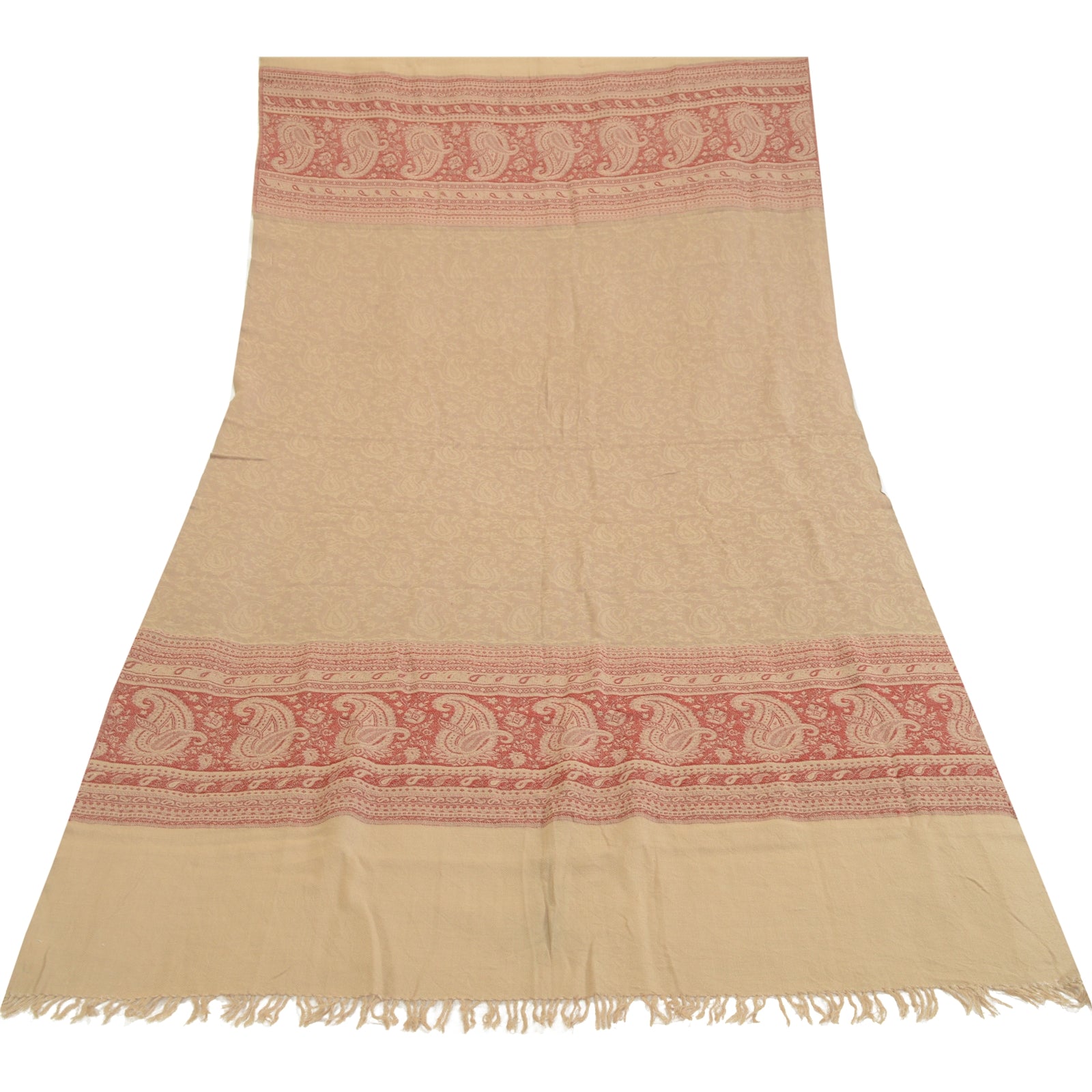 Sanskriti Vintage Long Beige Pure Woollen Woven Shawl Scarf Throw Floral Stole