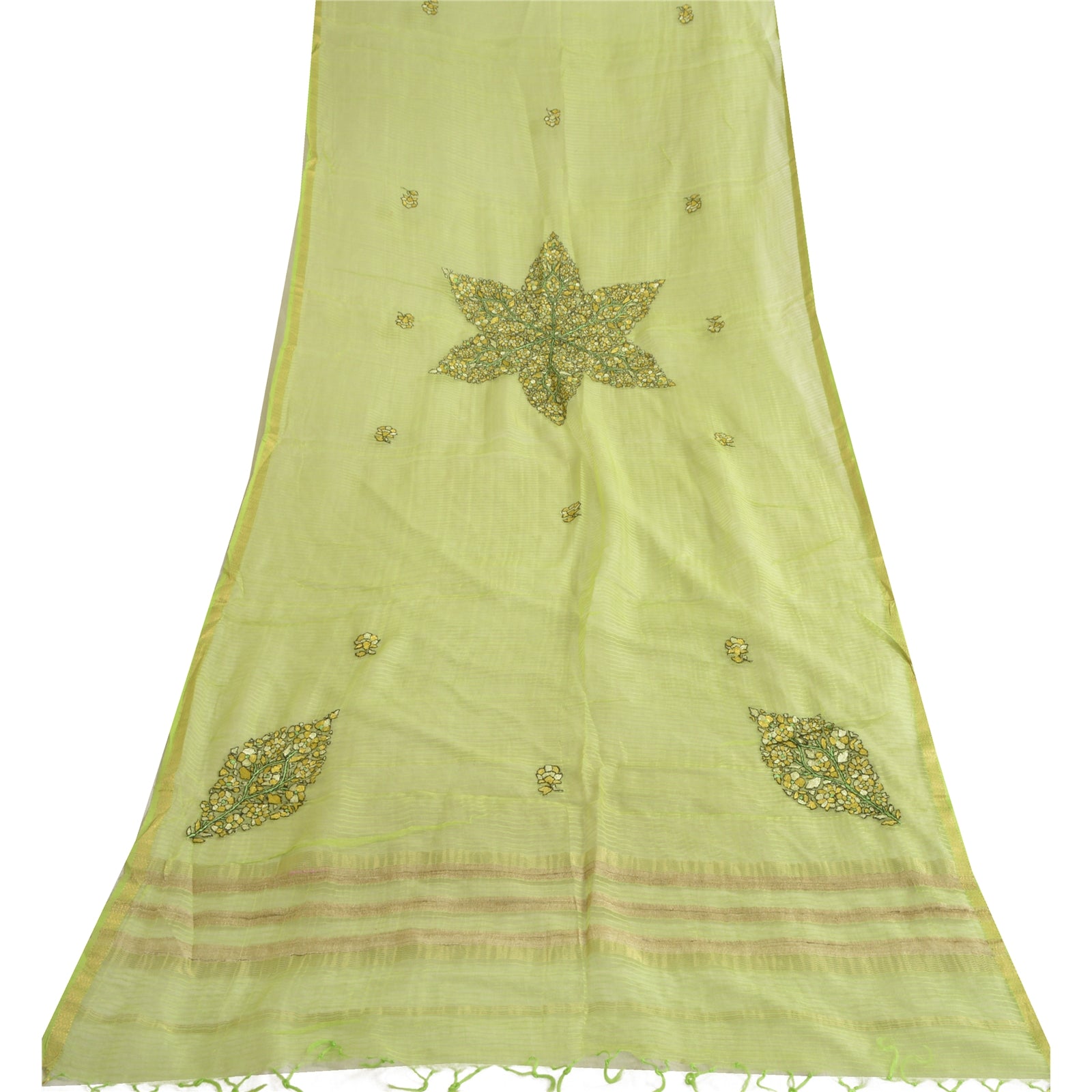 Sanskriti Vintage Long Green Dupatta/Stole Pure Chanderi Silk Handmade Kantha