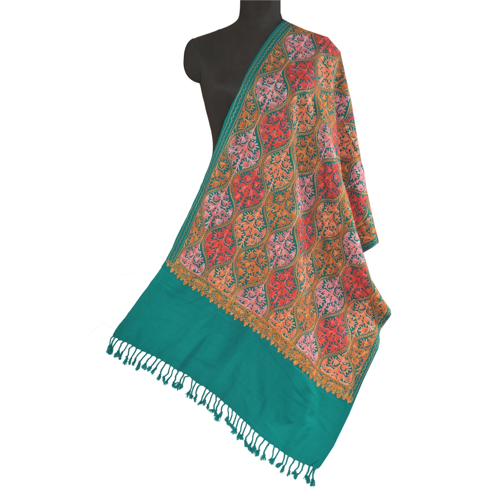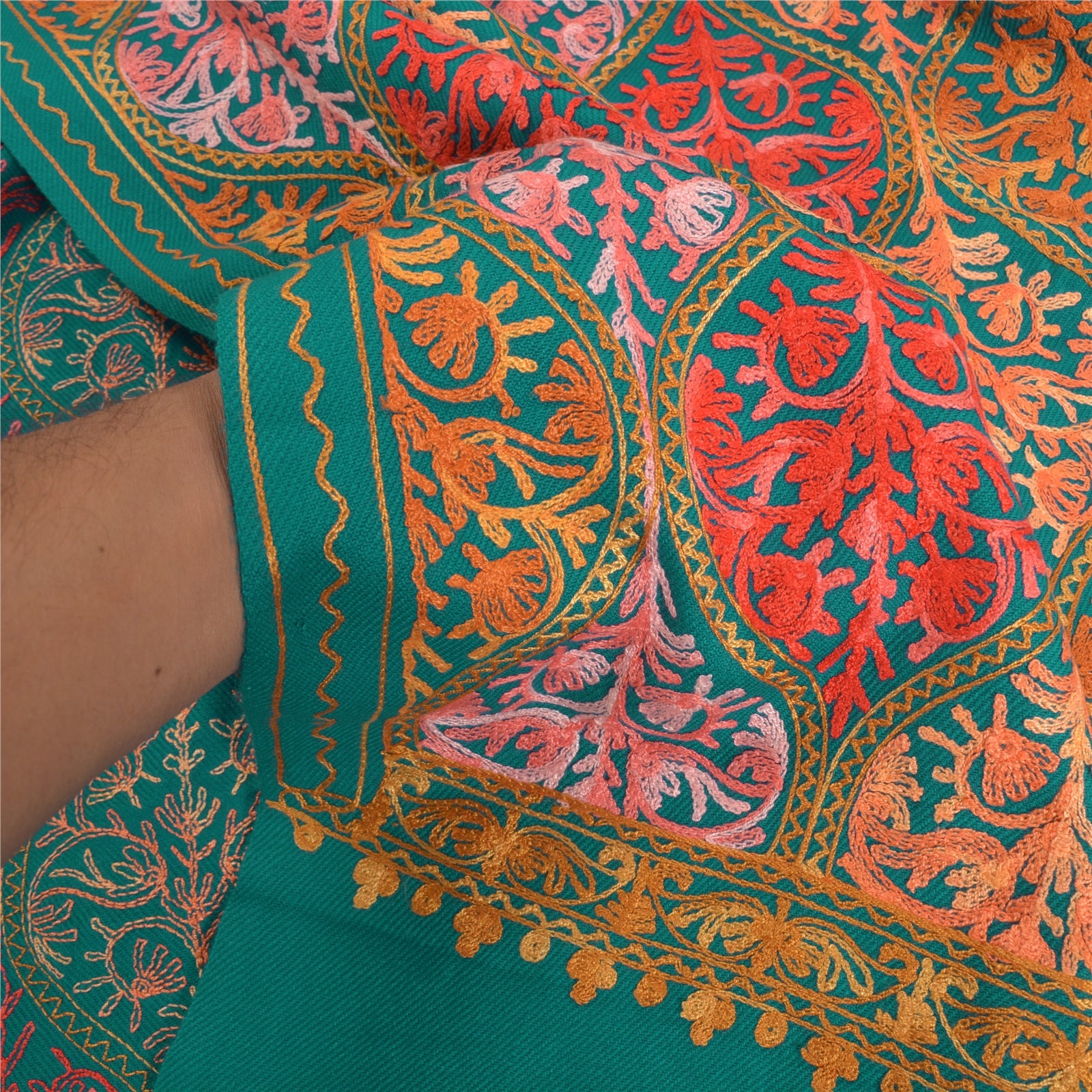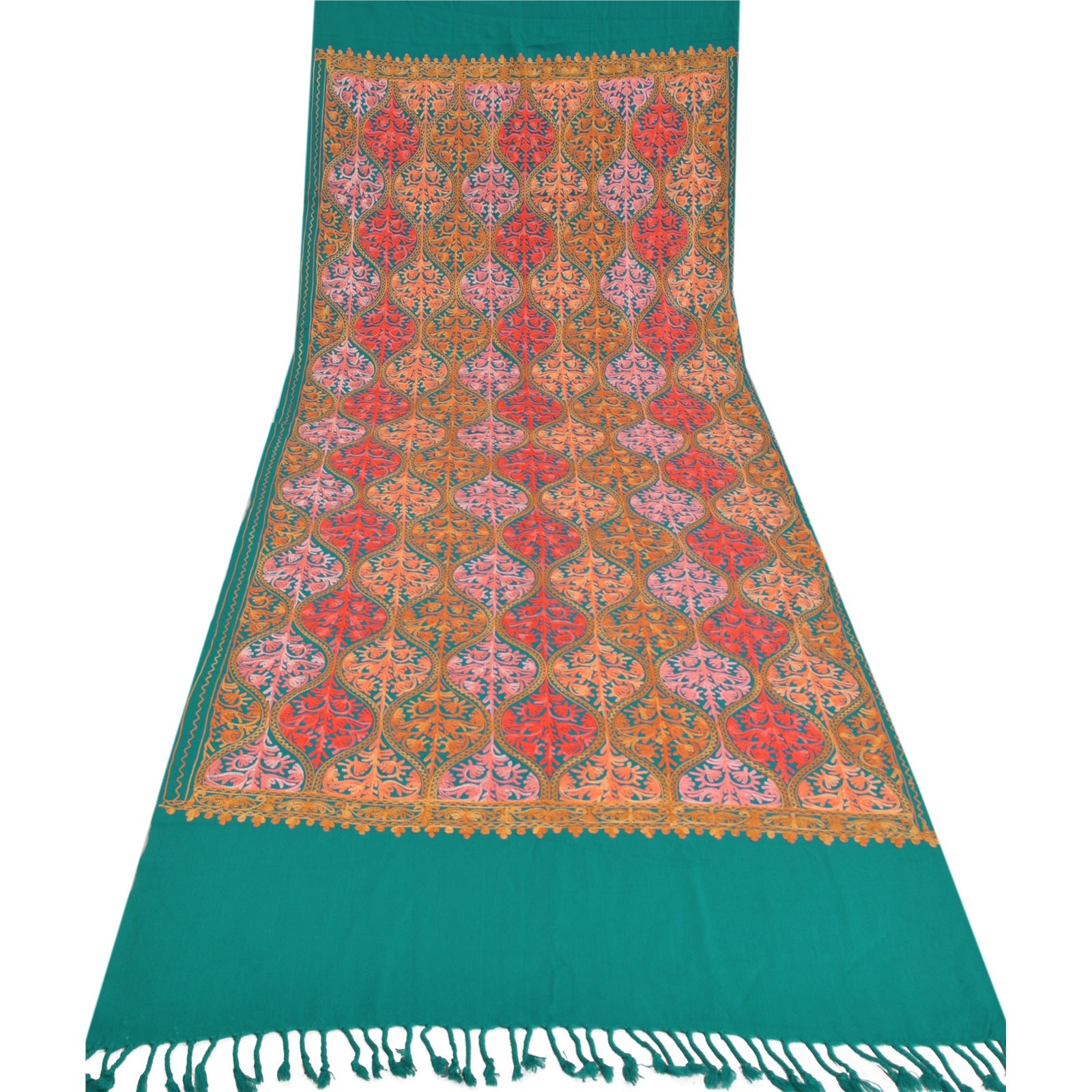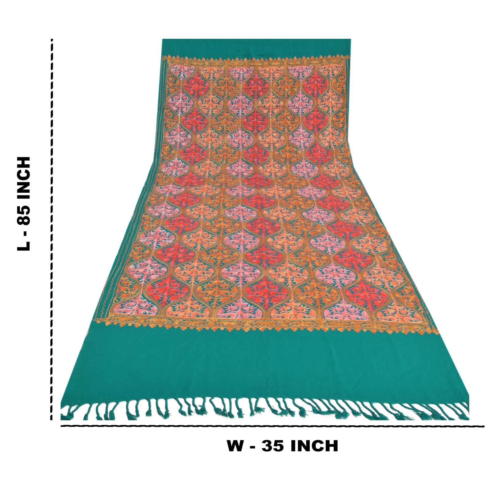 Sanskriti Vintage Long Green Woolen Shawl Hand Embroidered Ari Work Scarf Stole