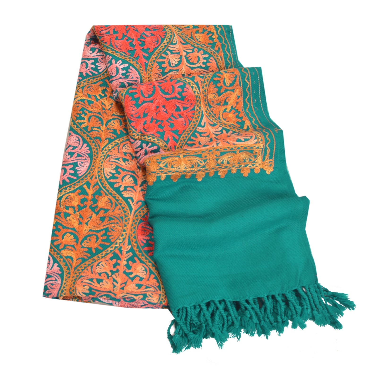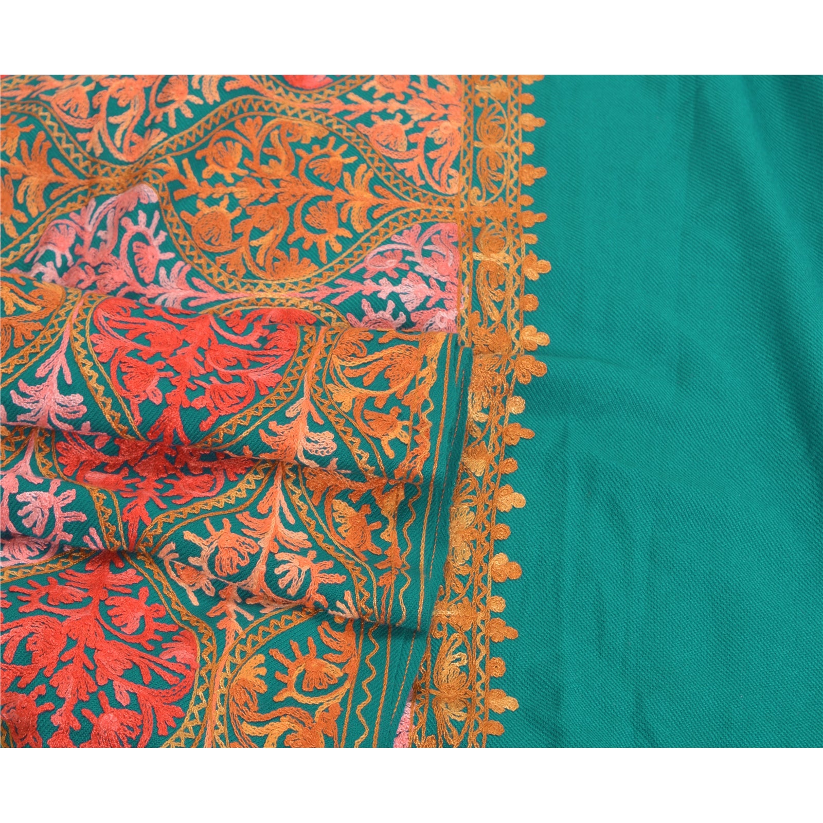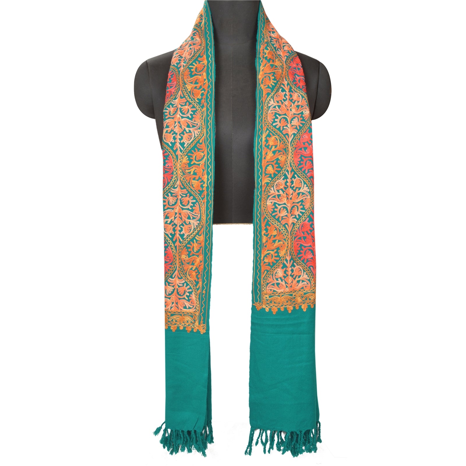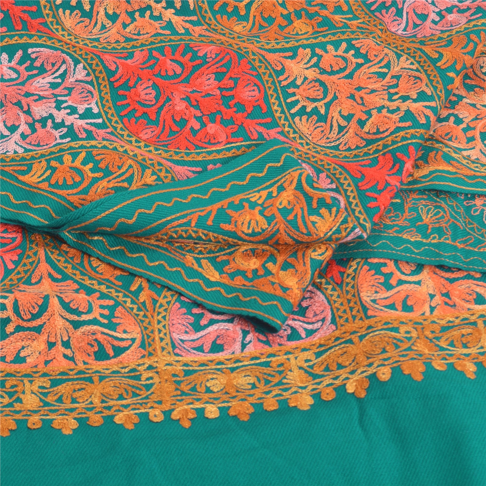 Sanskriti Vintage Long Green Woolen Shawl Hand Embroidered Ari Work Scarf Stole
