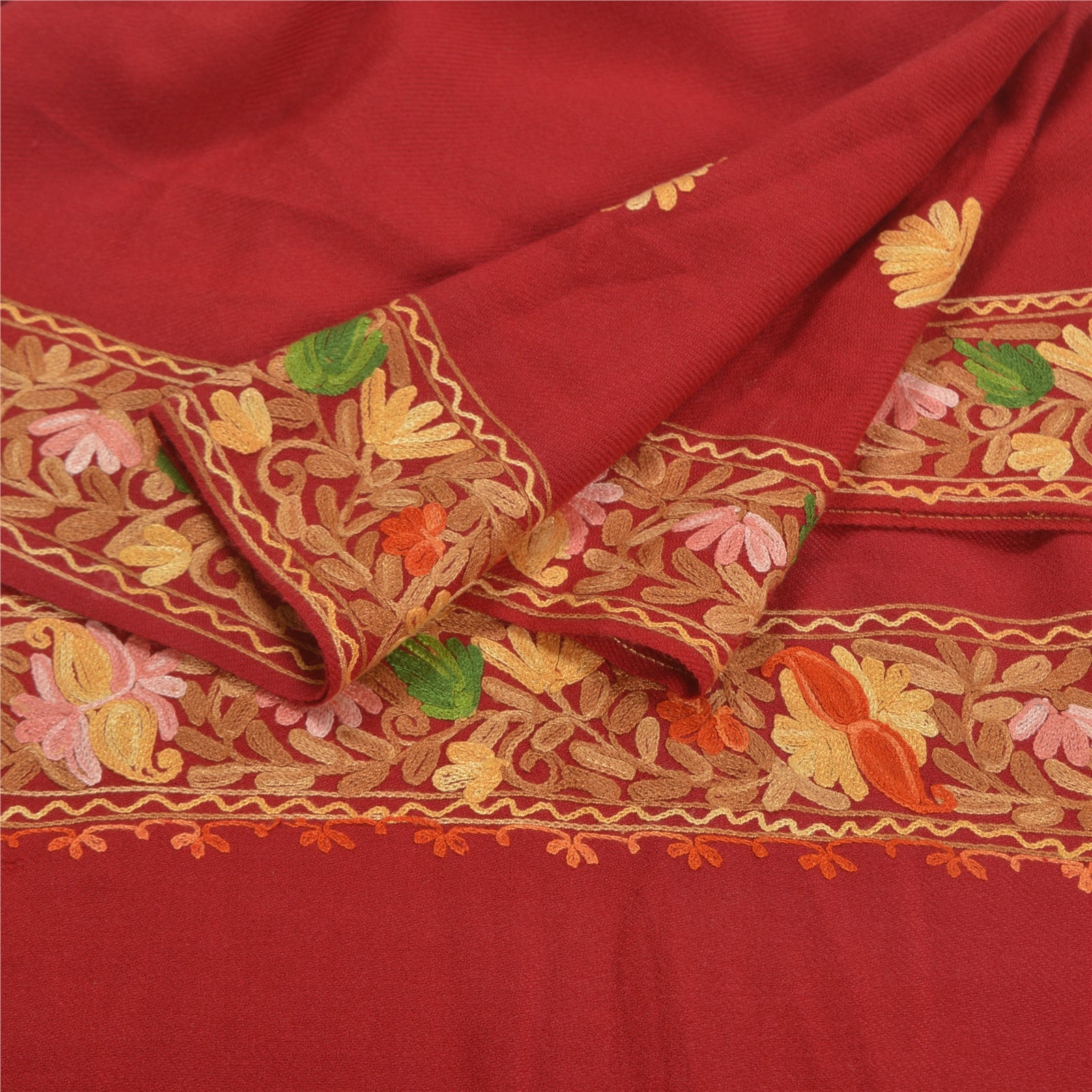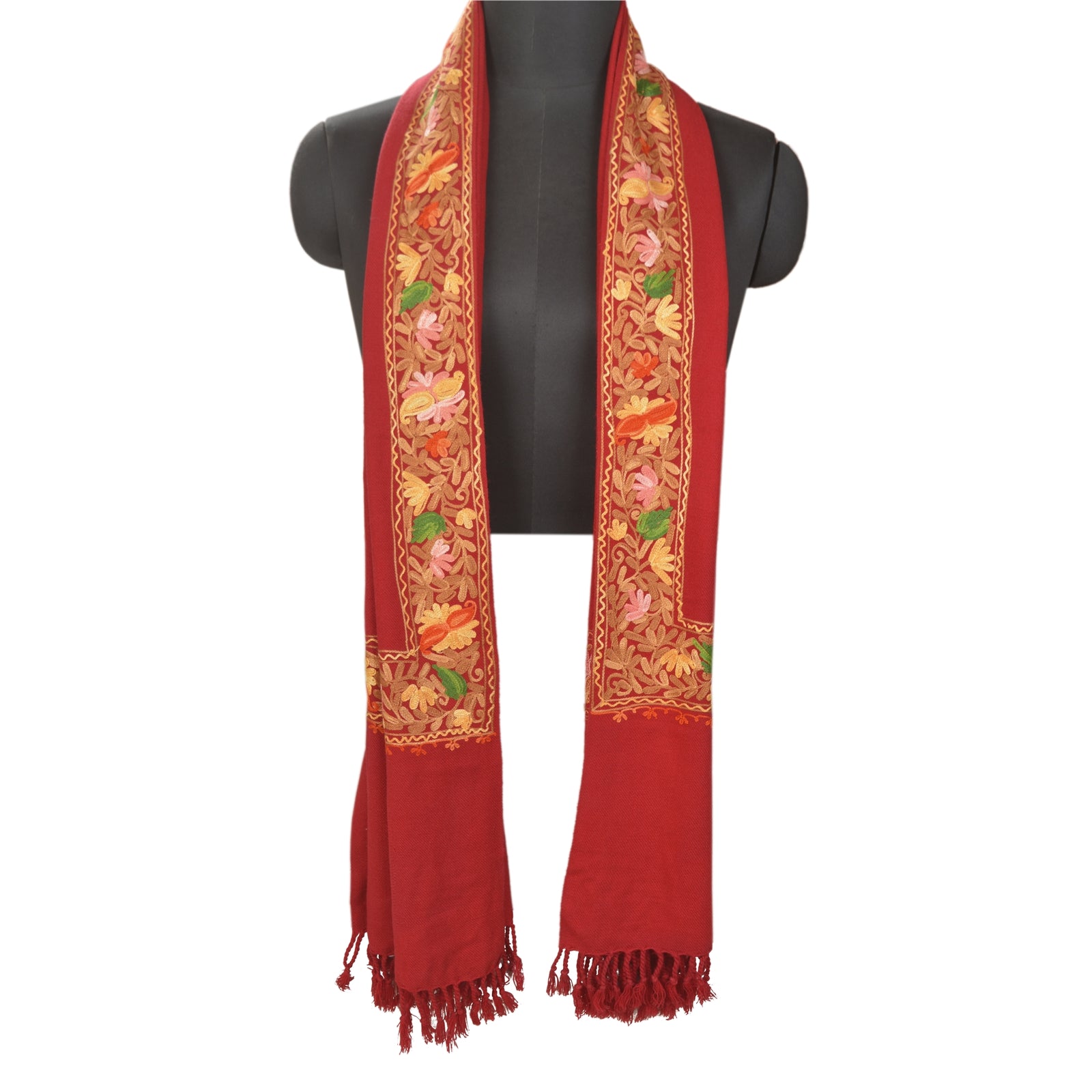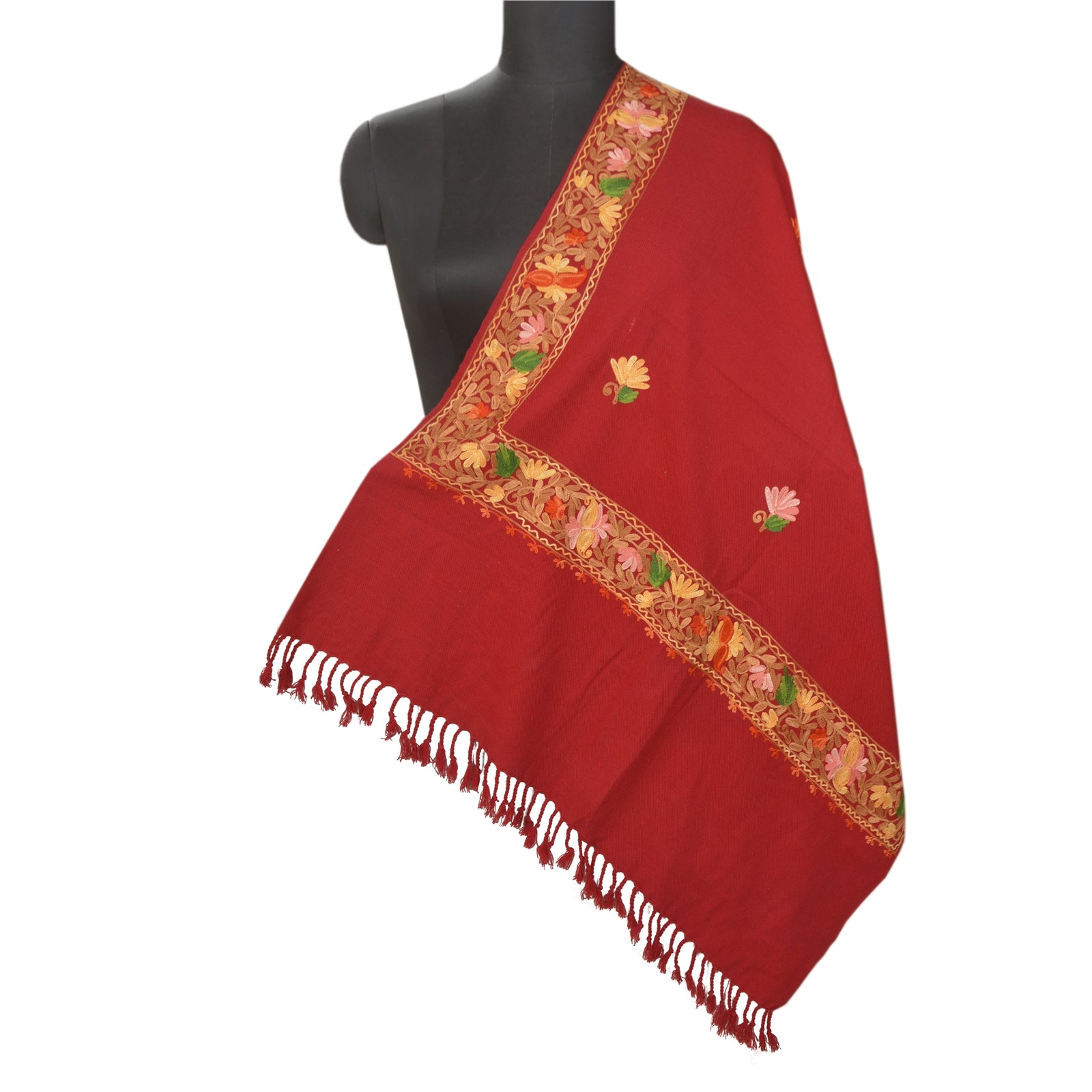 We Are Offering You A Vintage Dark Red Color 100% Pure Woolen Stole/Shawl Which Adorns Hand Embroidered Ari Work. Border & Center Part Of Shawl Handmade Traditional Ari Work with floral pattern. Shawl Has Matching Fringes On Borders. This cozy, warm and fuzzy stool is soft against skin due to the mellow woolen Sustainable Fabric. This cozy, warm and fuzzy stool is soft against skin due to the mellow woolen Sustainable Fabric. A truly gorgeous piece which will also make an admirable gift. ARI WORK:Aari embroidery or crewel work is a specialty of artisans from Kashmir (North India).The craft of Aari embroidery has existed in India from the 12th century and was patronized by the Mughals. Its main features are the fine, concentric rings of chain stitch using a long hooked needle known as a crewel or Aari Needle. In this technique The thread is held below the cloth to be embroidered and the point of the ari is pushed through the Sustainable Fabric to pick up and pull through to the surface a loop of thread. The point of the aari is then again inserted into the Sustainable Fabric through this loop and the process is repeated, so that a continuous line of chain stitch begins to be formed.