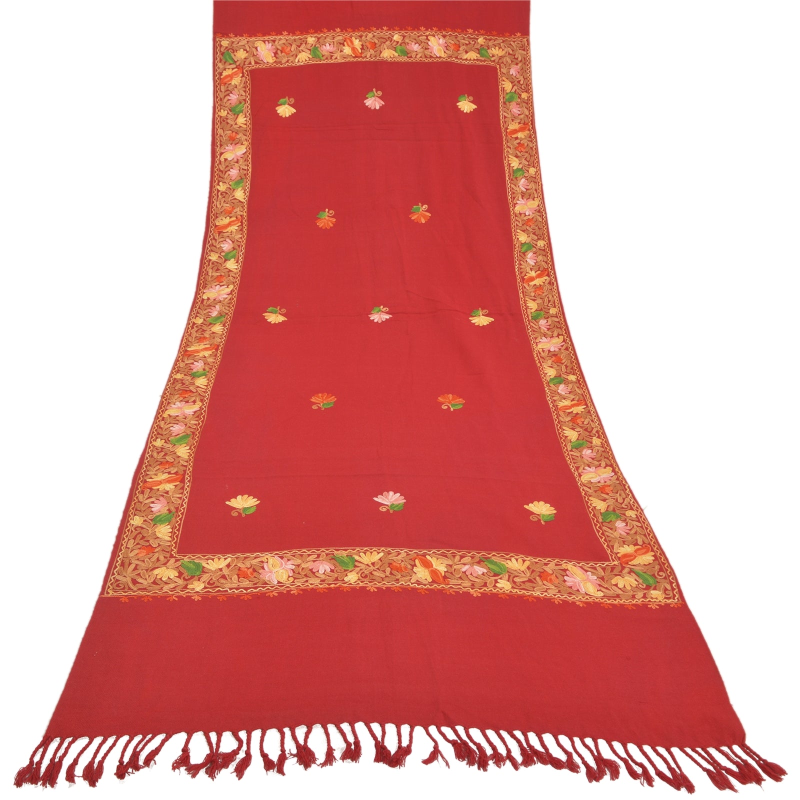 Sanskriti Vintage Long Pure Woolen Dark Red Shawl Handmade Ari Work Scarf Stole