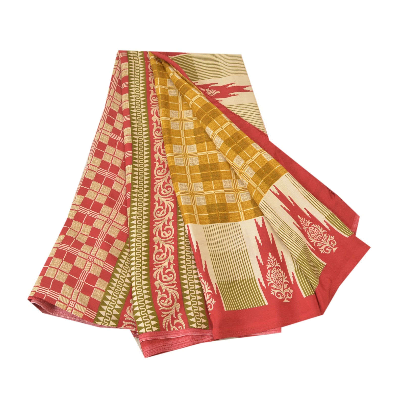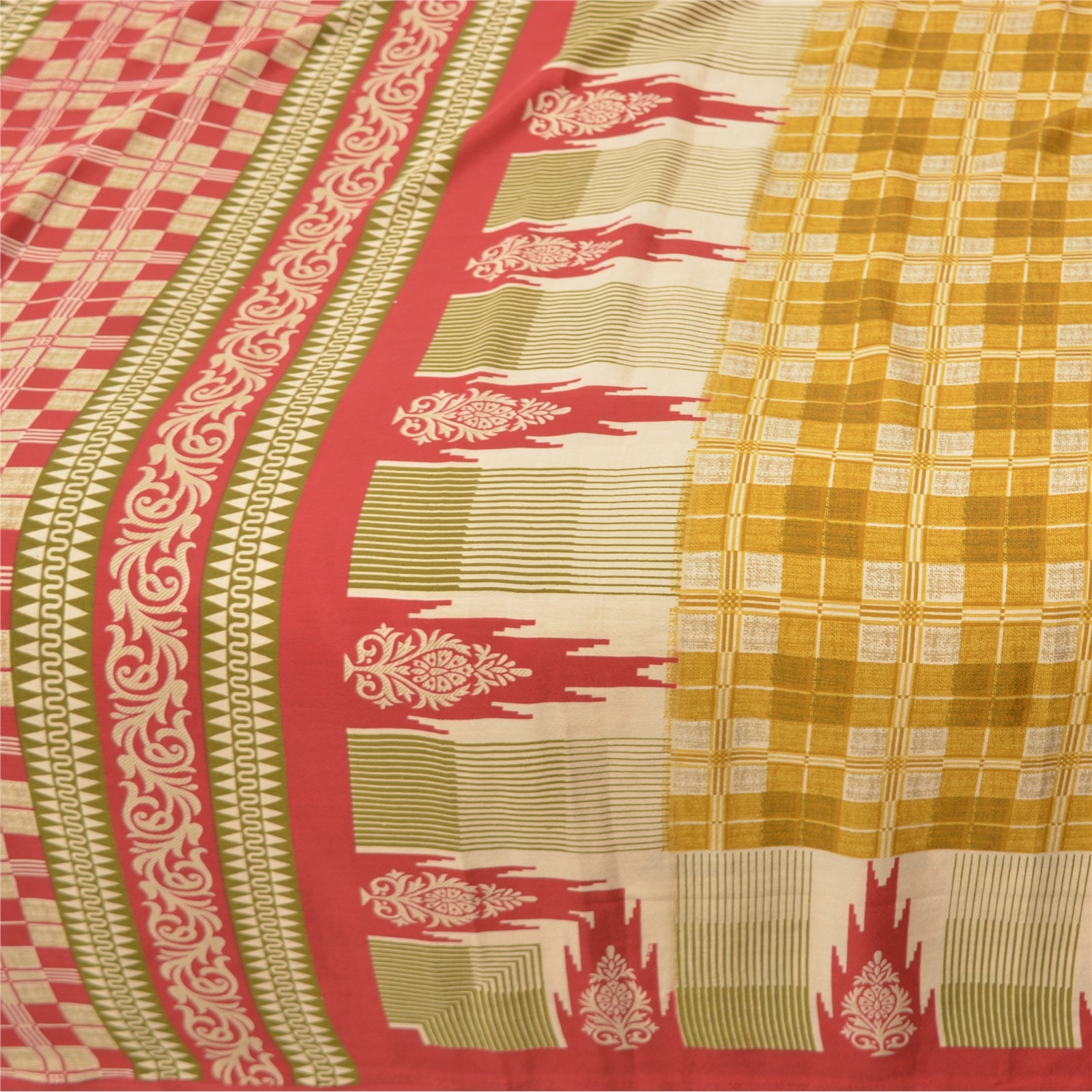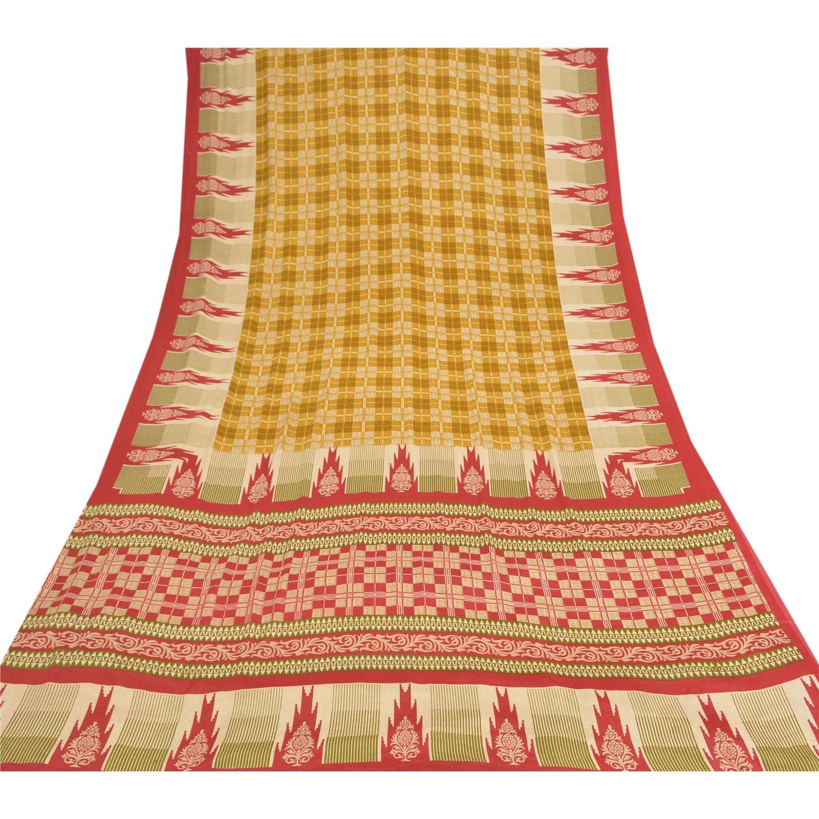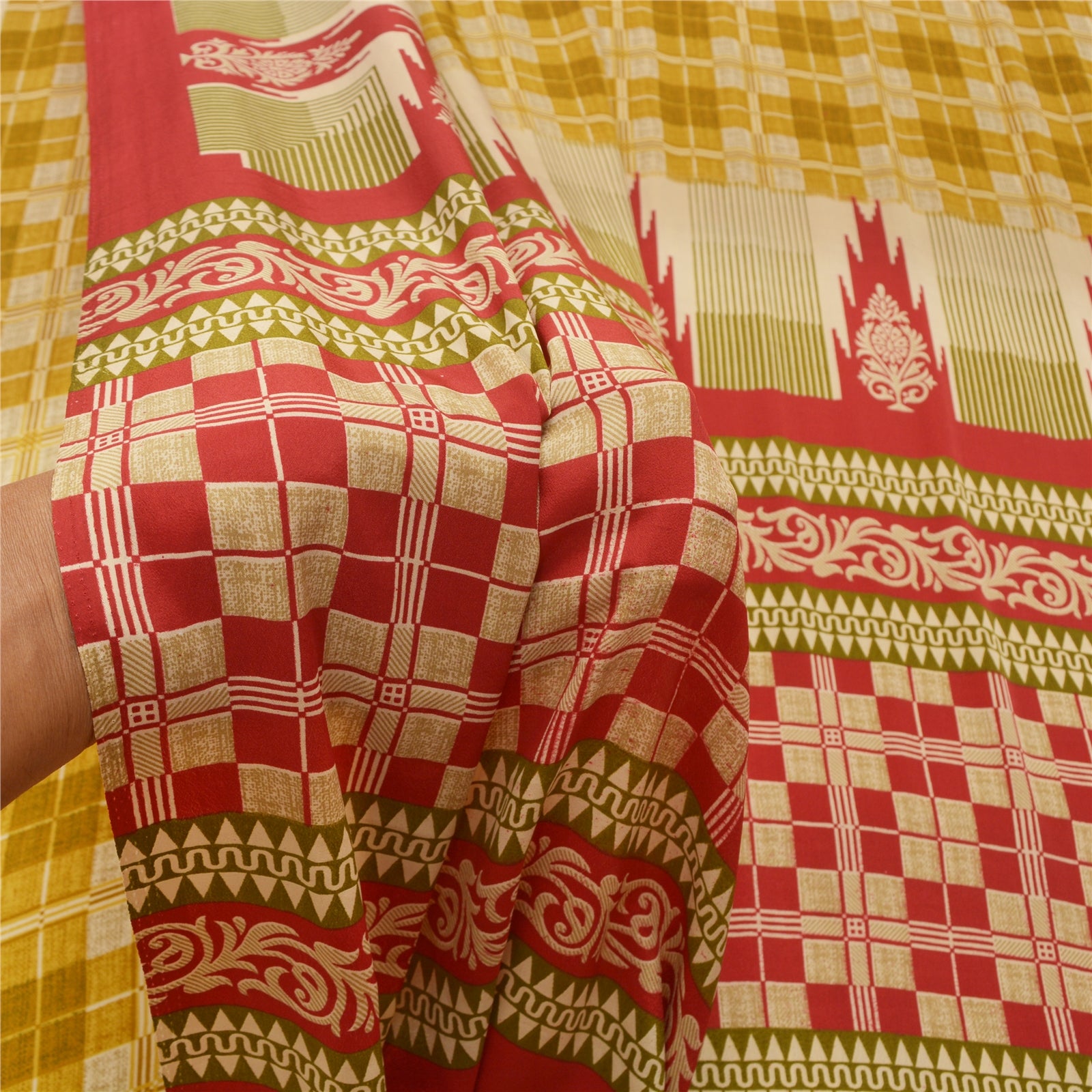 • Beautiful mustard green & red colored printed moss crepe saree . • Pallu & Border has printed floral & geometric design . • Square design in center part of sari. Moss Crepe- This sari is polyester but it feels like crepe silk. What is special about this saree? Very soft & smooth moss crepe Sustainable Fabric with attractive colorful print & pattern is beauty of the saree. This unique vintage saree can be used for various crafting ideas even if you don't want to use it as a sari. Design a dress, use it as a throw, as window dressing, upholstery, sarongs, table linen and much more. Let your creative juices flow and use this decorated Sustainable Fabric in multiple fashion.