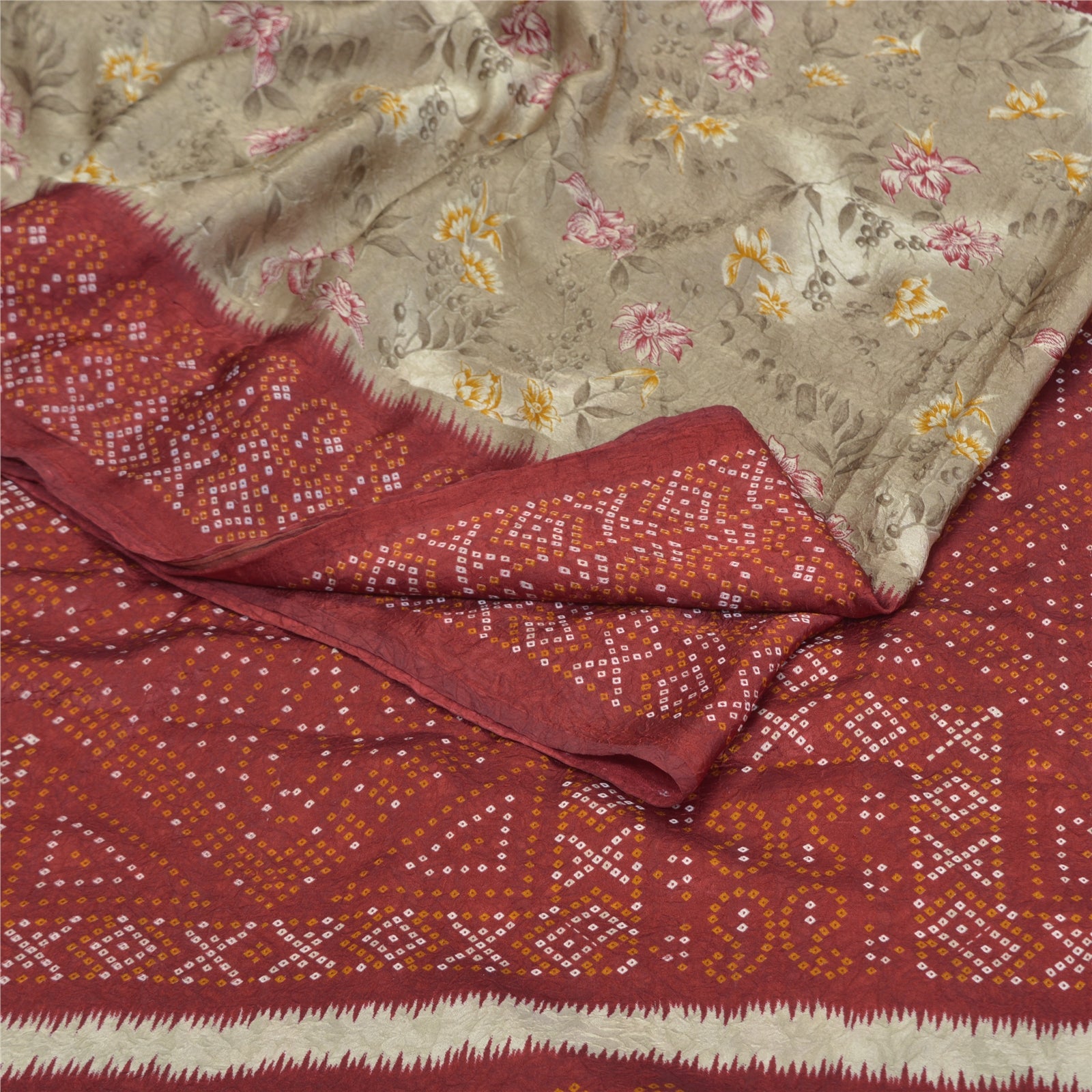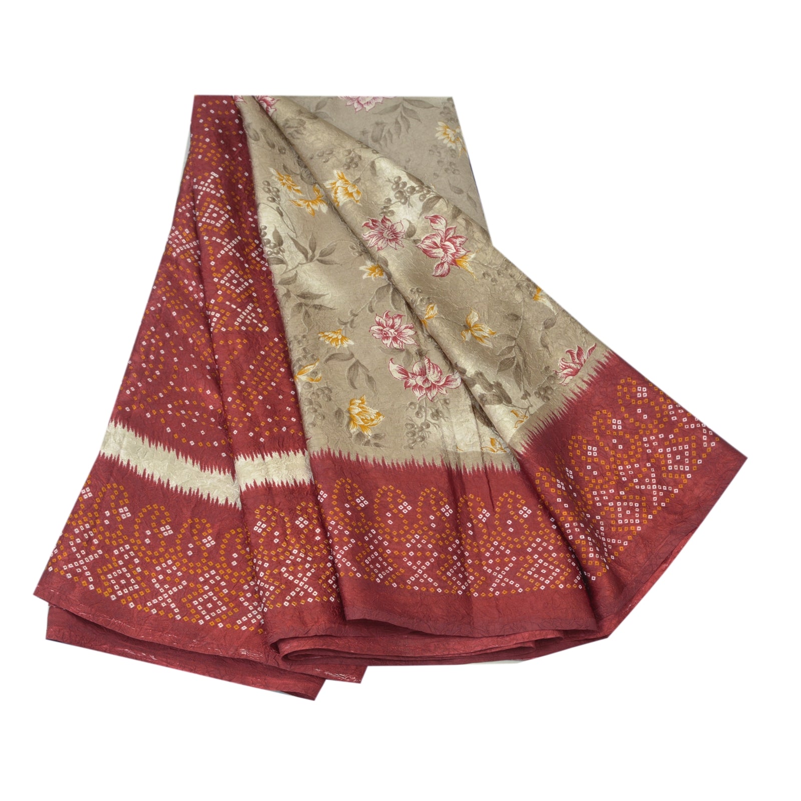 Beautiful pale cream and dark red colored printed moss crepe saree. Pallu & Border has printed bandhani design. Floral design in center part of sari. What is special about this saree? Nice floral and bandhani design with extremely smooth moss crepe base Sustainable Fabric is really enhancing the beauty of the saree. This unique vintage saree can be used for various crafting ideas even if you don't want to use it as a sari. Design a dress, use it as a throw, as window dressing, upholstery, sarongs, table linen and much more. Let your creative juices flow and use this decorated Sustainable Fabric in multiple fashion. Please note - Buyers from Australia are required to pay postage. Registered air mail to Australia is temporarily suspended due to the pandemic. Once it goes back to normal we'll revert to free shipping. For now, we are using Aramex and DHL to ship orders. These services are expensive but faster compared to regular mail. Thank you for your support. If you are buying in bulk we will refund whatever excess is left. Contact us after that purchase. For USA buyers - Single item ships via registered air mail, buy 1 more to get FedEx.