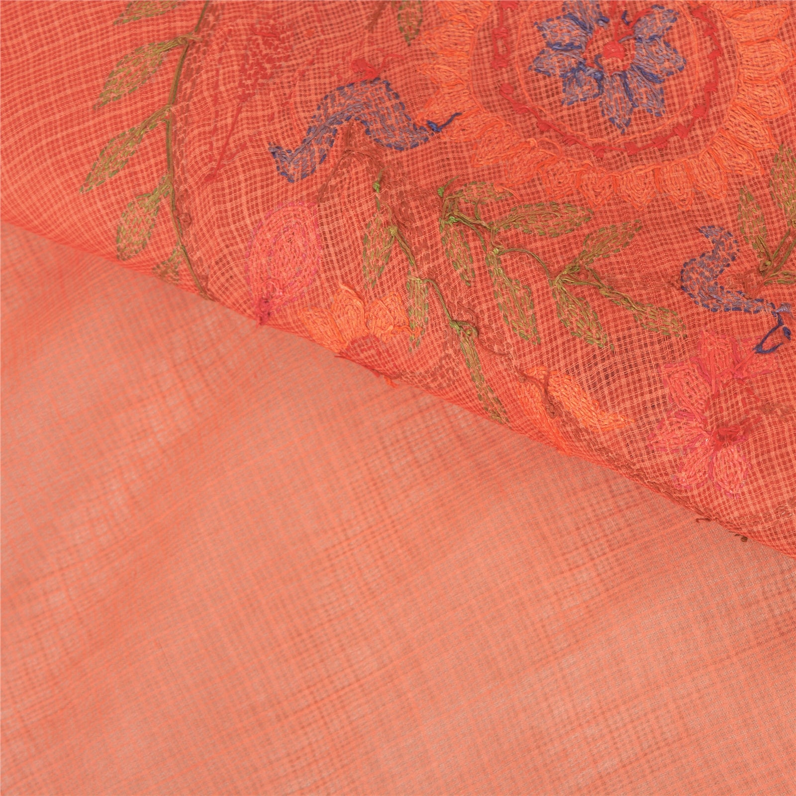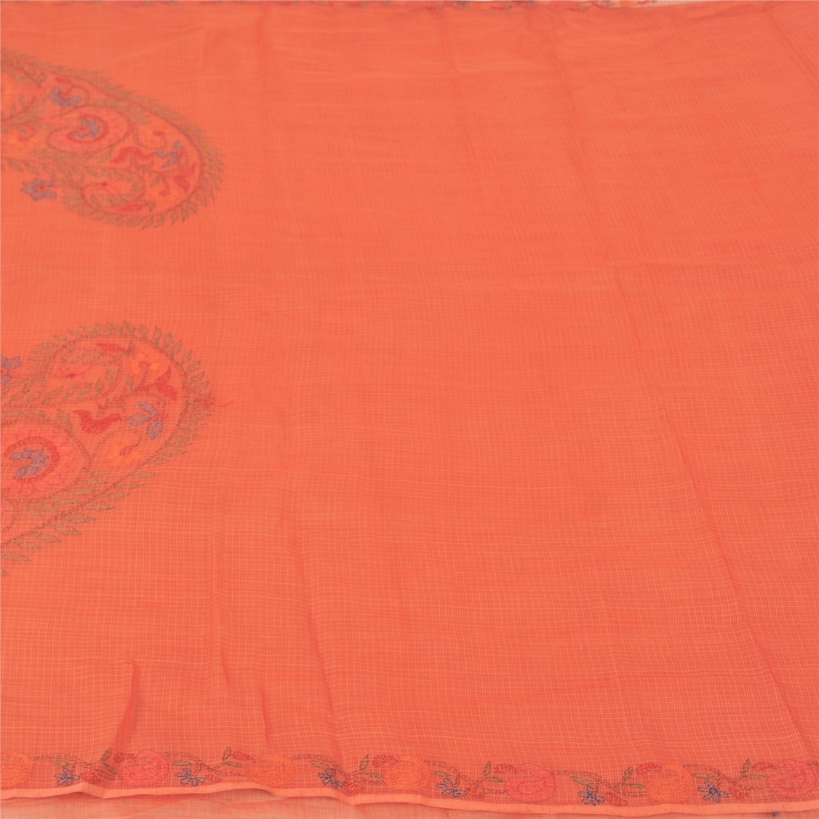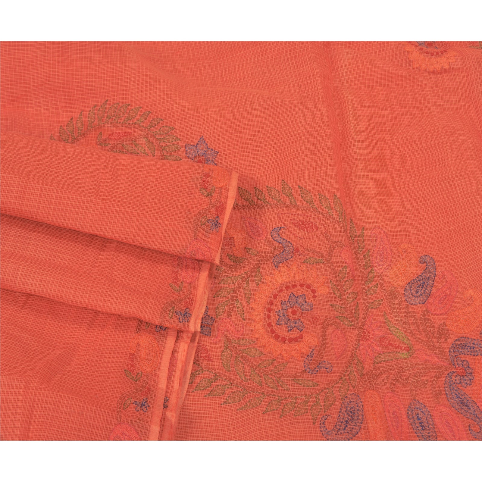 Beautiful shade of peach colored 100% pure cotton hand embroidered woven Kota sari. Pallu & border has embroidered multicolor thread work floral & paisley design. The center of the saree has thread floral design. You can see all over sari base Sustainable Fabric tiny square woven work. This saree can be used for various crafting ideas too. Use it for dress designing, as a throw, as window dressing, upholstery, table linen and much more. Let your creative juices flow.