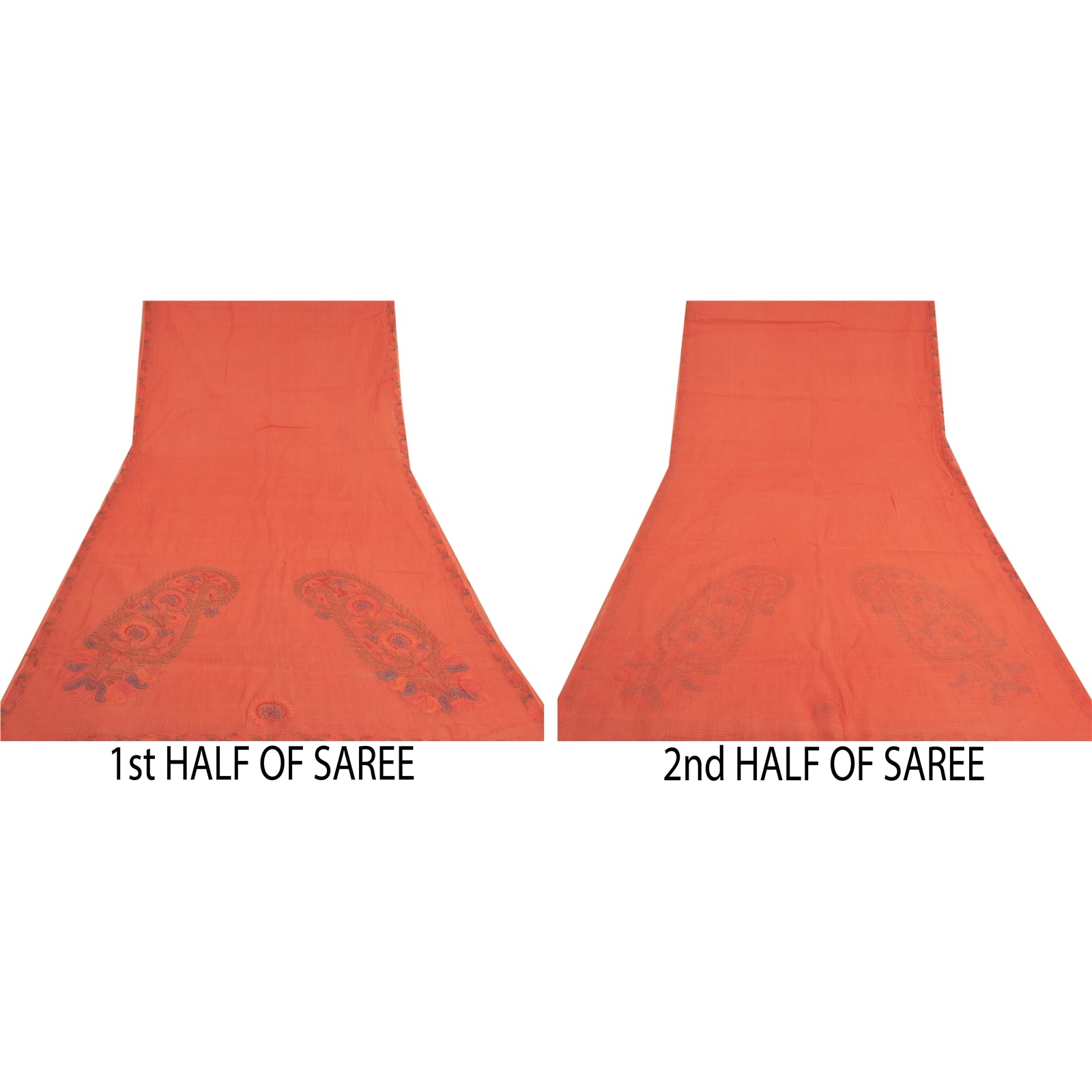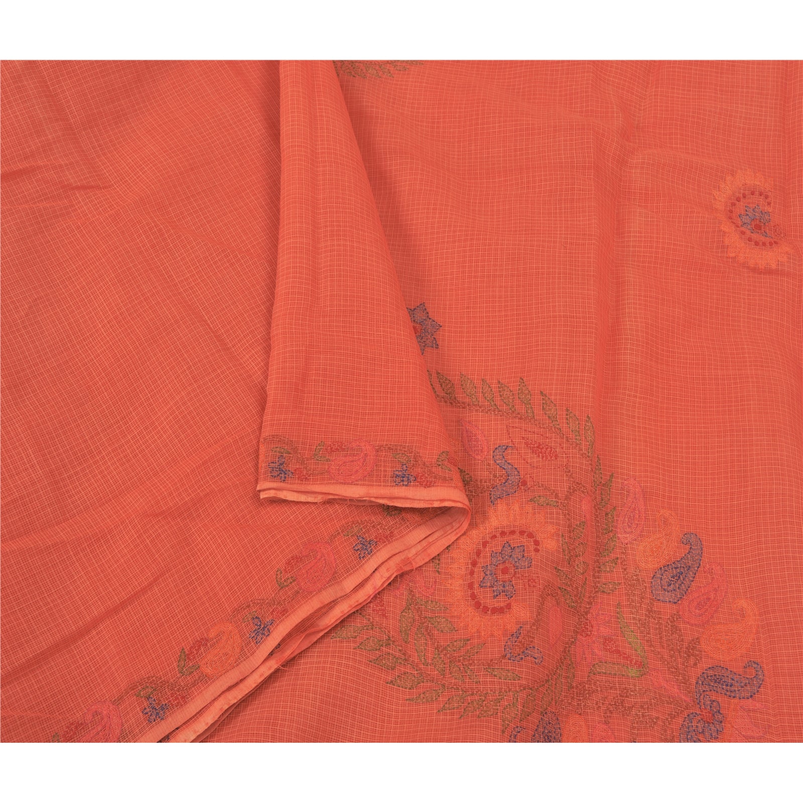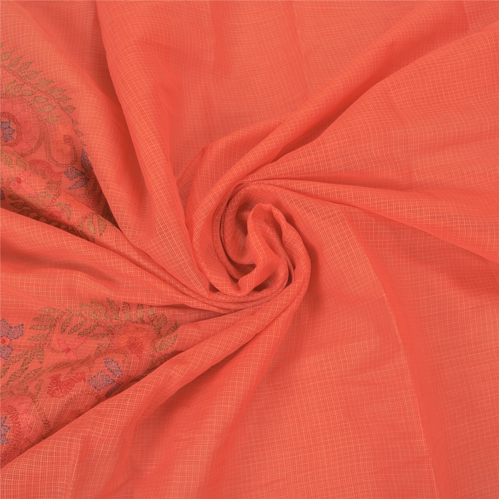 Beautiful shade of peach colored 100% pure cotton hand embroidered woven Kota sari. Pallu & border has embroidered multicolor thread work floral & paisley design. The center of the saree has thread floral design. You can see all over sari base Sustainable Fabric tiny square woven work. This saree can be used for various crafting ideas too. Use it for dress designing, as a throw, as window dressing, upholstery, table linen and much more. Let your creative juices flow.