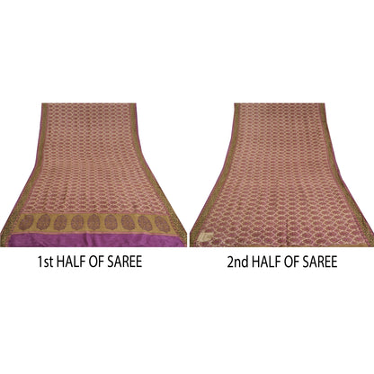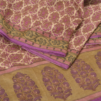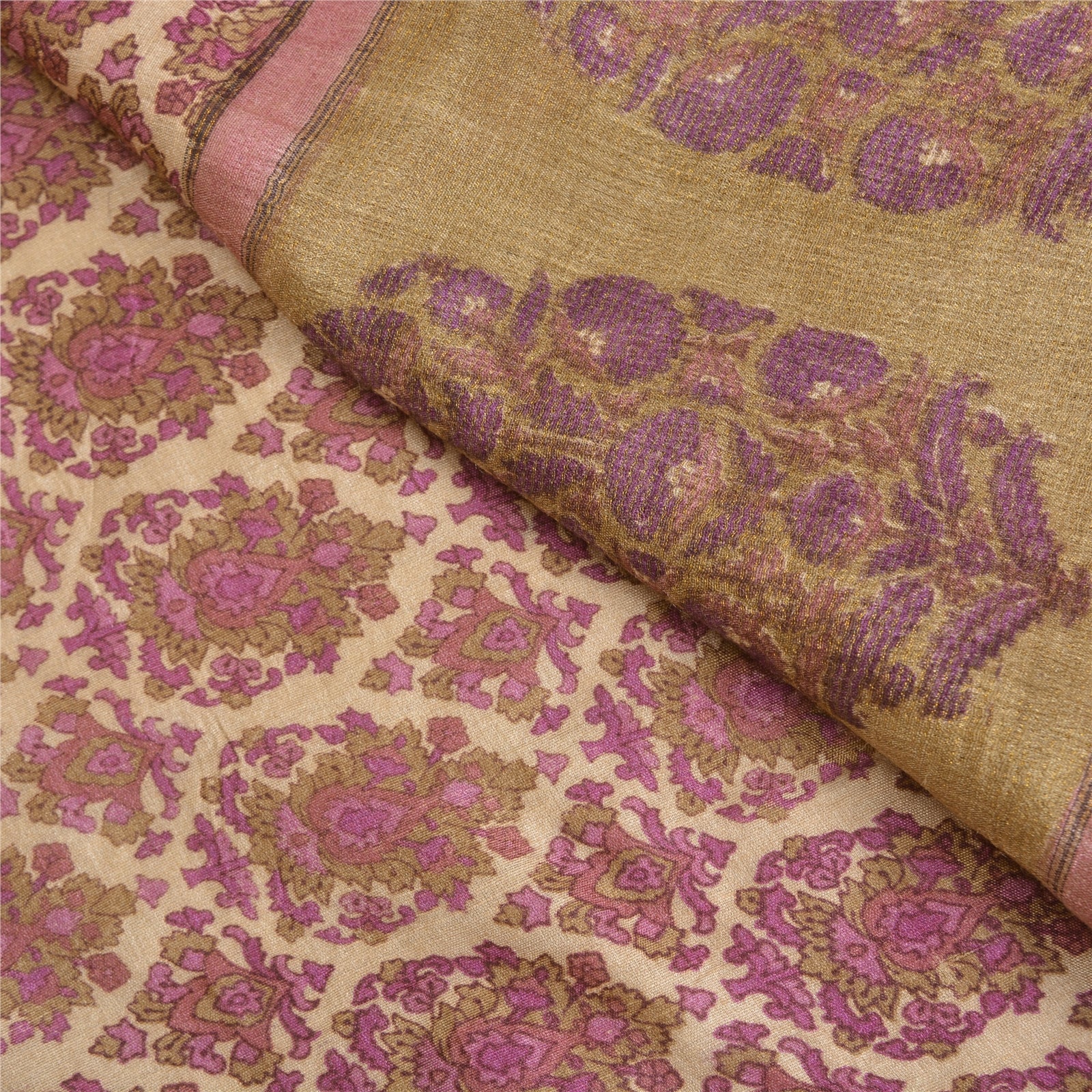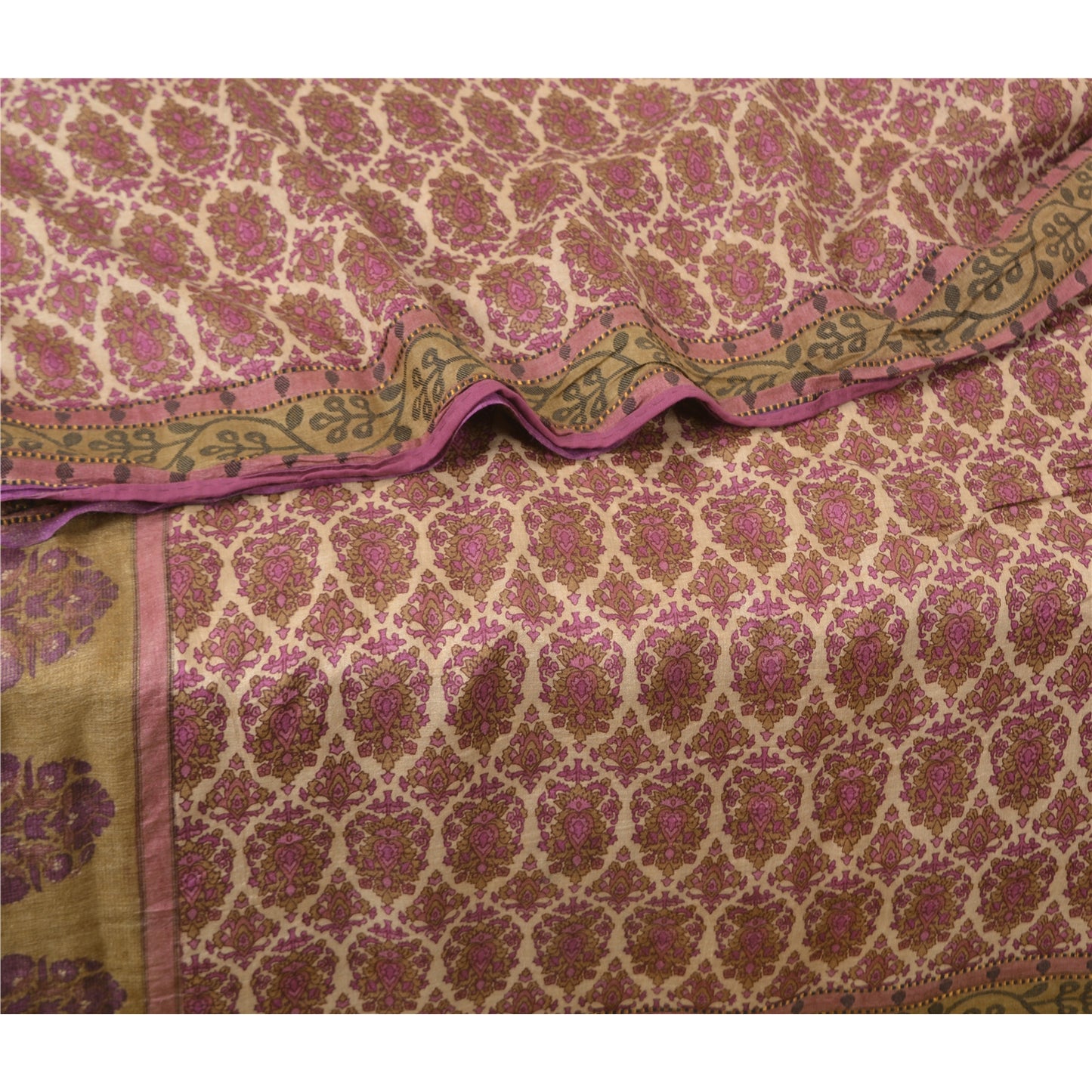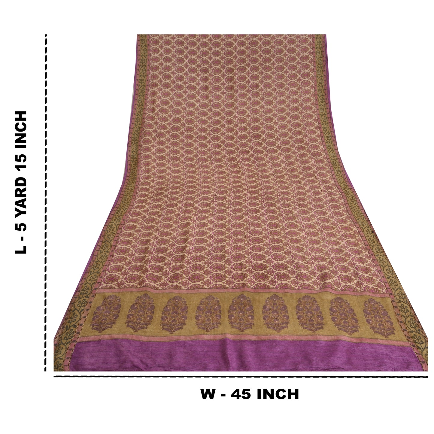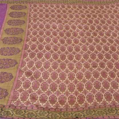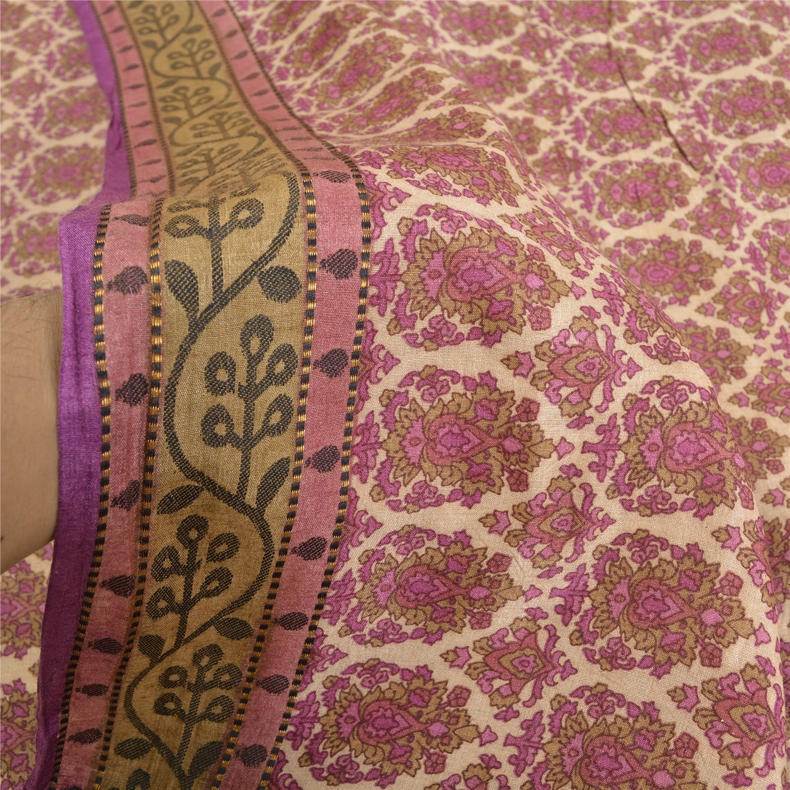 Sanskriti vintage Pink/Ivory Sarees Pure Woollen Printed 5 Yd Sustainable Fabric Craft Sari