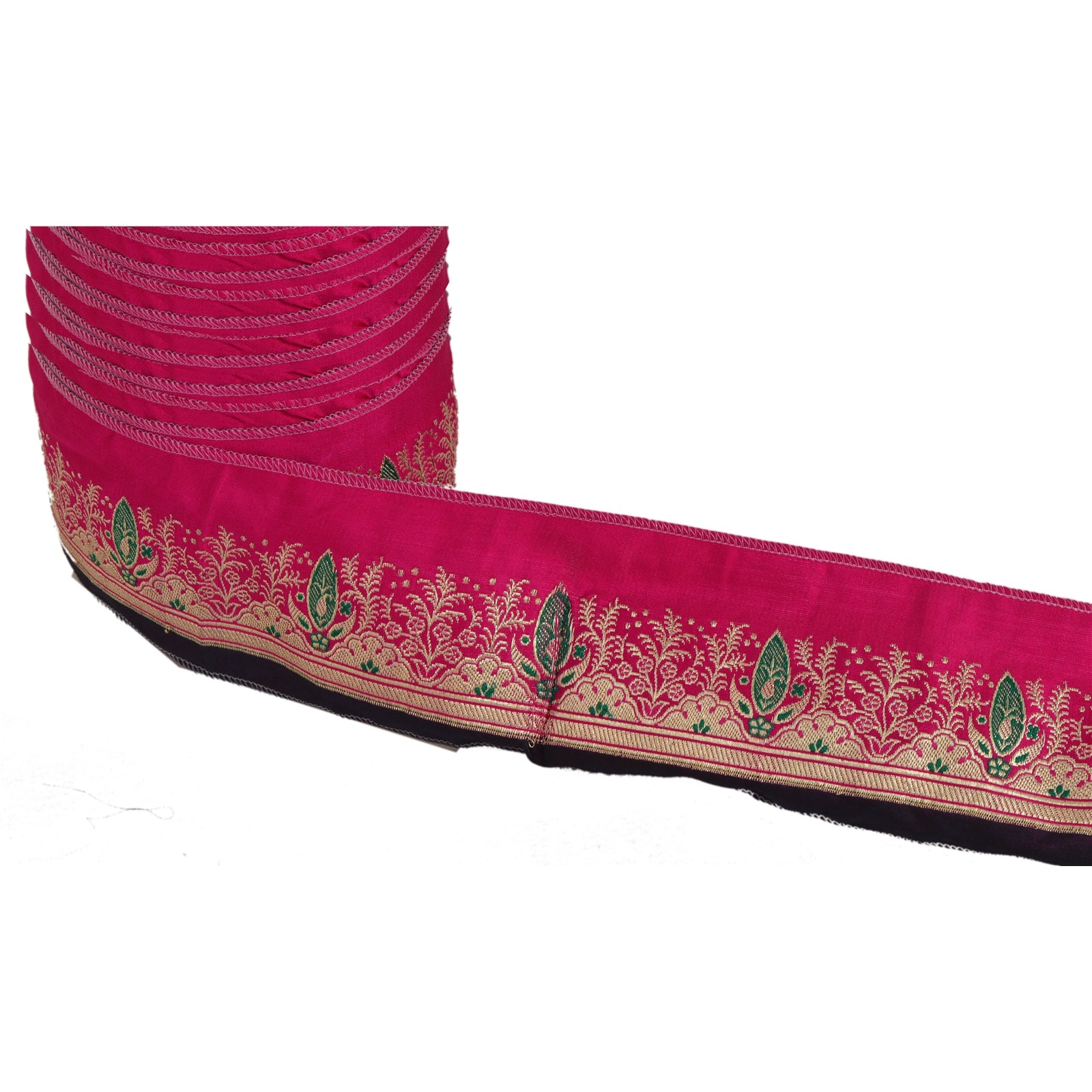 Outstanding pure satin silk woven brocade sari border in pink color highlighting zari work. Border has beautiful floral & paisley patterns painstakingly golden zari (electroplated copper metallic thread) work, green thread work. WOW!! an awesome one of a kind versatile border. 1 Quantity = 1 Yard