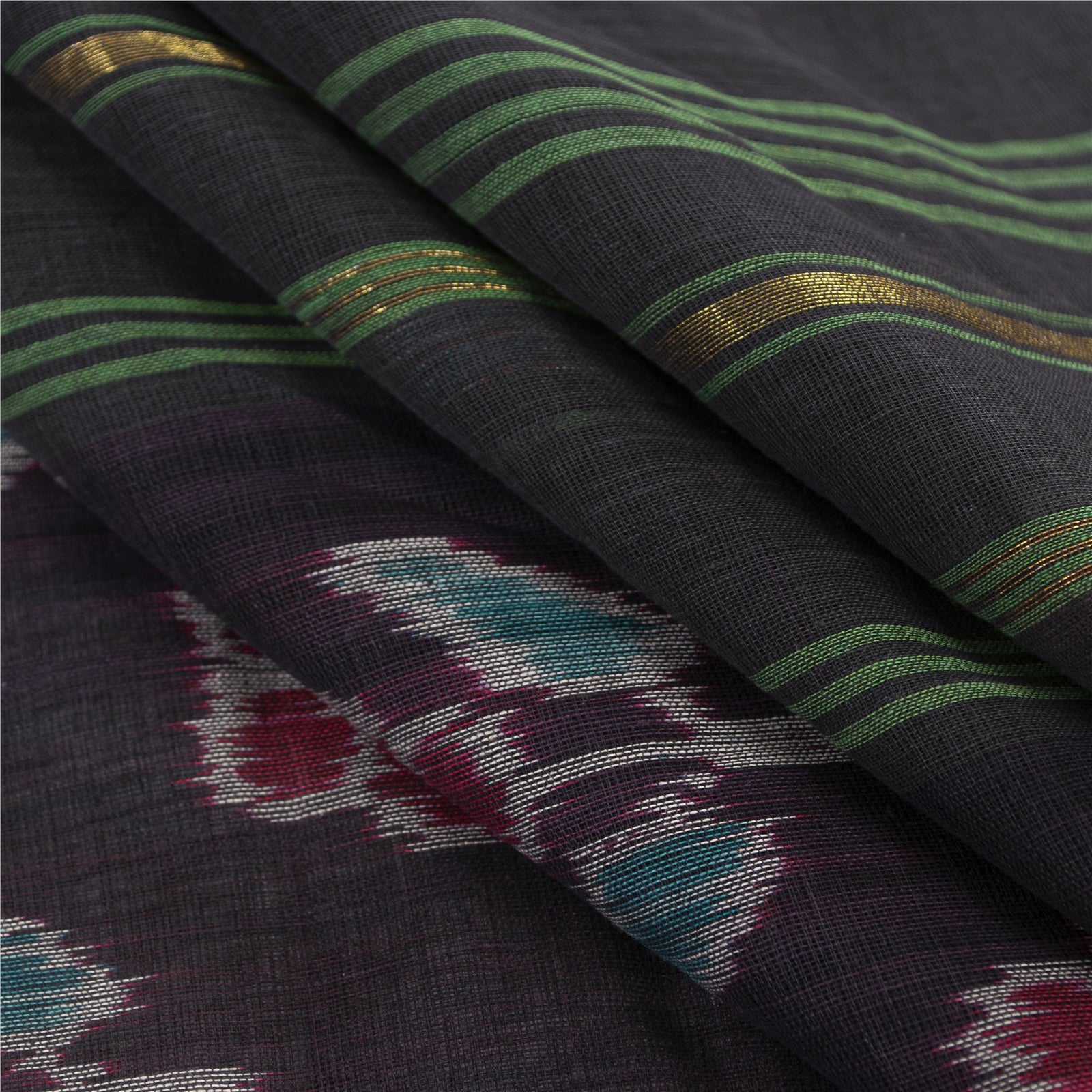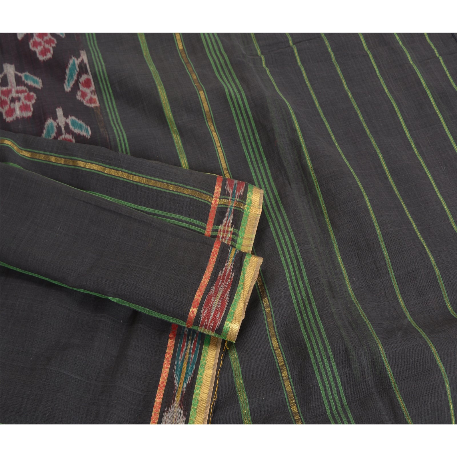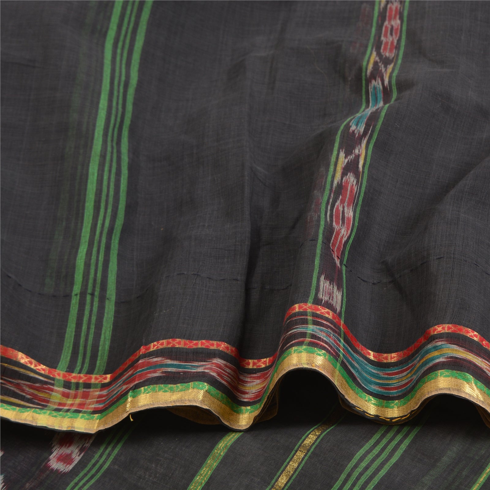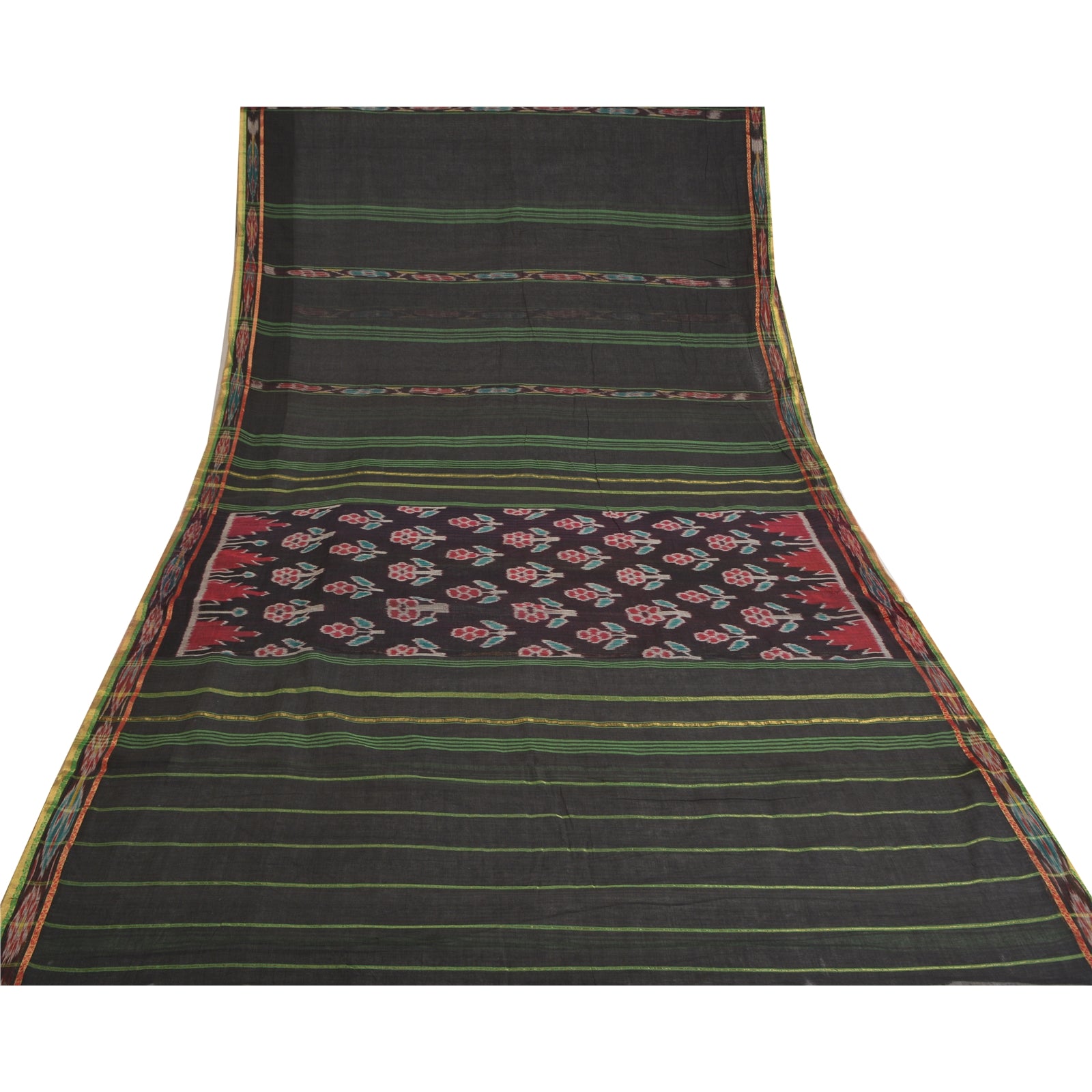 Sanskriti Vintage Saree Black Odisha Hand Woven Ikat Pure Cotton Sari 5yd Fabric