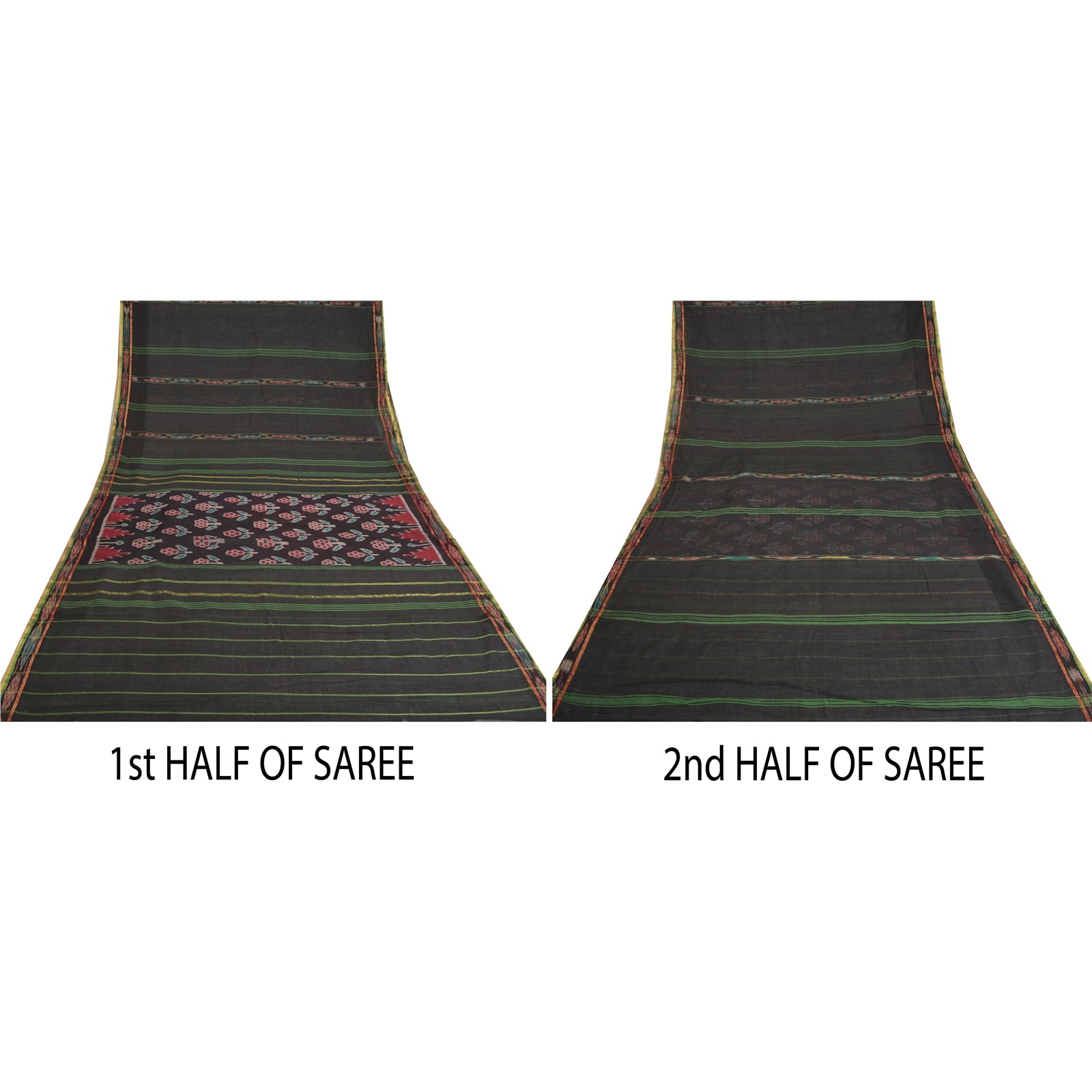 THE ITEM COLOR OR SHADE MAY BE DARKER OR LIGHTER THAN THE PICTURE.' Traditional black colored pure cotton hand ikat woven & zari woven odisha sari. Pallu & Border features floral & lines design with ikat woven work & golden zari woven work. Similar work in center part of saree. What is special about this saree? Intricate ikat hand woven work on pure silk base fabric is really enhancing the beauty of the saree. This unique vintage saree can be used for various crafting ideas even if you don't want to use it as a sari. Design a dress, use it as a throw, as window dressing, upholstery, sarongs, table linen and much more. Let your creative juices flow and use this decorated fabric in multiple fashion. ODHISA This Saree is a traditional hand woven ikat where in the warp and the weft are tie-dyed before weaving. It is produced in Odisha(Eastern India). Sarees are made from fabric woven on a hand-loom and are known for their incorporation of traditional motifs like shankha (shell), chakra(wheel), phula (flower), all of which have deep symbolism, but the highpoint of these sarees is the traditional craftsmanship of the Tie-dye art reflected in their intricate weaves. In this technique, the threads are first tie-dyed and later woven into a fabric, with the entire process taking many weeks. Sambalpur, Boudh, dhalapathar and Sonepur districts of Odisha are mainly famous for ikat woven sarees. International buyers please note: Import duties, taxes, and charges are not included in the item price or postage cost. These charges are the buyer's responsibility. Please check with your country's customs office to determine what these additional costs will be prior to bidding or buying. Buyer will pay custom duty/tax. It is calculated and charged differently by every country. As a seller I do not have any control over it. VAT or sales tax is calculated by the platform at the time of checkout. Customs charge is payable at the time of delivery.' PT-4869