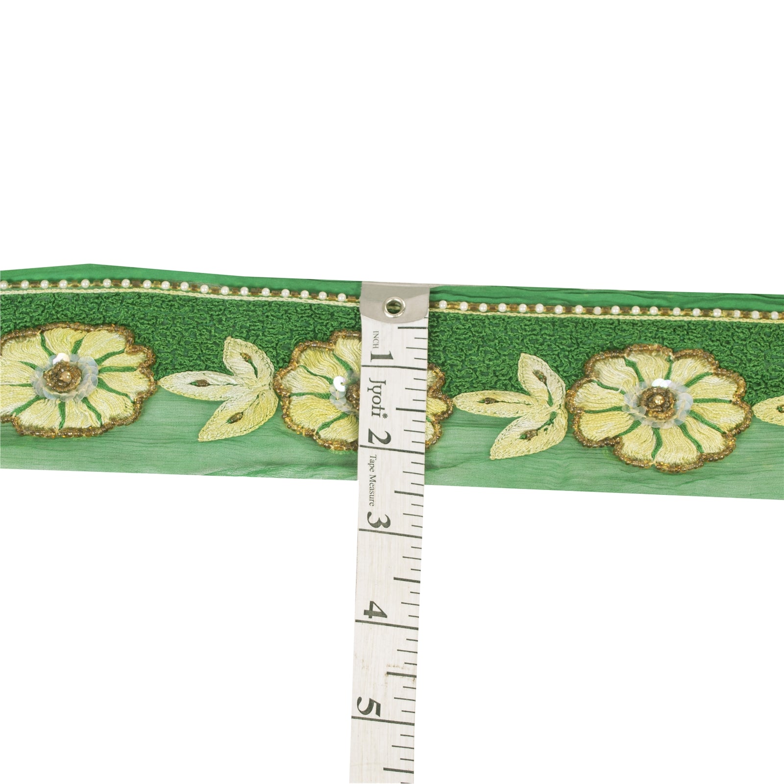 SANSKRITI VINTAGE SAREE BORDER HAND BEADED CRAFT 1 YD TRIMS LACE 2W GREEN