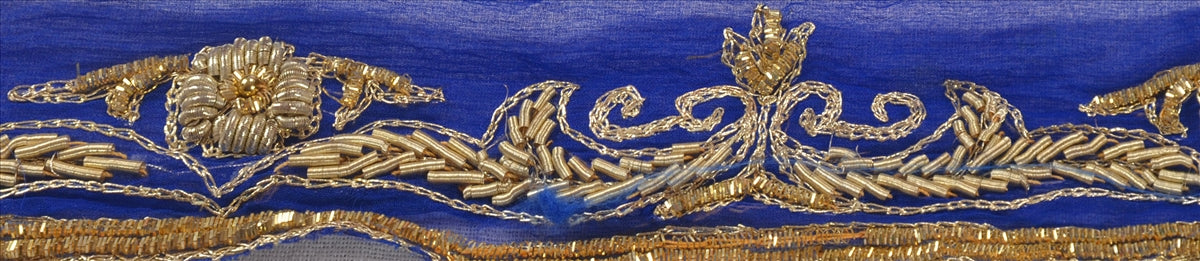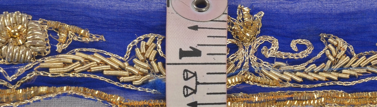 Beautiful pure chiffon silk hand embroidered sari border. Further embellished by gold zari/zardozi/dabka work. Also, you can see gold beads work along with floral design on blue base fabric. 1 Quantity = 1 Yard B-9491
