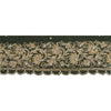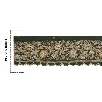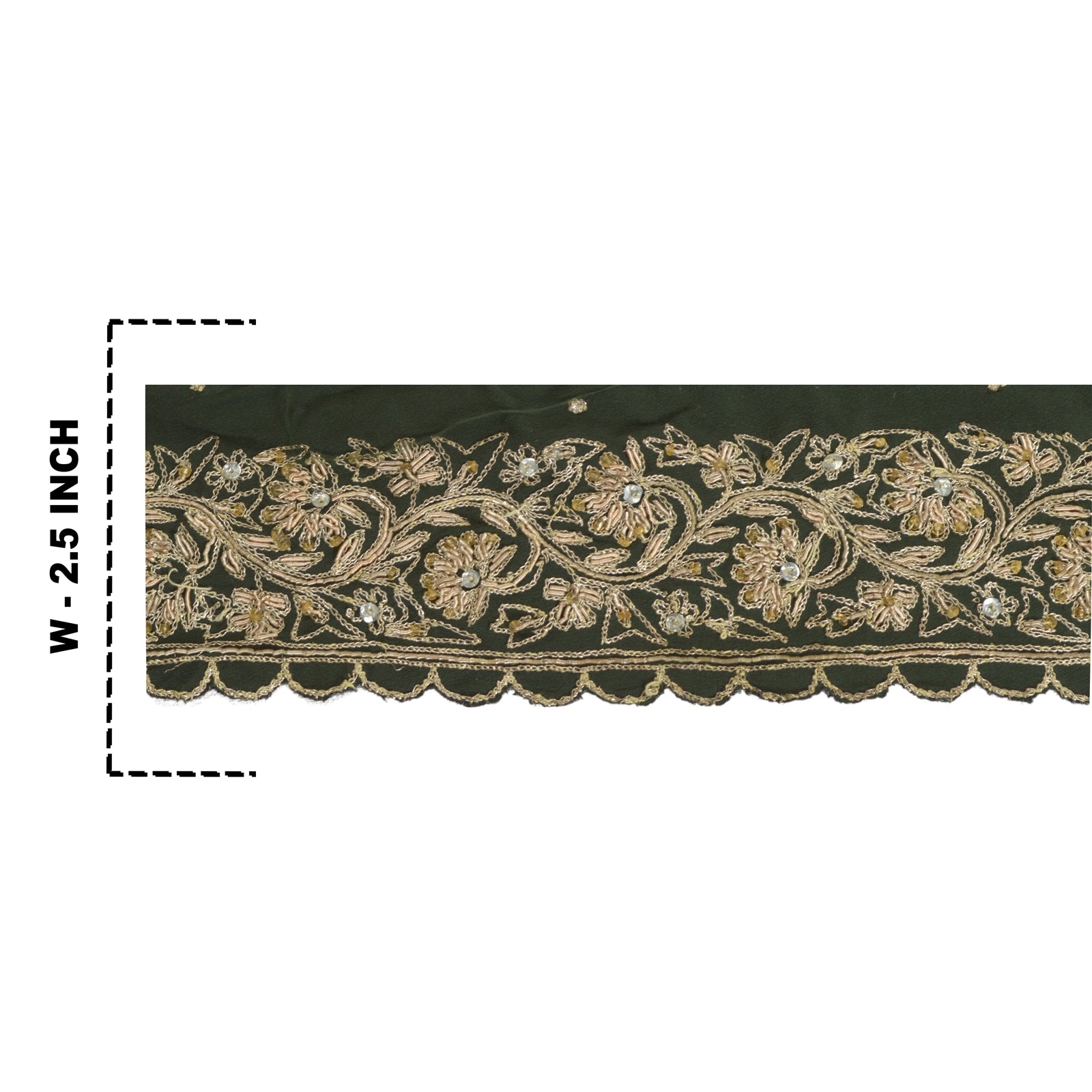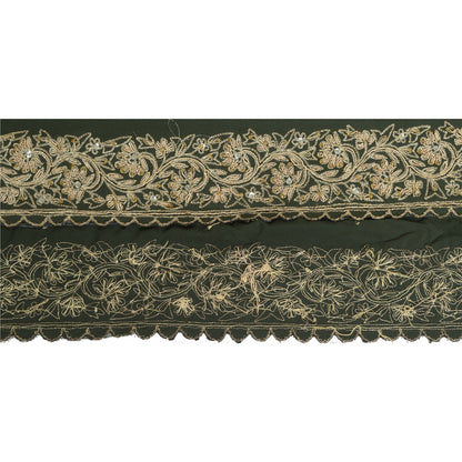 Beautiful pure crepe silk hand embroidered sari border. Further embellished by gold zari/zardozi/dabka work, gold sequins work. Also, you can see white glass beads, silver sequins work along with floral design on deep green base Sustainable Fabric. 1 Quantity = 1 Yard