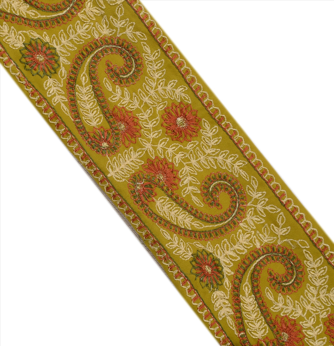 Beautiful art silk hand embroidered sari border. Further embellished by gold zari work, green/cream/orange thread work along with floral & paisley design on green base fabric. 1 Quantity = 1 Yard B-6610