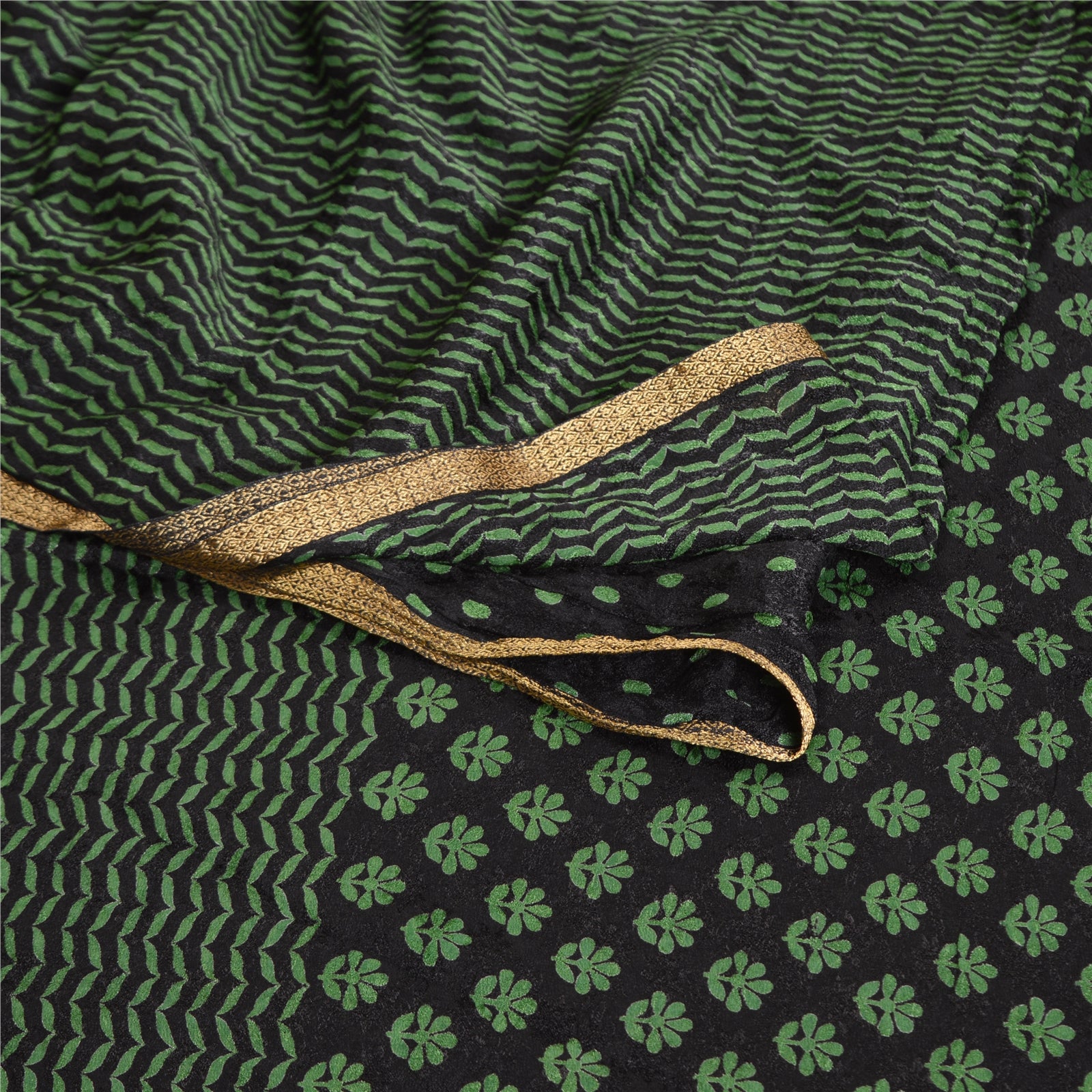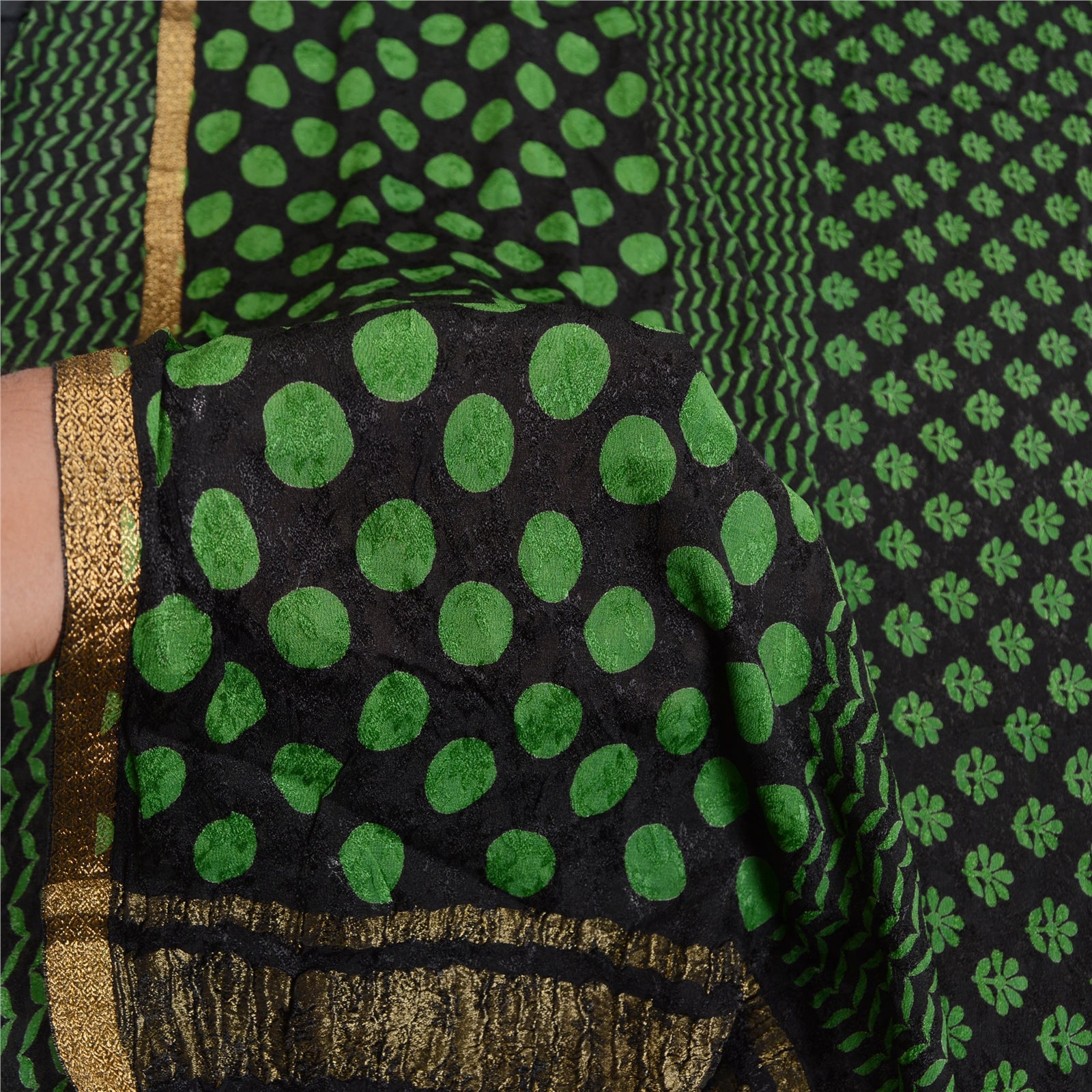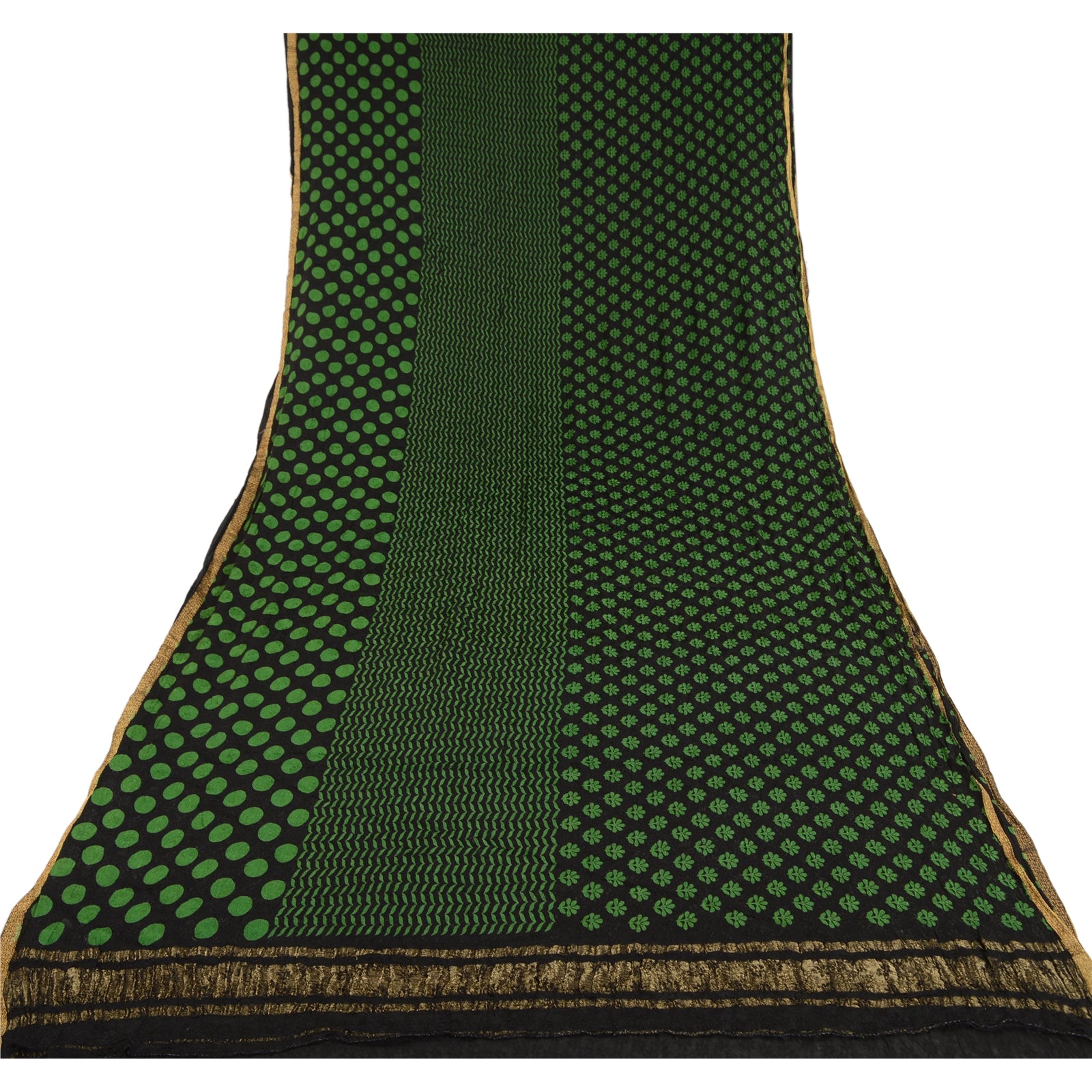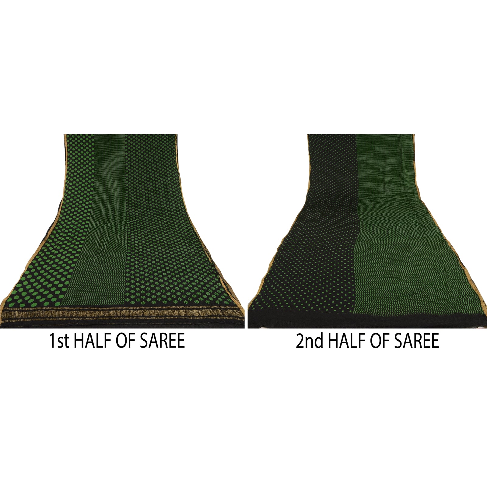 Beautiful black & green colored blend georgette printed saree. Allover sari has printed floral & circle design. Border has floral design with golden zari woven work. What is special about this saree? Brilliant design on soft Sustainable Fabric is really enhancing the beauty of the saree.This unique vintage saree can be used for various crafting ideas even if you don't want to use it as a sari. Design a dress, use it as a as window dressing, upholstery, sarongs, throw, dress making and table linen much more. Let your creative juices flow and use this decorated Sustainable Fabric in multiple fashion.