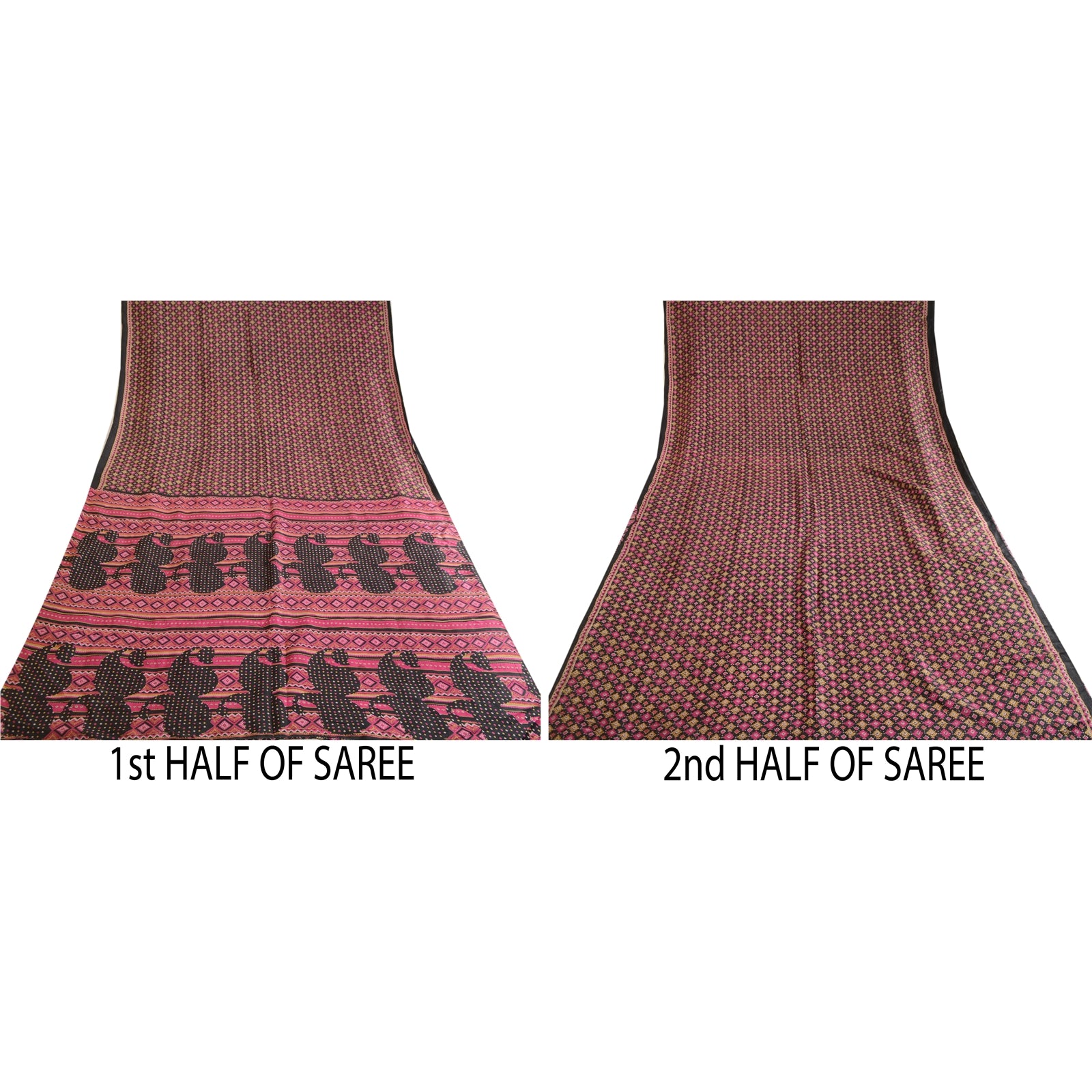 Beautiful black colored pure silk printed saree. Pallu & Border has printed floral & geometric design. Similar design in center part of saree. What is special about this saree? Fabulous design is really enhancing the beauty of the saree.This unique vintage saree can be used for various crafting ideas even if you don't want to use it as a sari. Design a dress, use it as window,dressing, upholstery, sarongs, throw, dress making and table linen much more. Let your creative juices flow and use this decorated Sustainable Fabric in multiple fashion.