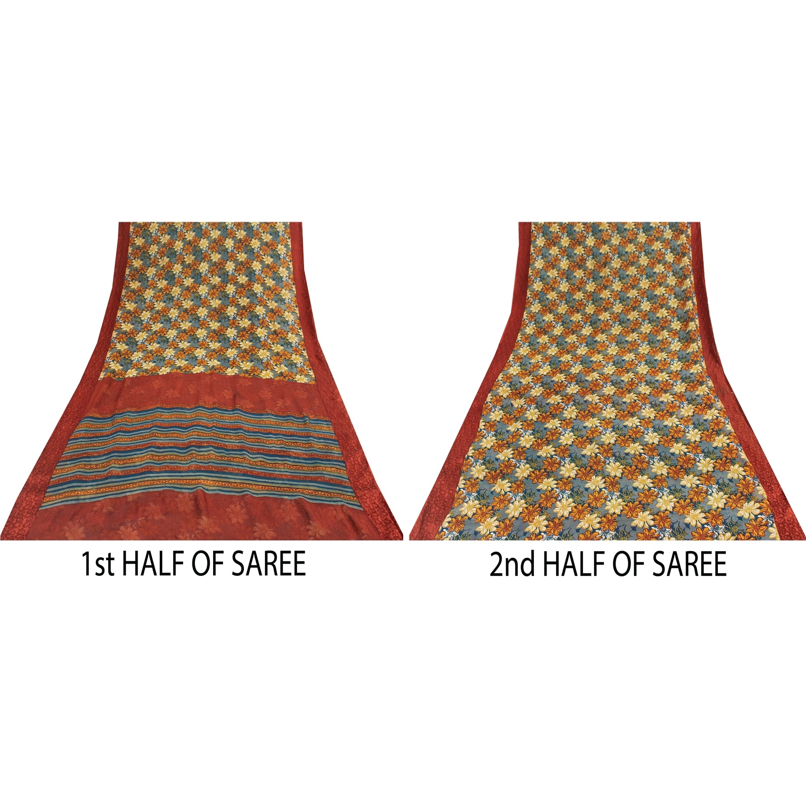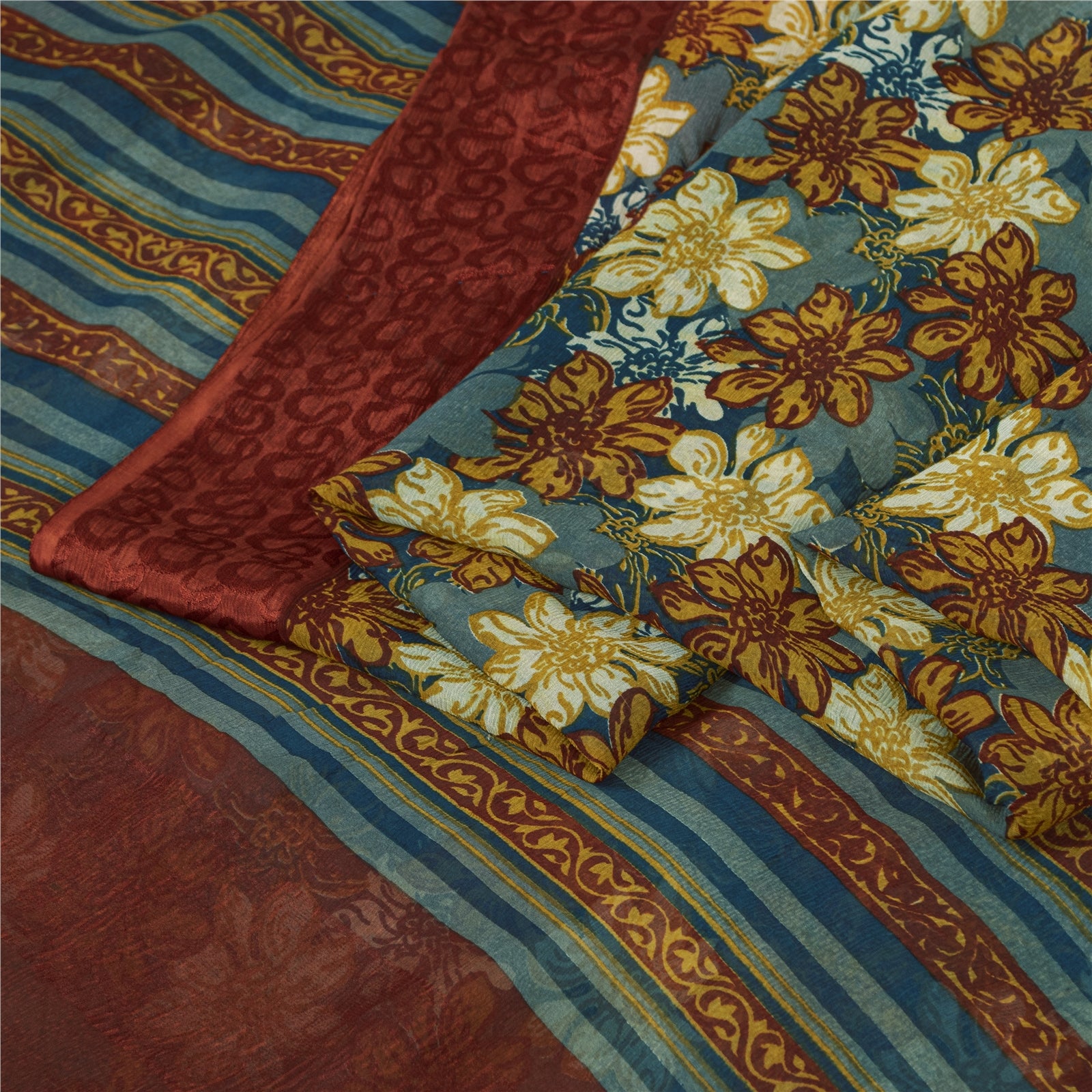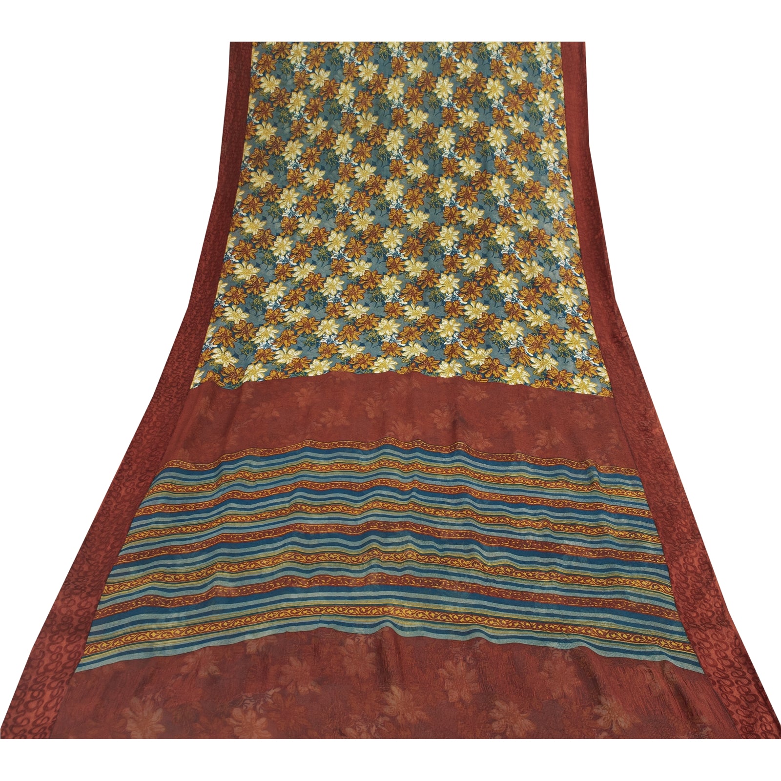 Sanskriti Vintage Sarees Blue Pure Chiffon Silk Printed Sari 6+yd Craft Fabric