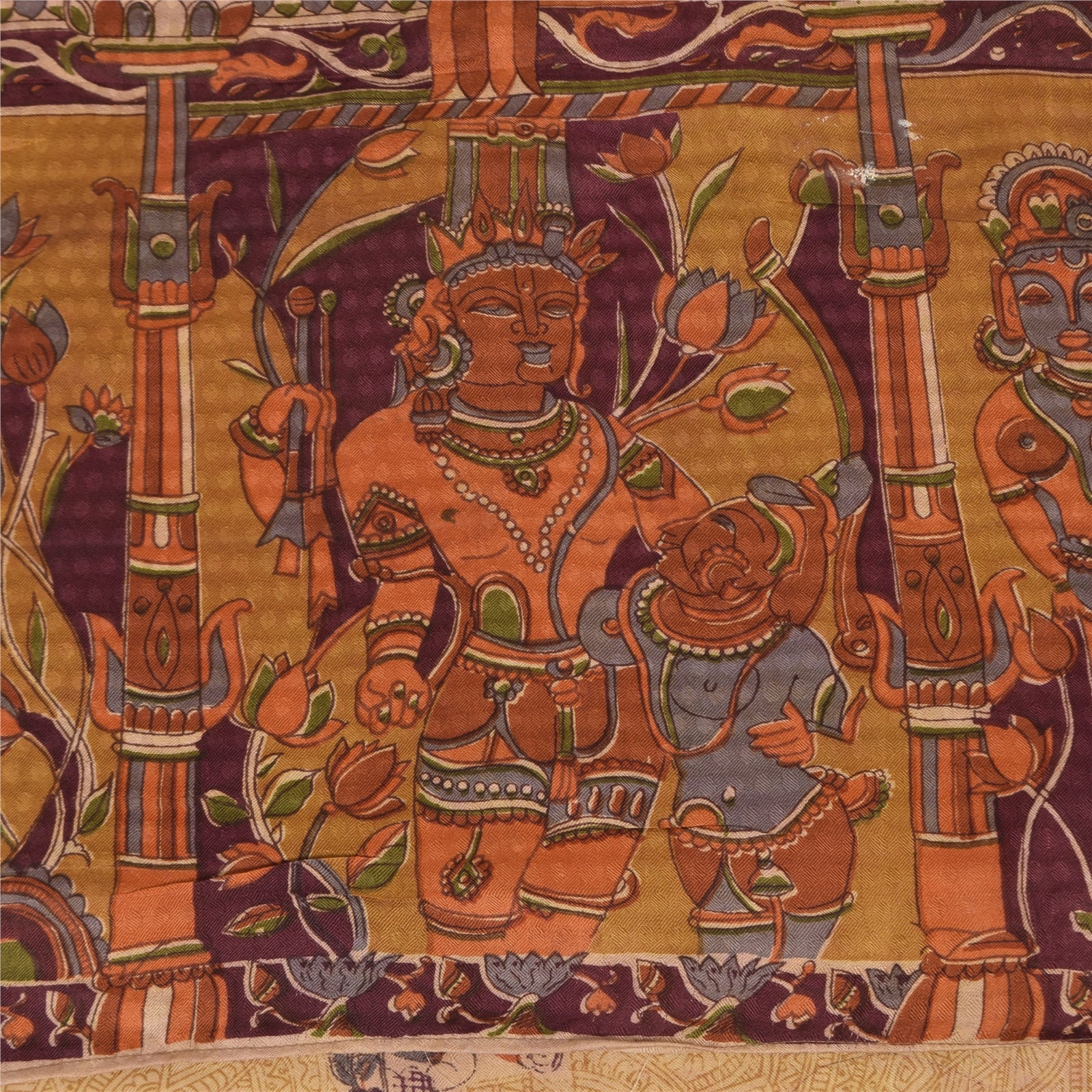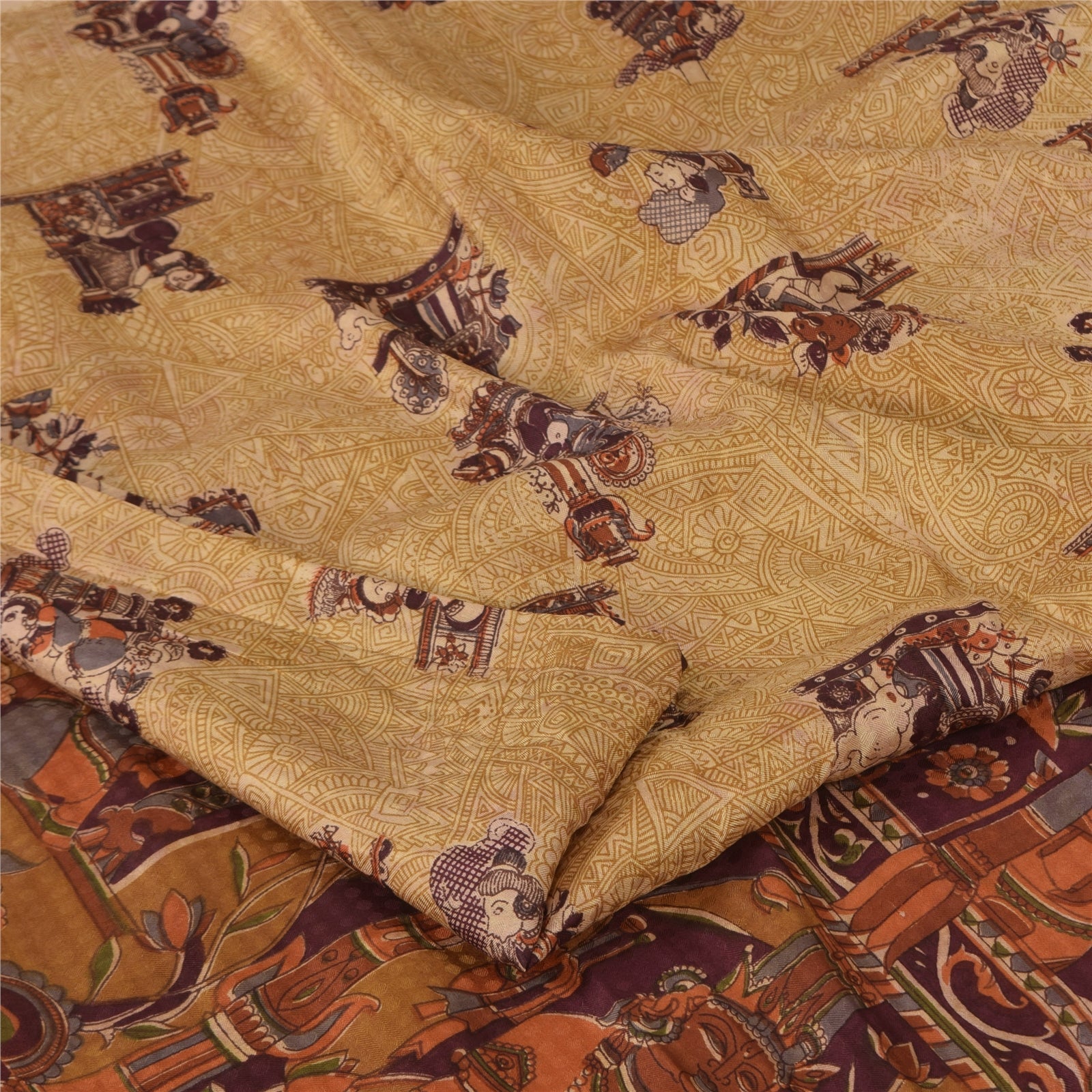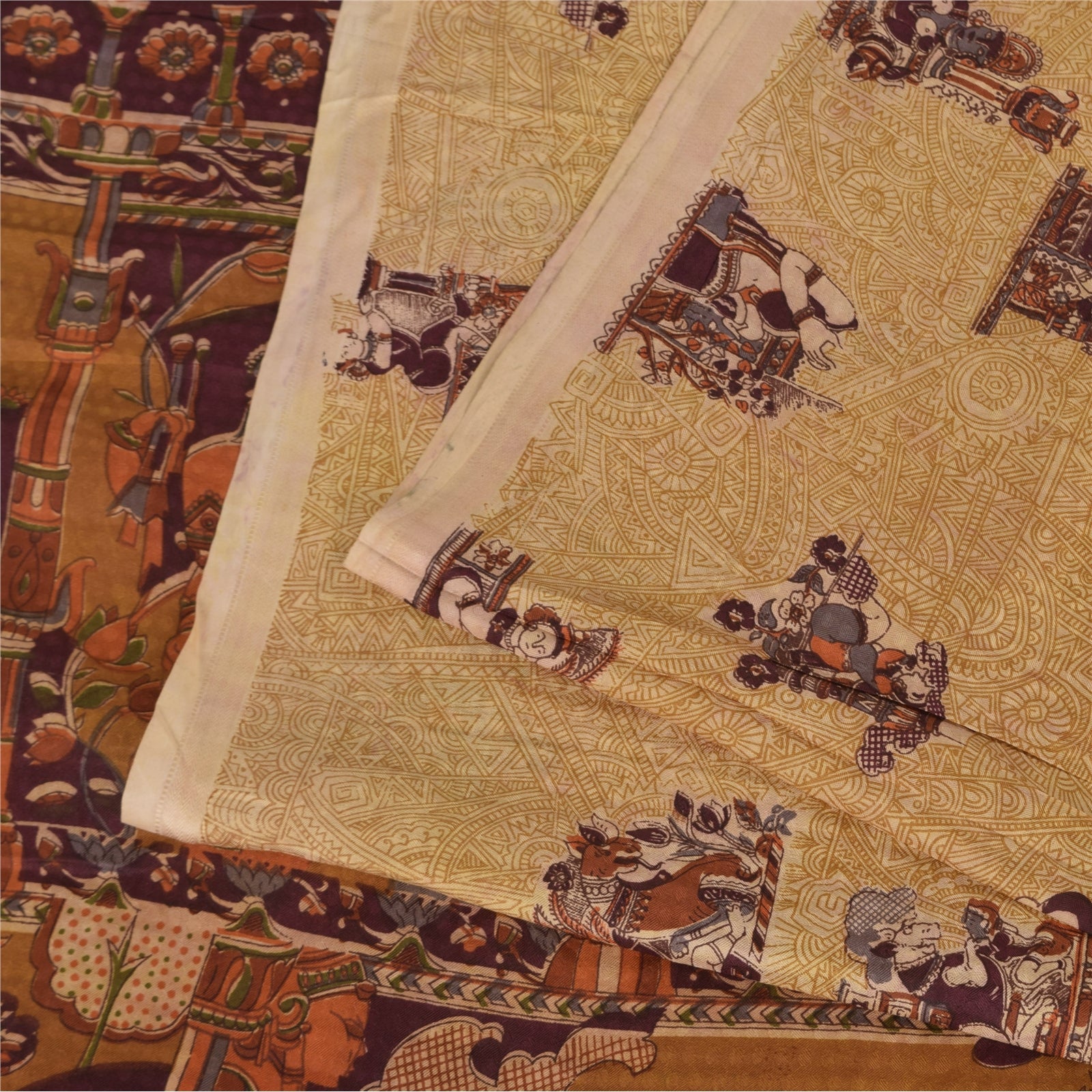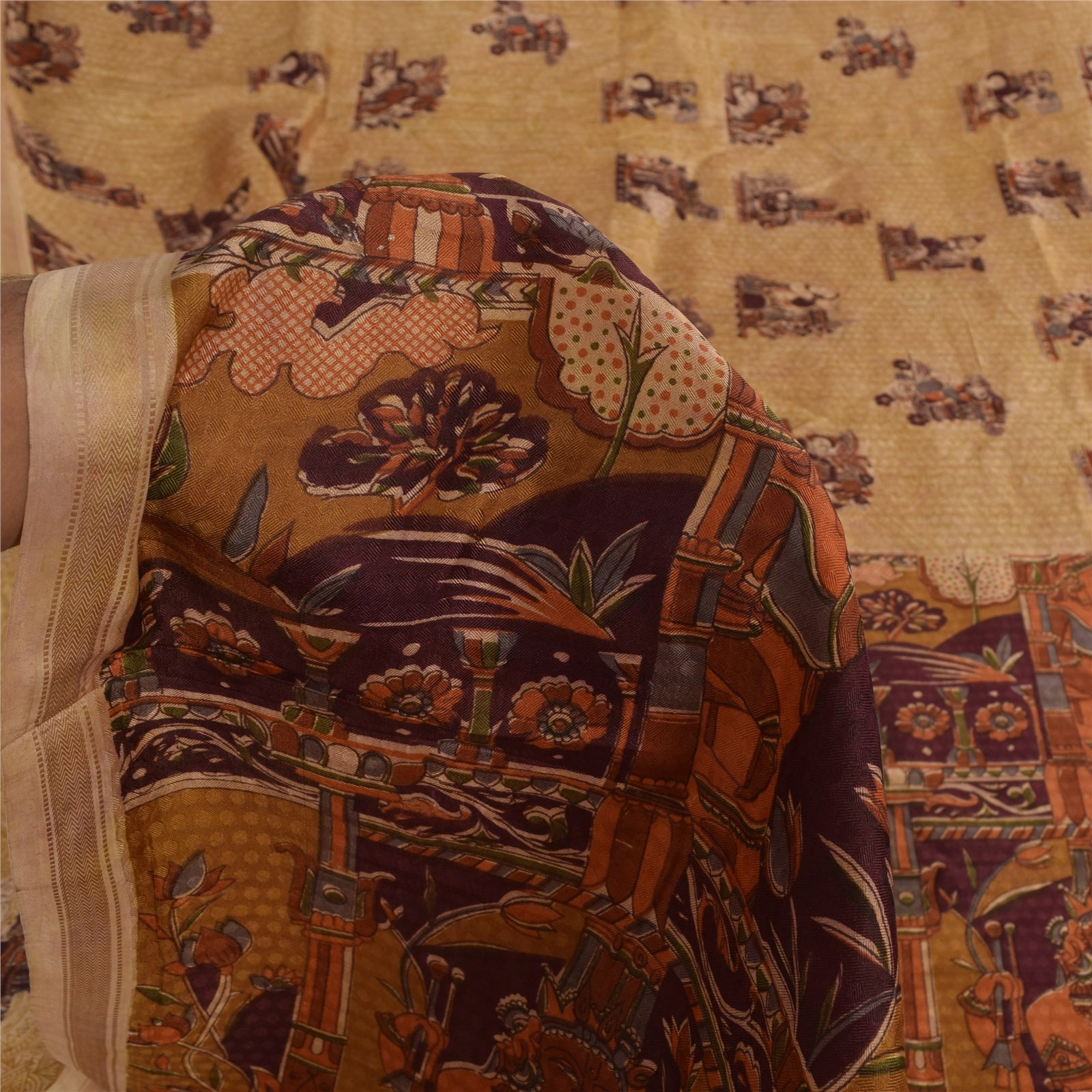 Sanskriti Vintage Sarees Cream Human Printed Pure Silk Sari 5+yd Craft Sustainable Fabric