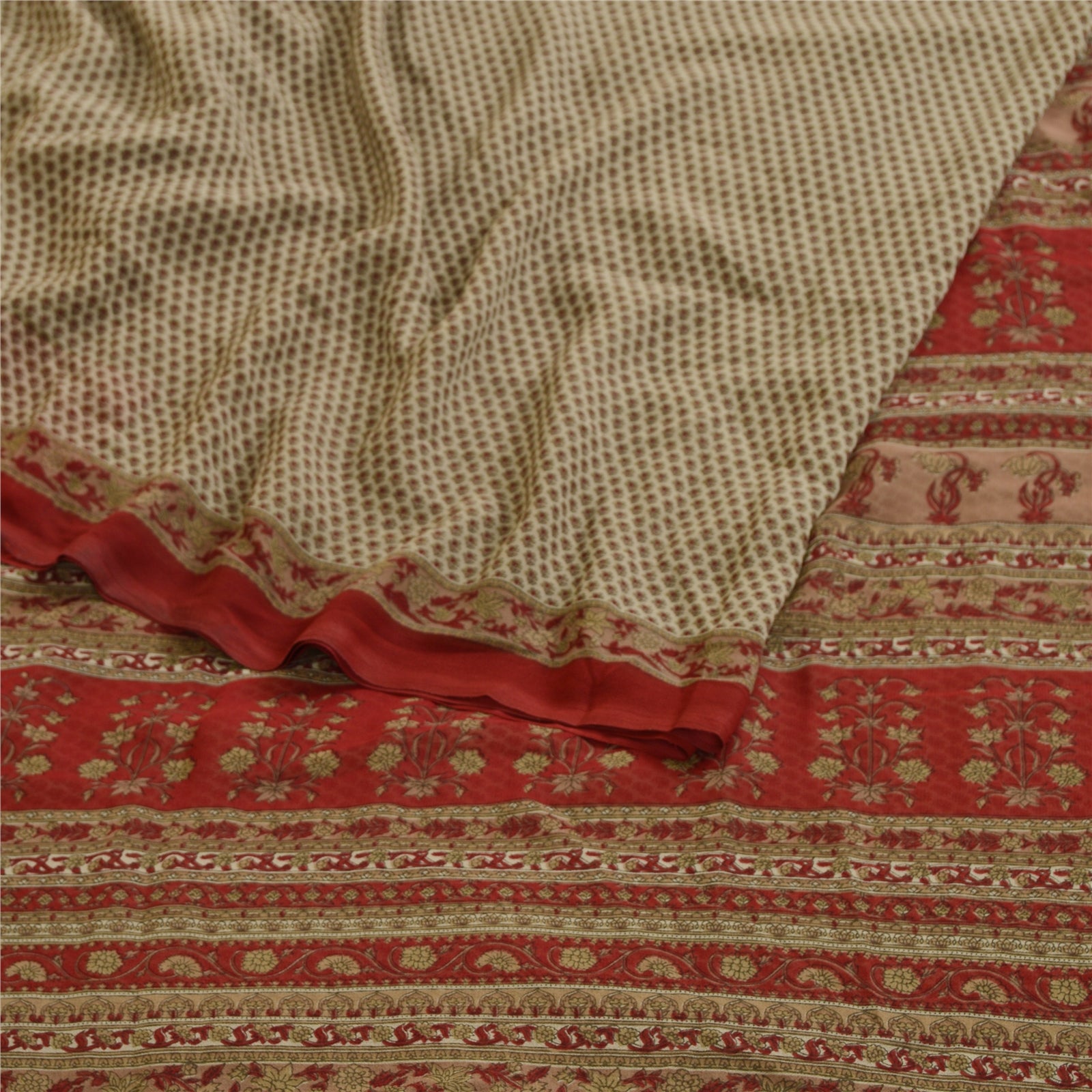 Beautiful gray colored poly georgette printed saree. Allover sari printed floral design. What is special about this saree? Brilliant design on soft Sustainable Fabric is really enhancing the beauty of the saree.This unique vintage saree can be used for various crafting ideas even if you don't want to use it as a sari. Design a dress, use it as a as window dressing, upholstery, sarongs, throw, dress making and table linen much more. Let your creative juices flow and use this decorated Sustainable Fabric in multiple fashion.