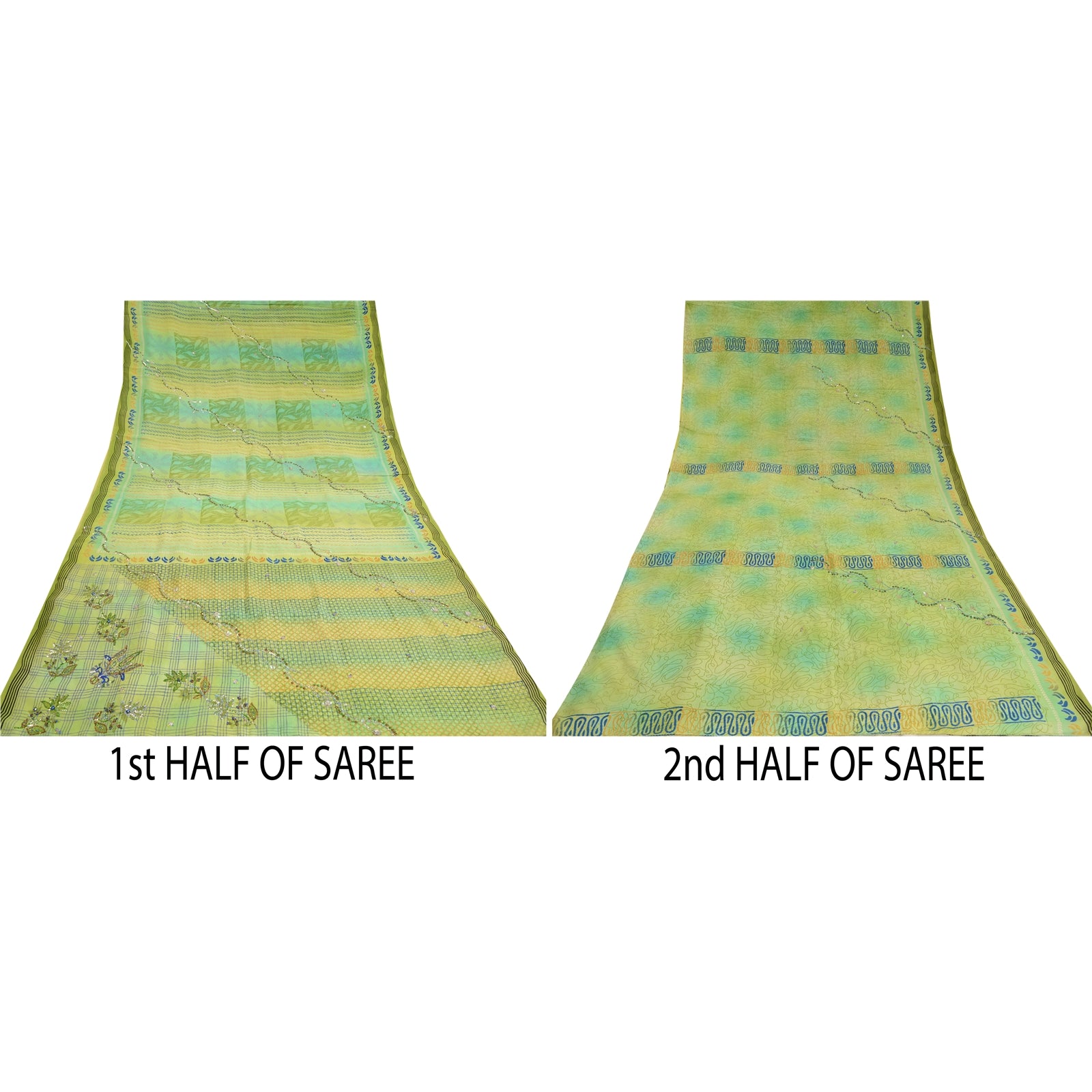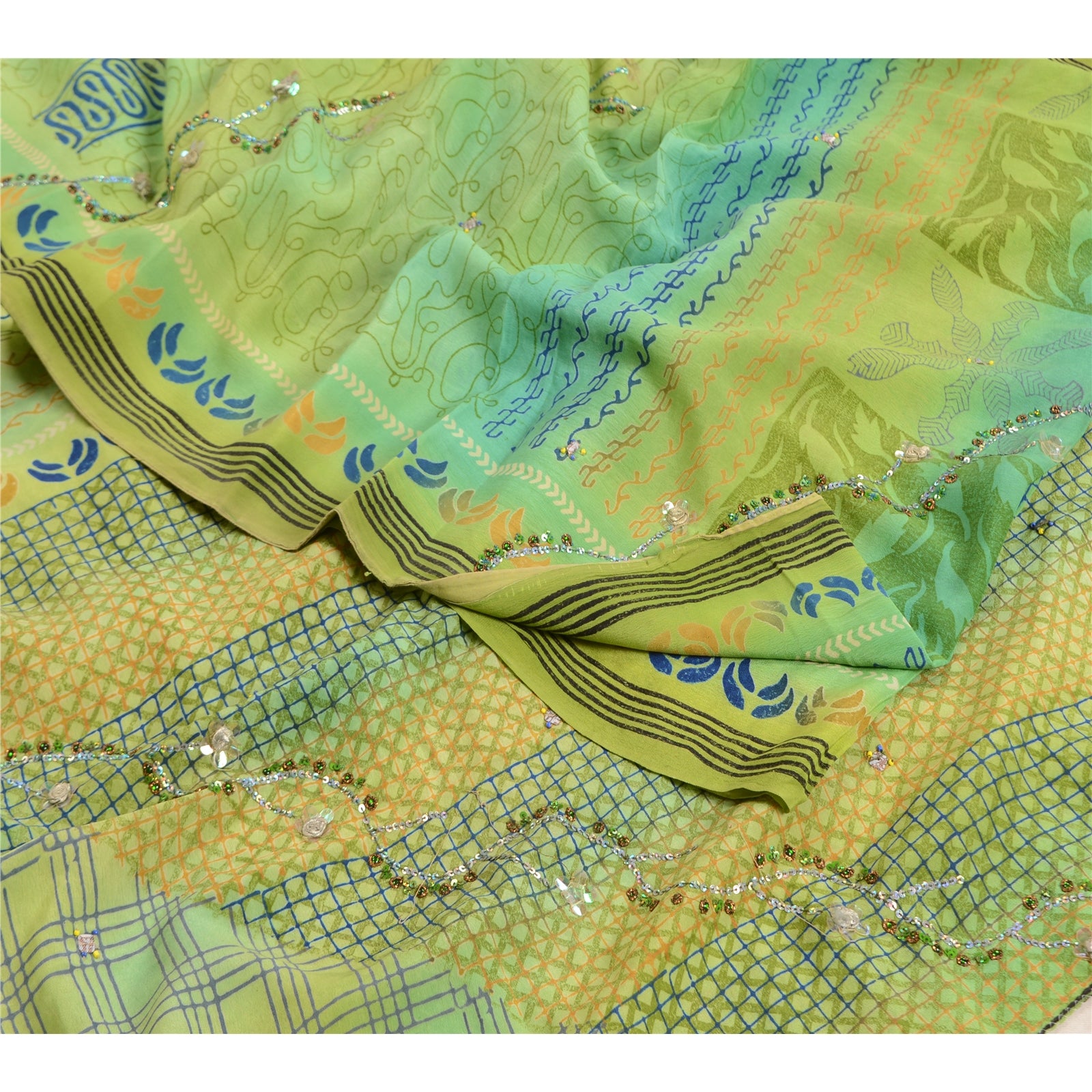 Sanskriti Vintage Sarees Green Hand Bead Pure Crepe Silk Print Sari Craft Sustainable Fabric