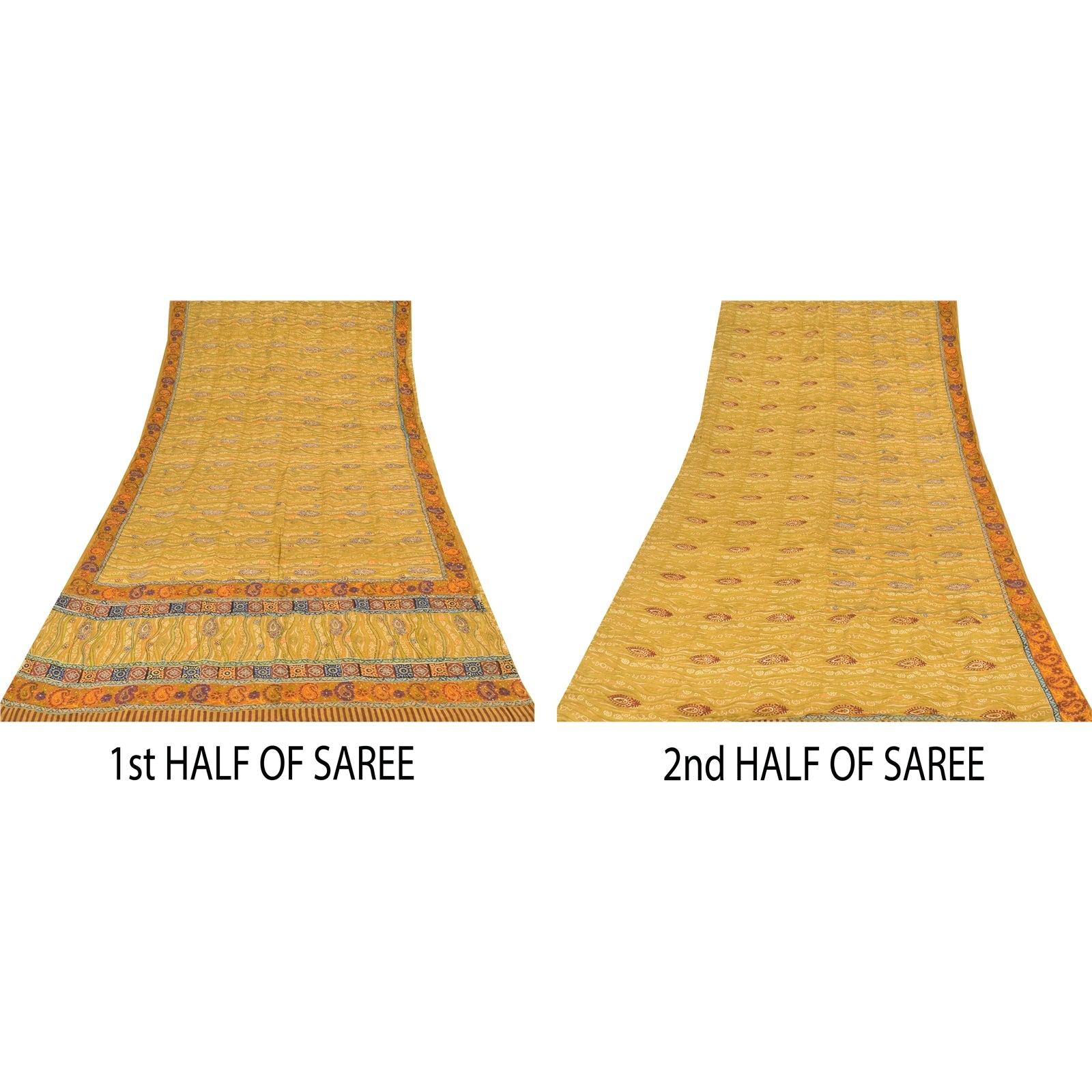 Sanskriti Vintage Sarees Green Hand Beaded Pure Crepe Silk Print Sari 5yd Sustainable Fabric