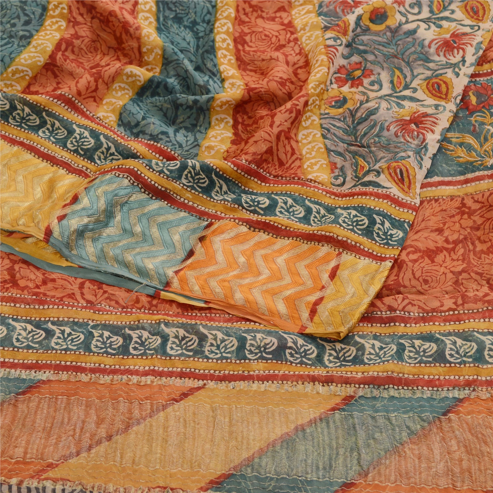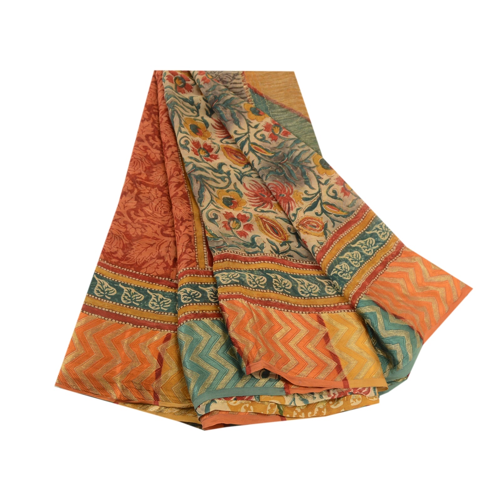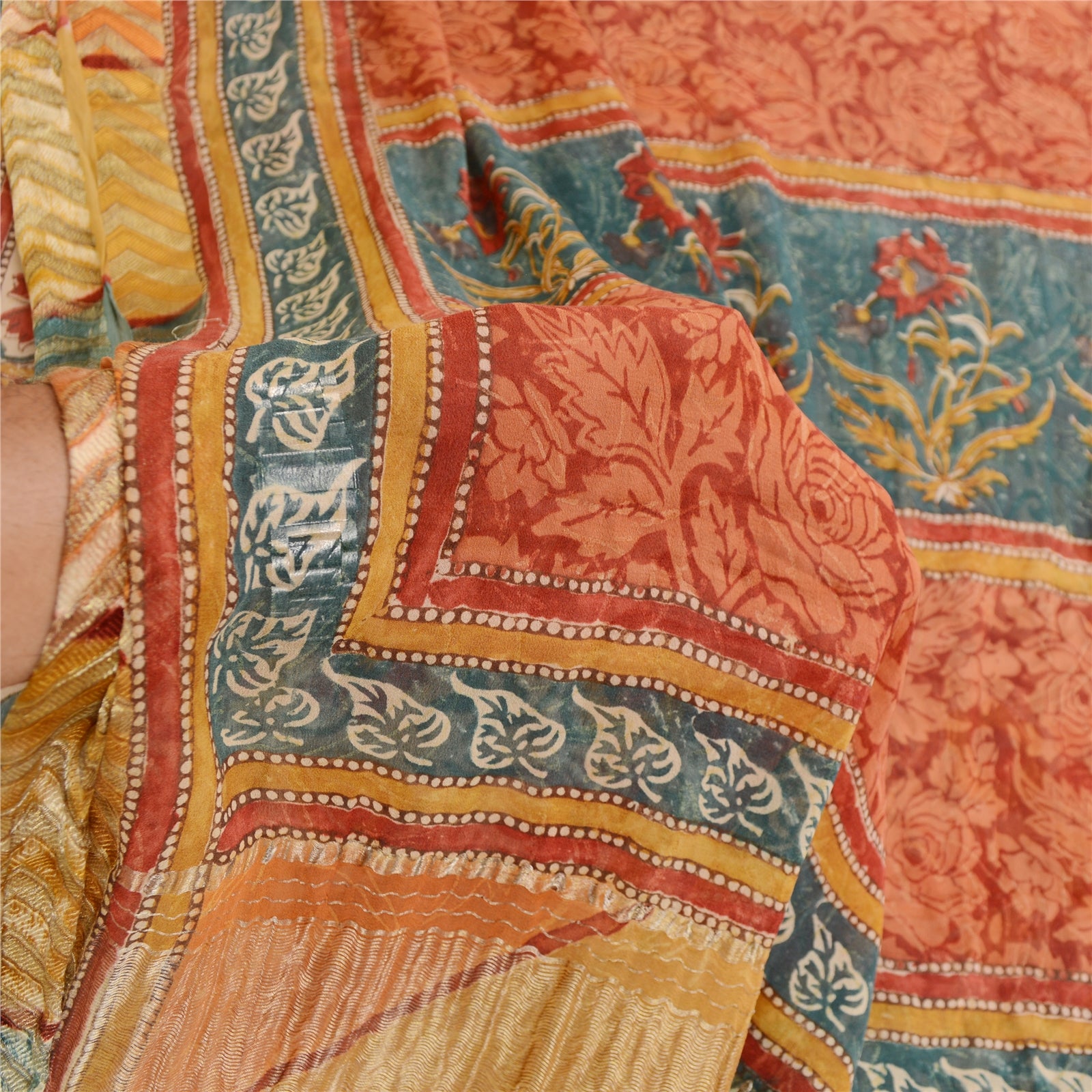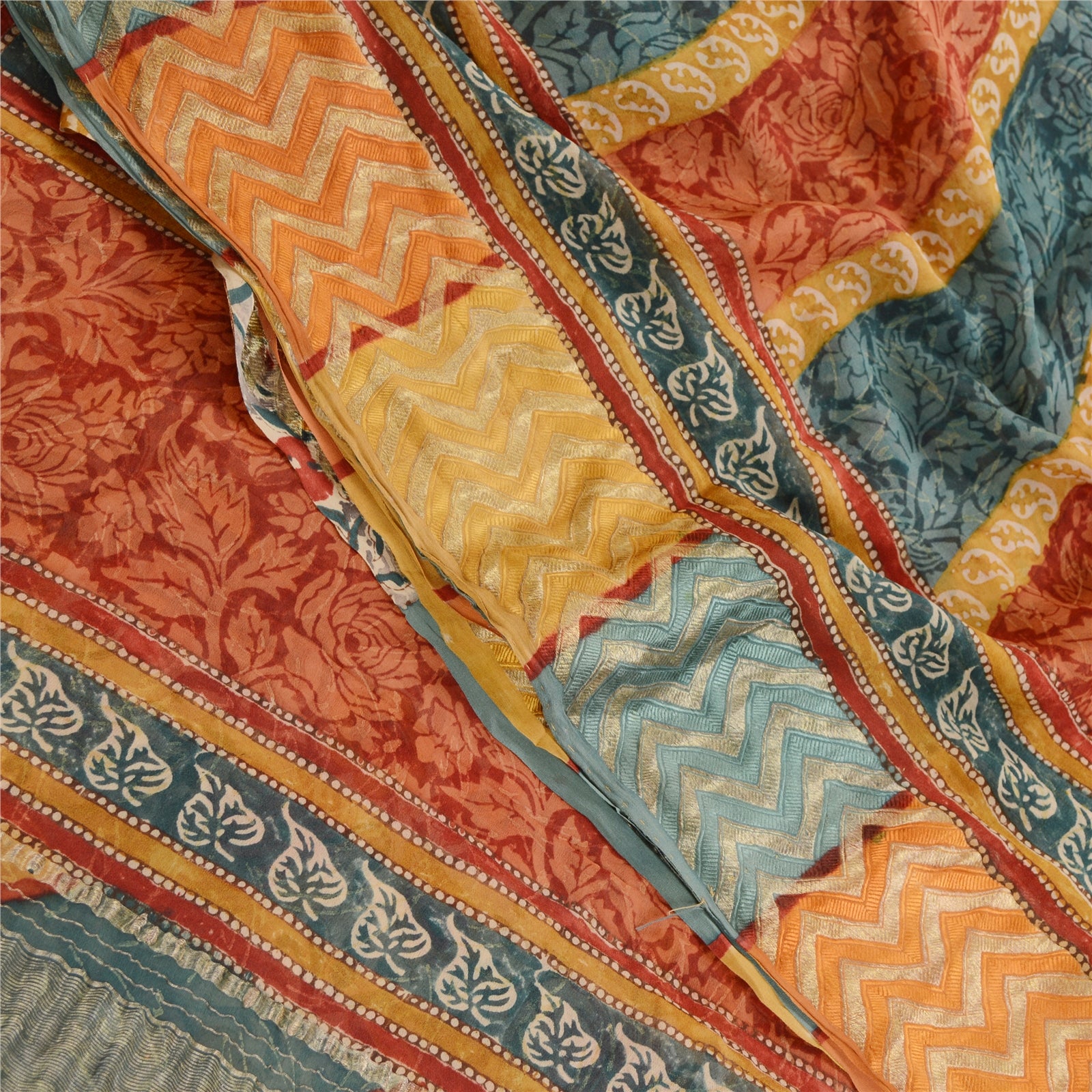 Beautiful green & orange colored pure georgette silk printed saree. Pallu & Border has printed floral design & golden zari woven work. Similar design in center part of saree. What is special about this saree? Brilliant design on soft Sustainable Fabric is really enhancing the beauty of the saree.This unique vintage saree can be used for various crafting ideas even if you don't want to use it as a sari. Design a dress, use it as a as window dressing, upholstery, sarongs, throw, dress making and table linen much more. Let your creative juices flow and use this decorated Sustainable Fabric in multiple fashion.
