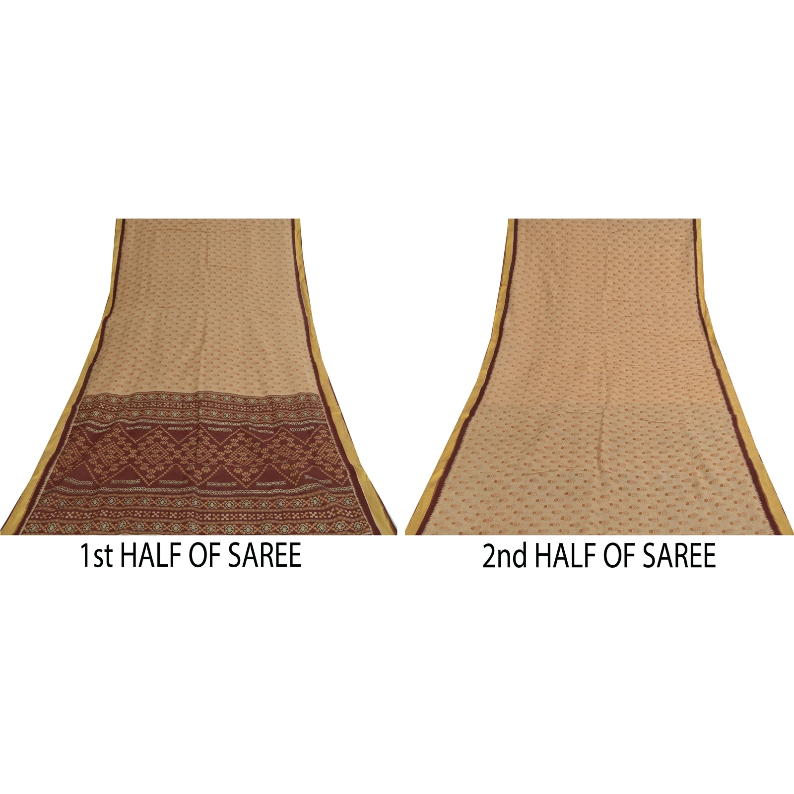 THE ITEM COLOR OR SHADE MAY BE DARKER OR LIGHTER THAN THE PICTURE. Attractive ivory colored pure cotton printed sari. Pallu & Border has printed floral design & golden woven work. Similar design in center part of saree.. This unique vintage saree can be used for various crafting ideas even if you don't want to use it as a sari. Design a dress, use it as a as window dressing, upholstery, sarongs, throw, dress making and table linen much more. Let your creative juices flow and use this decorated fabric in multiple fashion. Shipping Note: 'International buyers please note: Import duties, taxes, and charges are not included in the item price or postage cost. These charges are the buyer's responsibility. Please check with your country's customs office to determine what these additional costs will be prior to bidding or buying. Buyer will pay custom duty/tax. It is calculated and charged differently by every country. As a seller I do not have any control over it. VAT or sales tax is calculated by the platform at the time of checkout. Customs charge is payable at the time of delivery.' PCS-6846