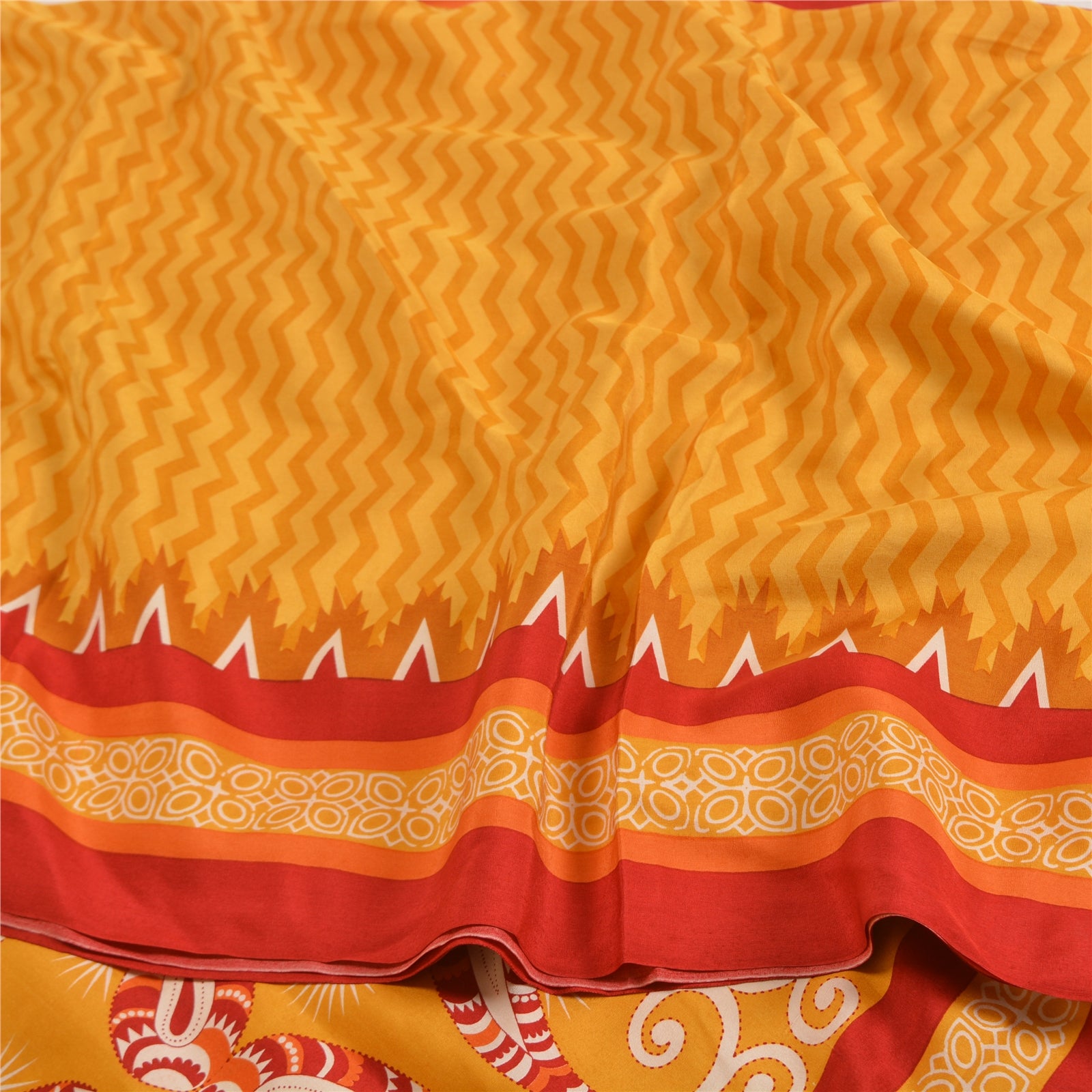 THE ITEM COLOR OR SHADE MAY BE DARKER OR LIGHTER THAN THE PICTURE.' Beautiful yellow colored pure crepe silk printed saree. Pallu & border has printed floral & geometric design. Floral & zig-zag design in center part of saree. What is special about this saree? Fabulous design is really enhancing the beauty of the saree. This unique vintage saree can be used for various crafting ideas even if you don't want to use it as a sari. Design a dress, use it as window,dressing, upholstery, sarongs, throw, dress making and table linen much more. Let your creative juices flow and use this decorated Sustainable Fabric in multiple fashion. International buyers please note: Import duties, taxes, and charges are not included in the item price or postage cost. These charges are the buyer's responsibility. Please check with your country's customs office to determine what these additional costs will be prior to bidding or buying.Buyer will pay custom duty/tax. It is calculated and charged differently by every country. As a seller I do not have any control over it.VAT or sales tax is calculated by the platform at the time of checkout. Customs charge is payable at the time of delivery.