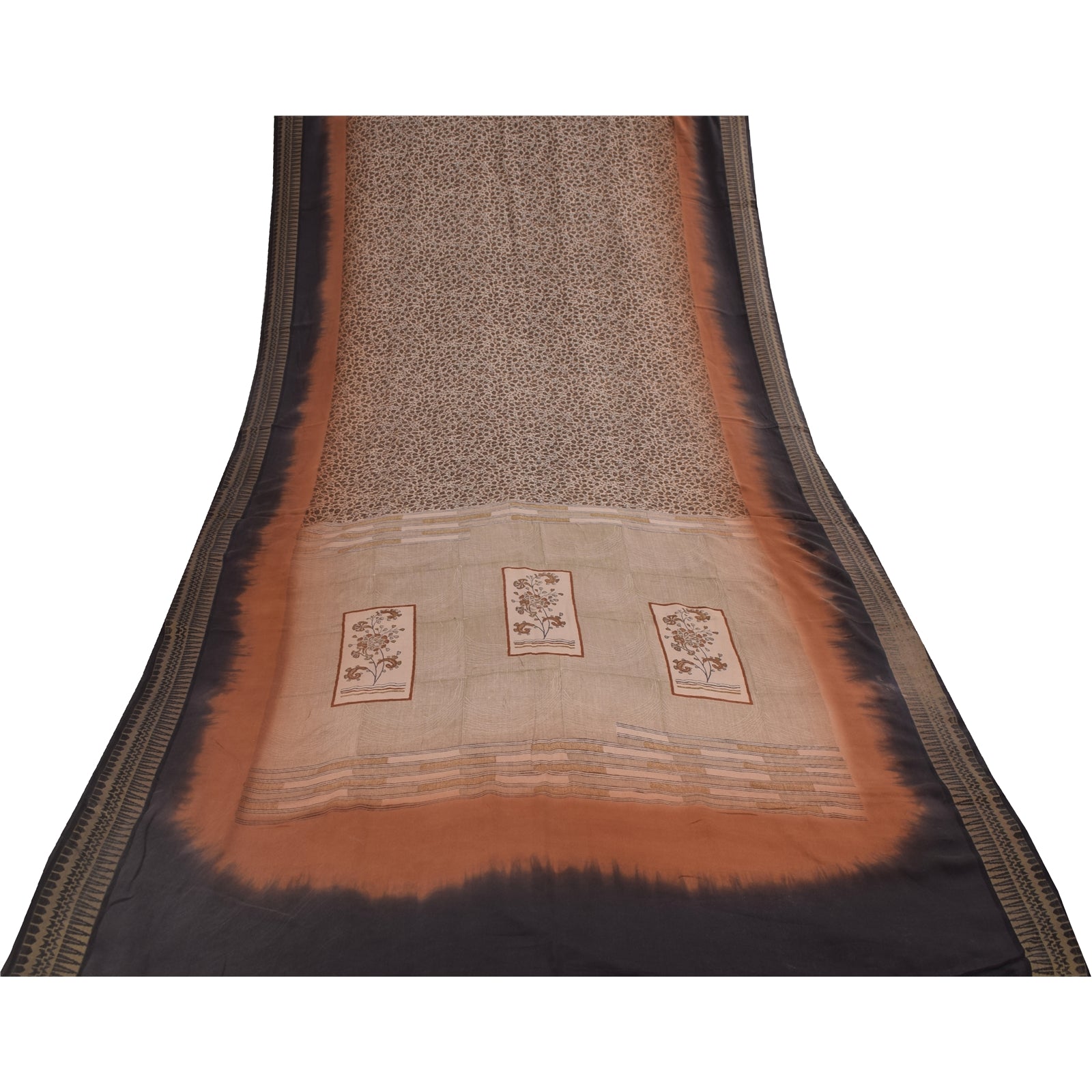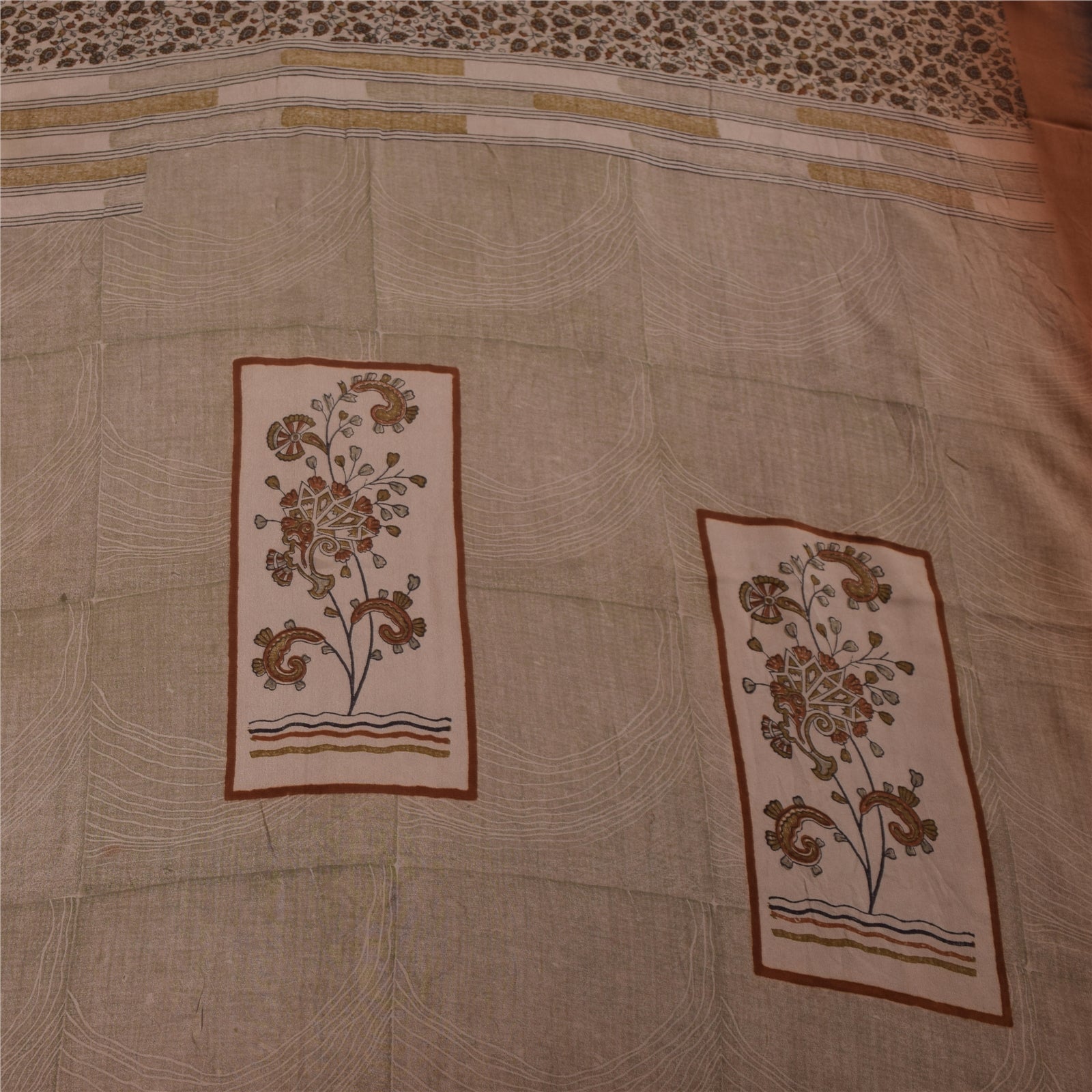 Sanskriti Vintage Sarees Ivory Pure Crepe Silk Printed Sari 5+yd Craft Fabric