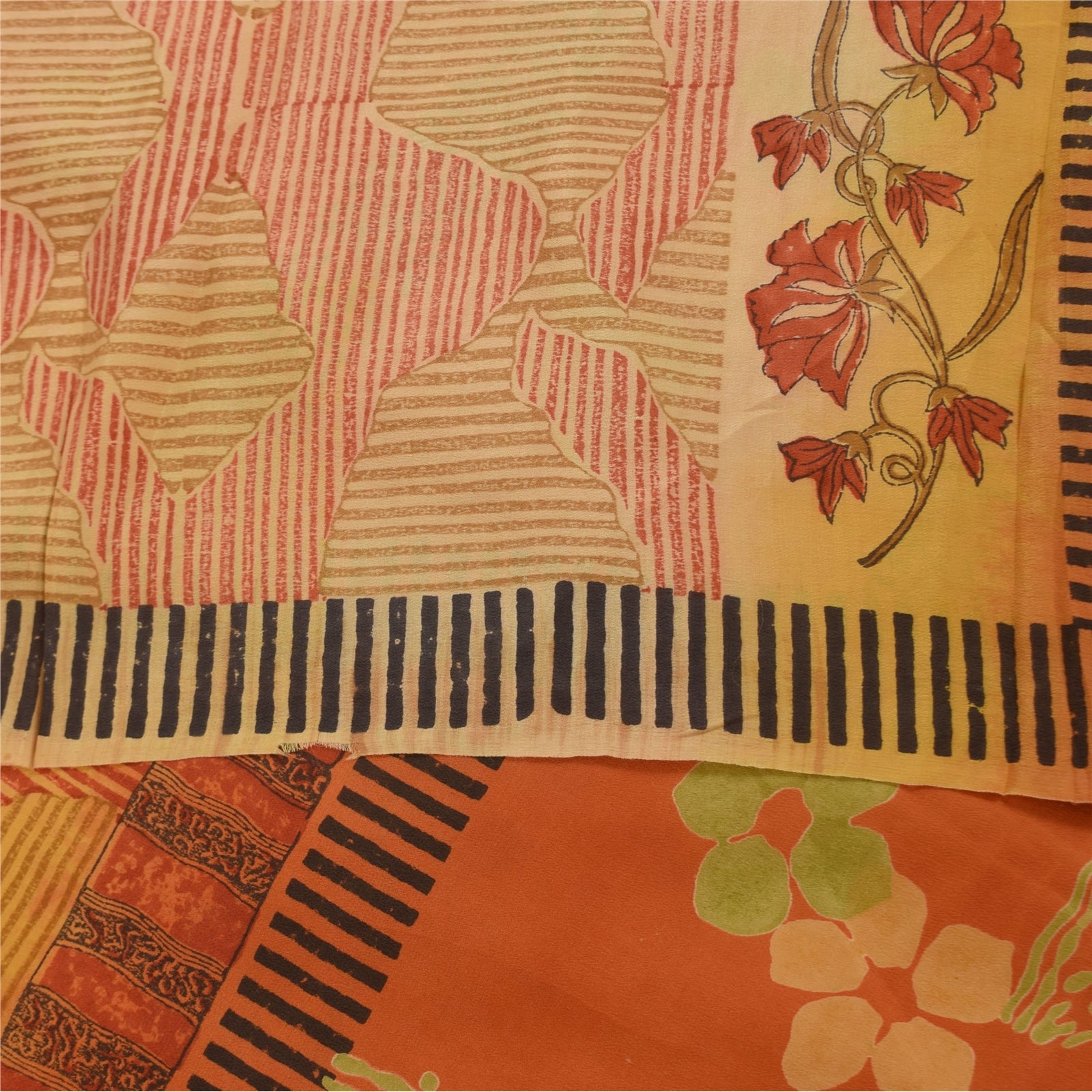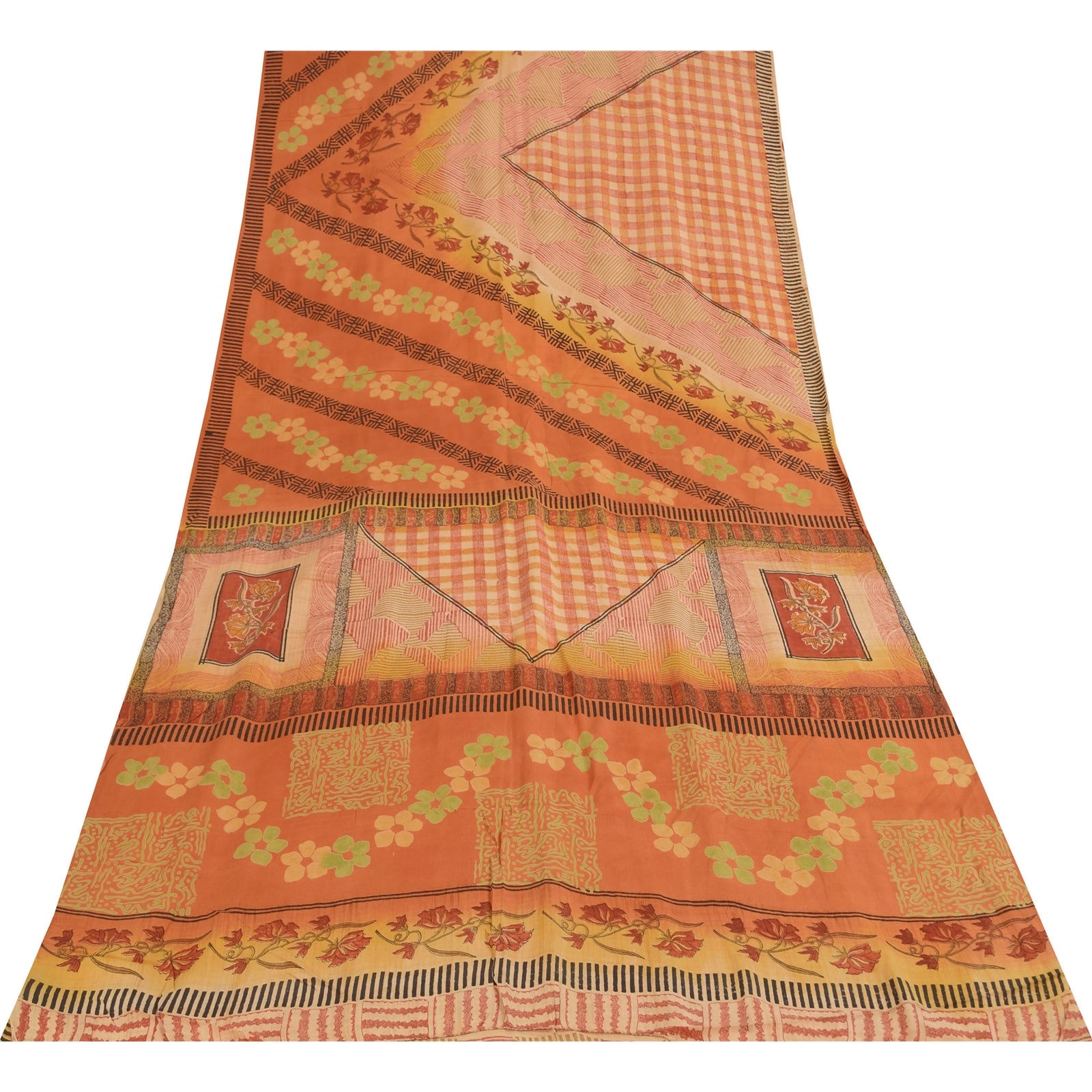 Sanskriti Vintage Sarees Orange Pure Crepe Silk Printed Sari 5+yd Craft Sustainable Fabric