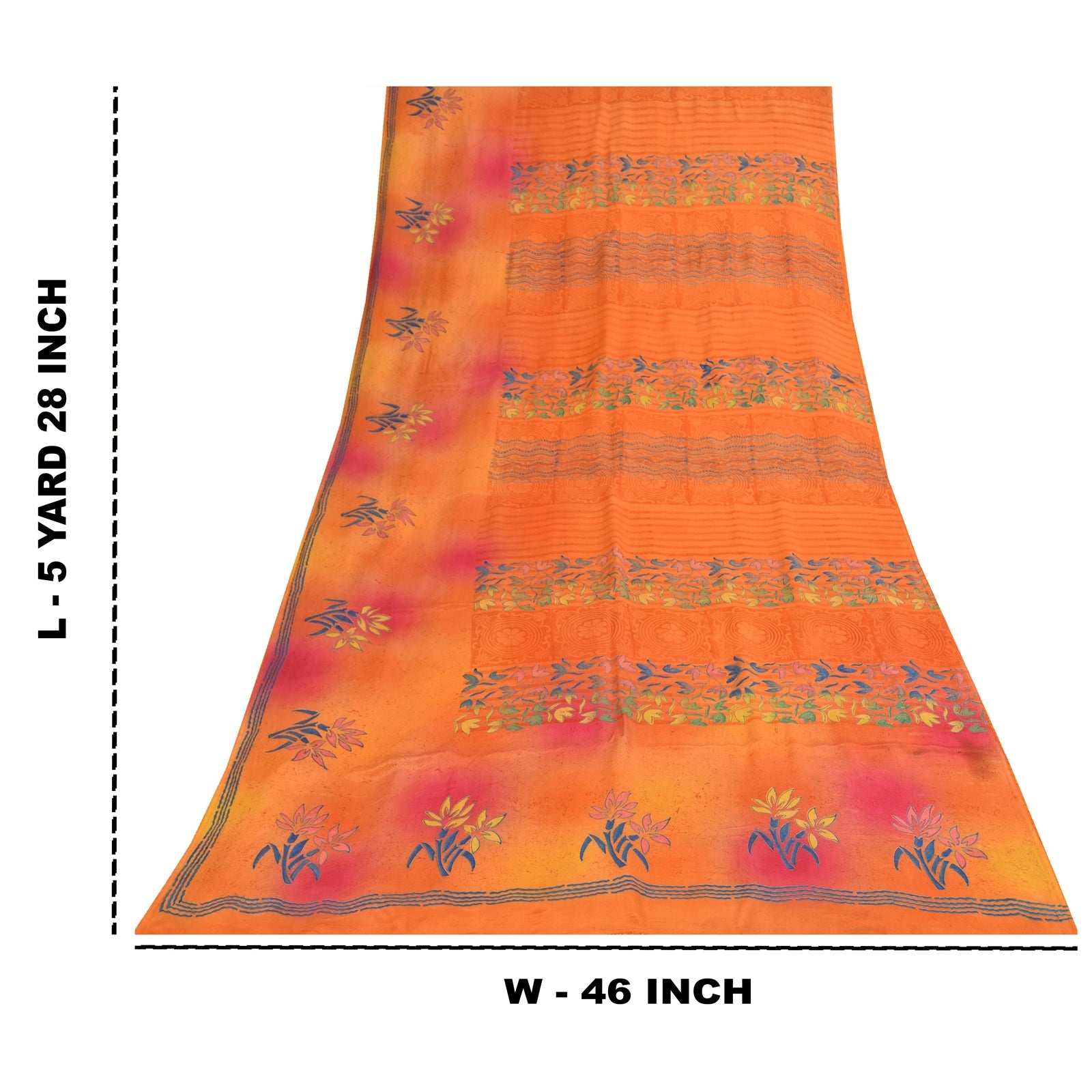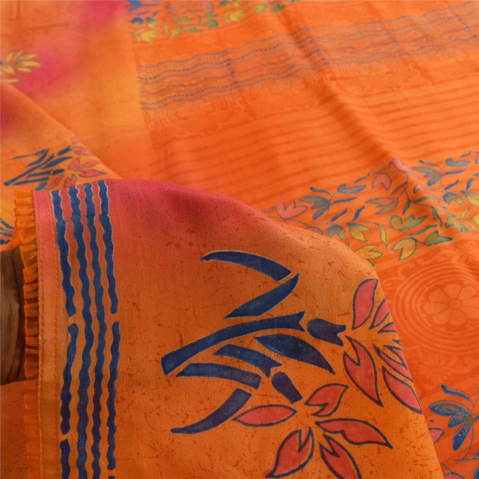 Sanskriti Vintage Sarees Orange Pure Crepe Silk Printed Sari 5+yd Craft Fabric
