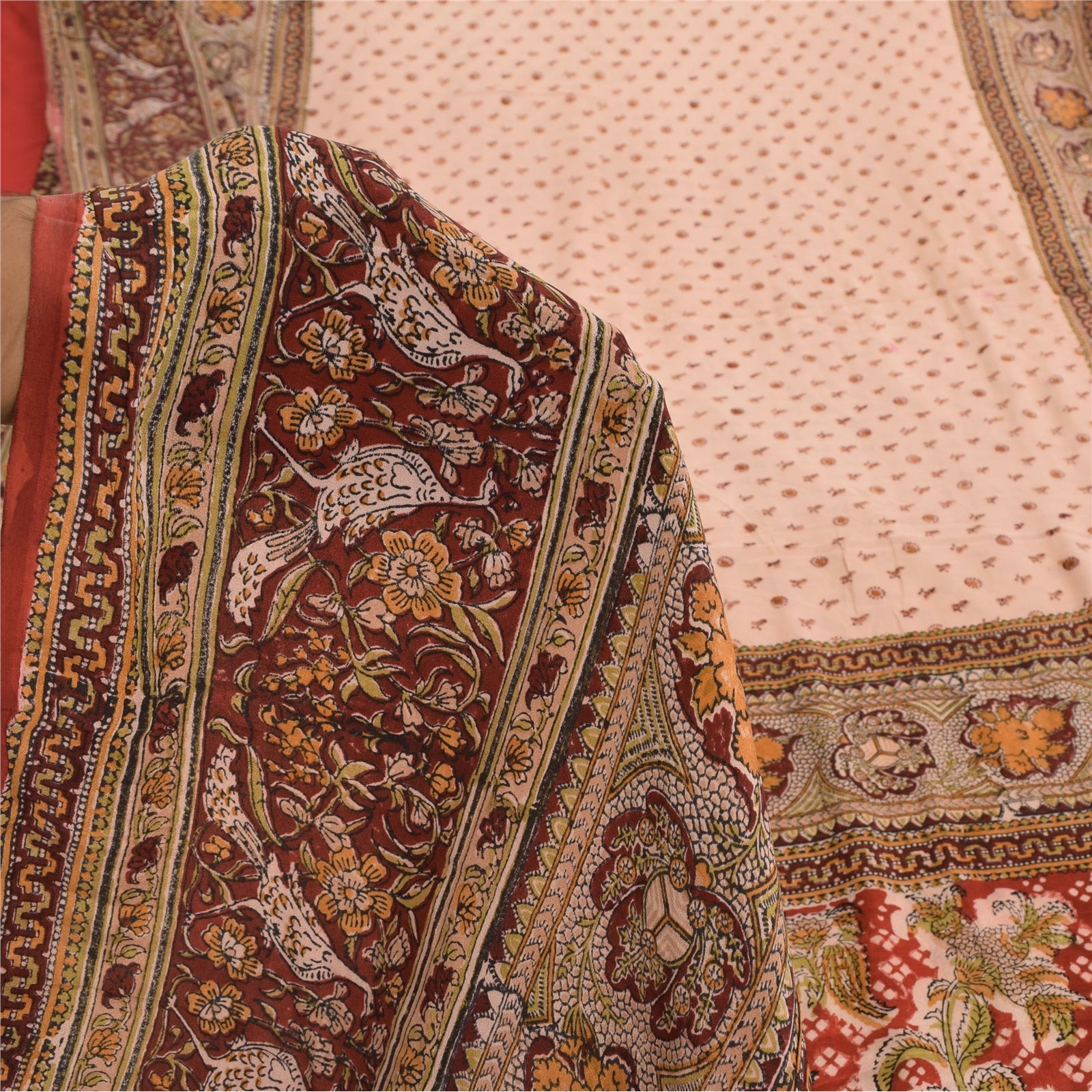 THE ITEM COLOR OR SHADE MAY BE DARKER OR LIGHTER THAN THE PICTURE.' • Beautiful peach colored hand block printed pure crepe silk saree . • Pallu & Border has printed floral design. • Similar design in center part of sari . This unique vintage saree can be used for various crafting ideas even if you don't want to use it as a sari. Design a dress, use it as a as window dressing, upholstery, sarongs, throw, dress making and table linen much more. Let your creative juices flow and use this decorated Sustainable Fabric in multiple fashion. International buyers please note: Import duties, taxes, and charges are not included in the item price or postage cost. These charges are the buyer's responsibility. Please check with your country's customs office to determine what these additional costs will be prior to bidding or buying.Buyer will pay custom duty/tax. It is calculated and charged differently by every country. As a seller I do not have any control over it. VAT or sales tax is calculated by the platform at the time of checkout. Customs charge is payable at the time of delivery. PRC-22902
