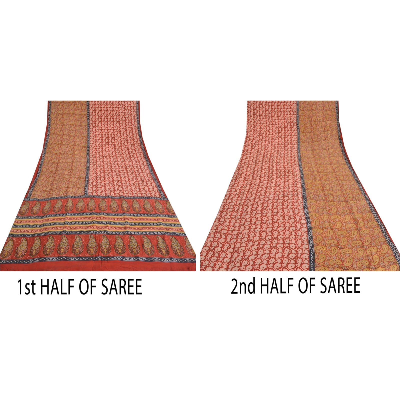 Sanskriti Vintage Sarees Red 100% Pure Crepe Silk Printed Sari 5yd Craft Sustainable Fabric