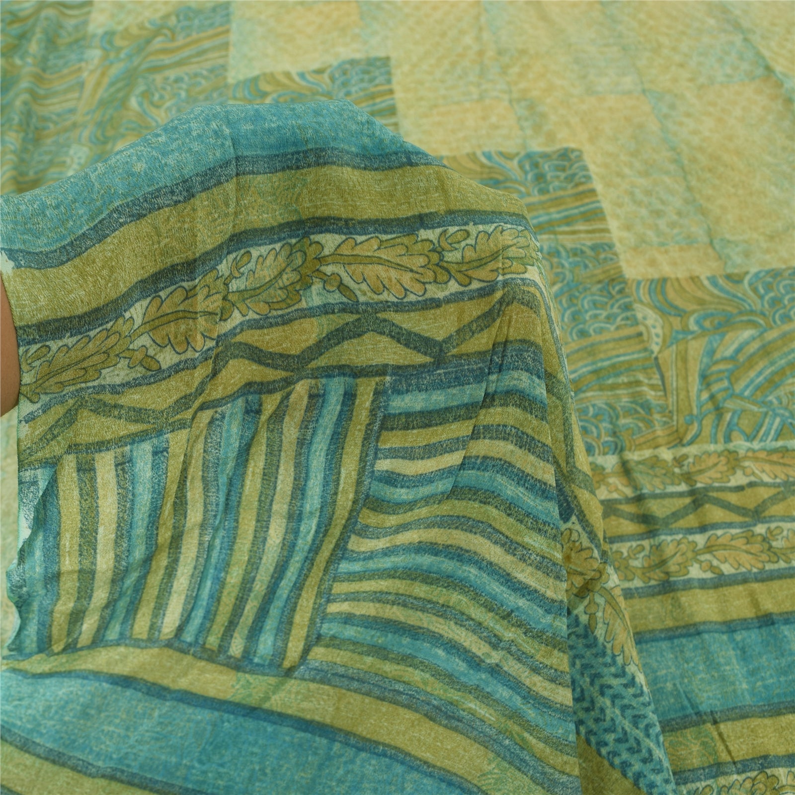 Sanskriti Vintage Sarees Yellow/Green Pure Crepe Silk Printed Sari 5yd Sustainable Fabric