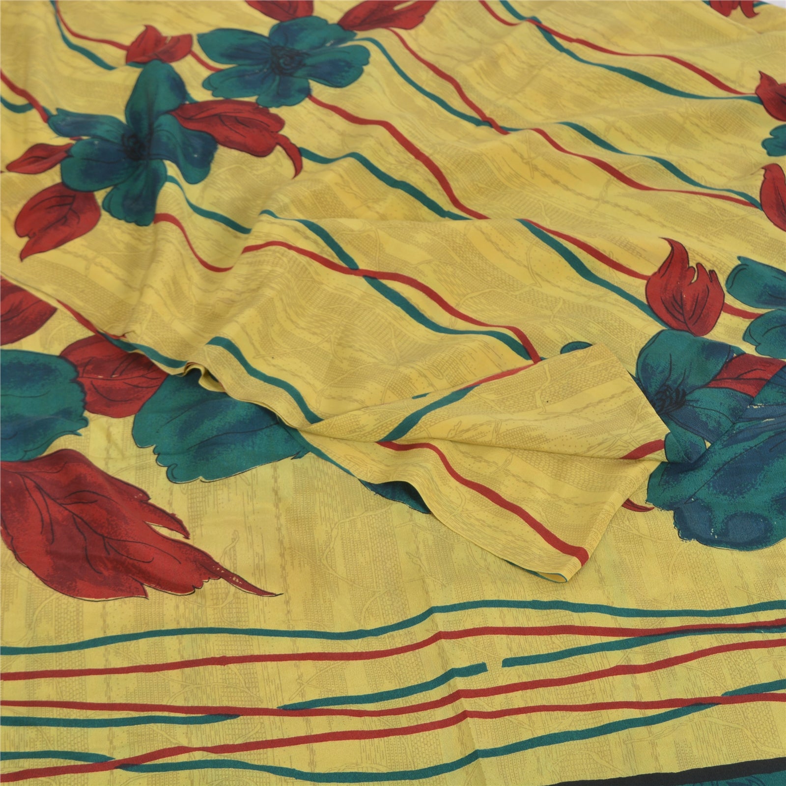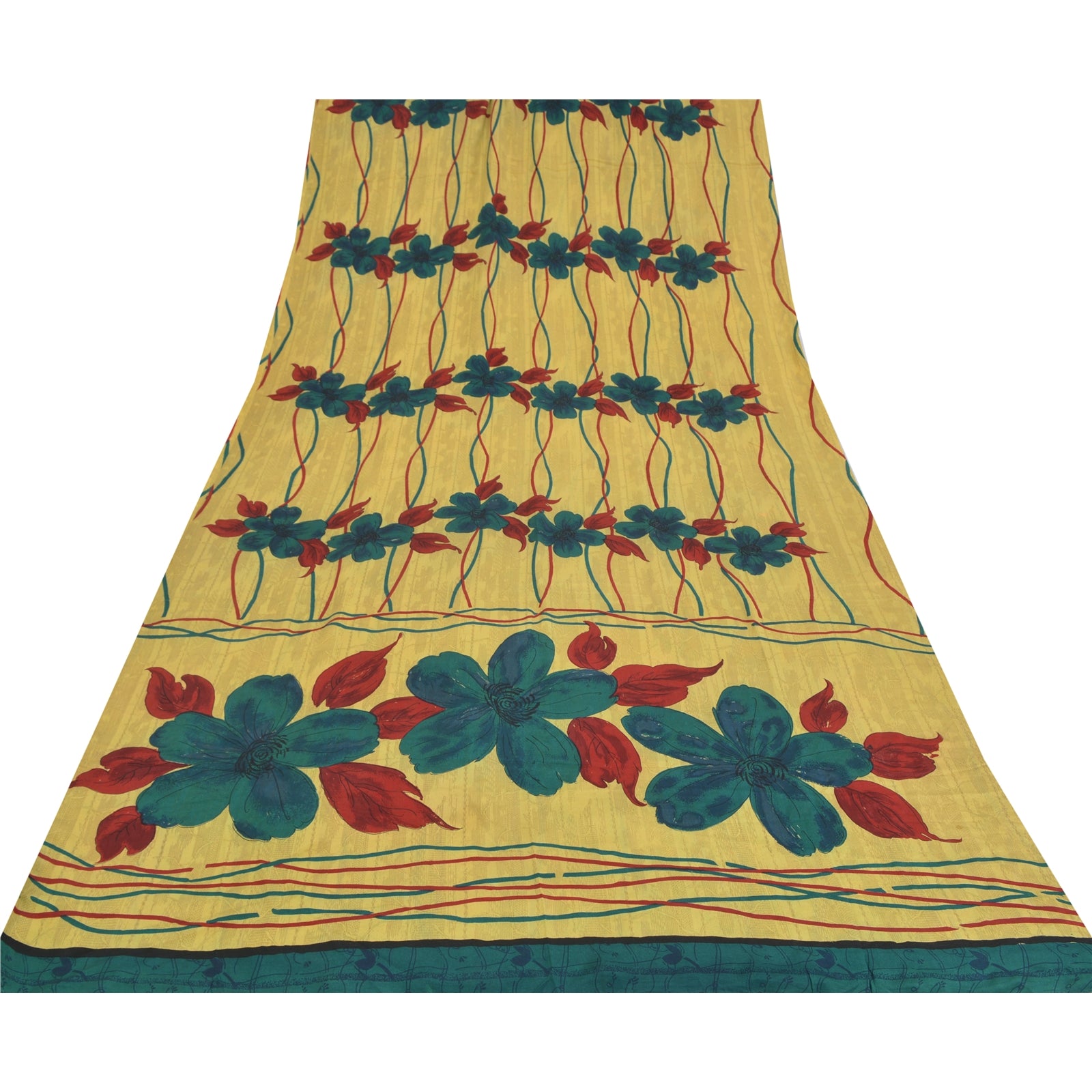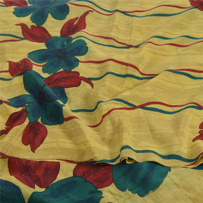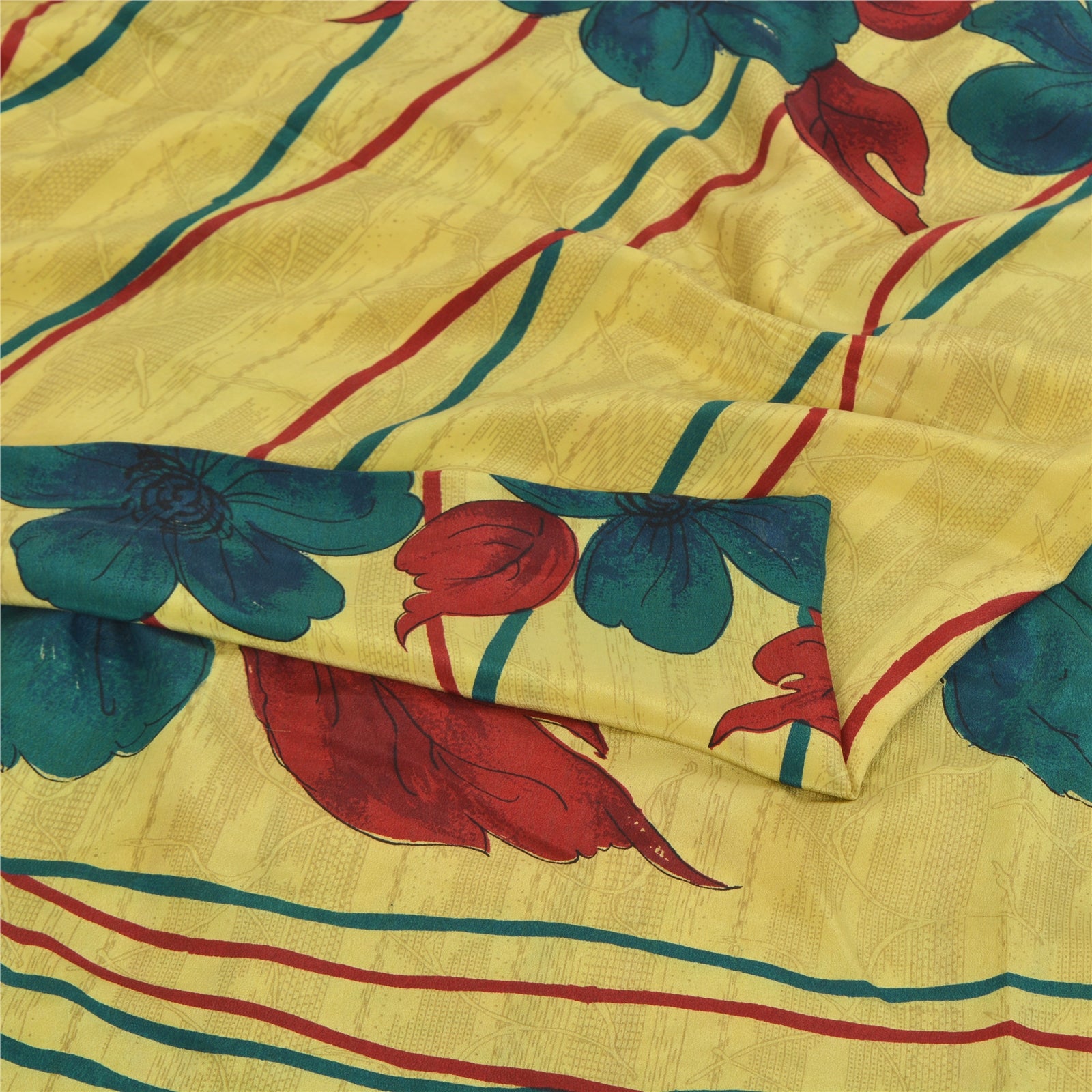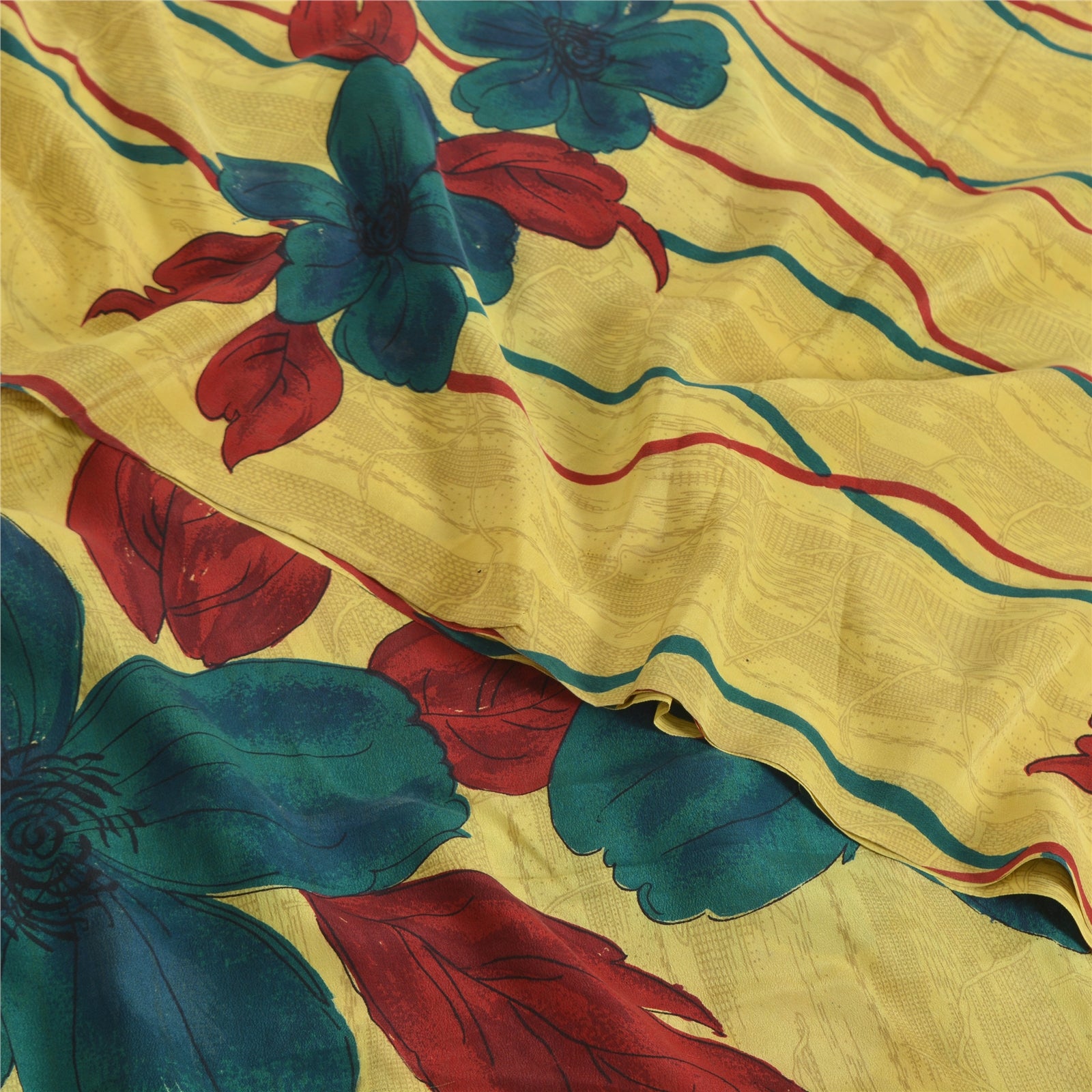 Sanskriti Vintage Sarees Yellow Pure Crepe Silk Printed Sari 5yd Craft Sustainable Fabric